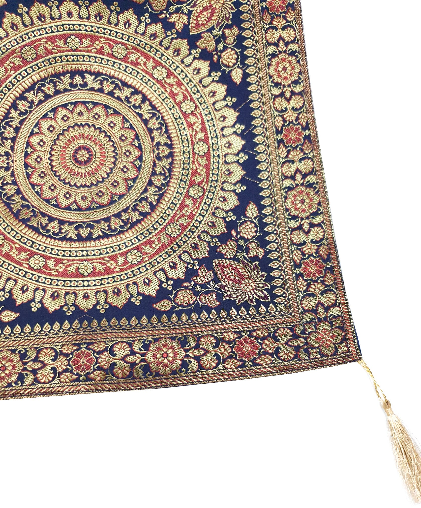 Banarasi Vastra Presents 16 Inch x 72 Inch Woven Golden Zari Brocade Banarasi Silk Table Runner with Woven Mandala Pattern Tanchoi Fabric in the center Part of the cover with all Side Floral Zari Woven Border with 4 side Golden Zari Tassel. this Runner comes with Matching color Back lining fabric.