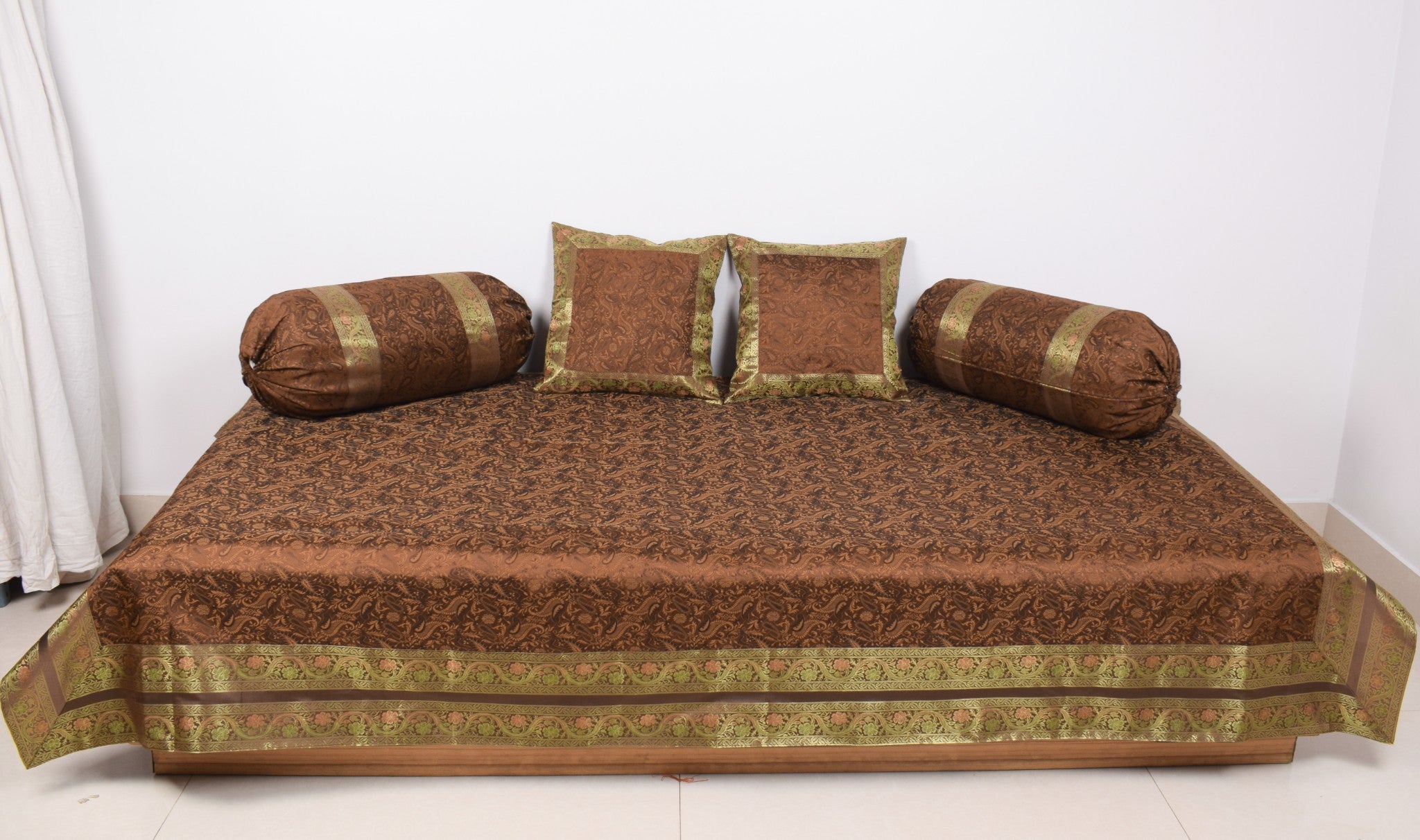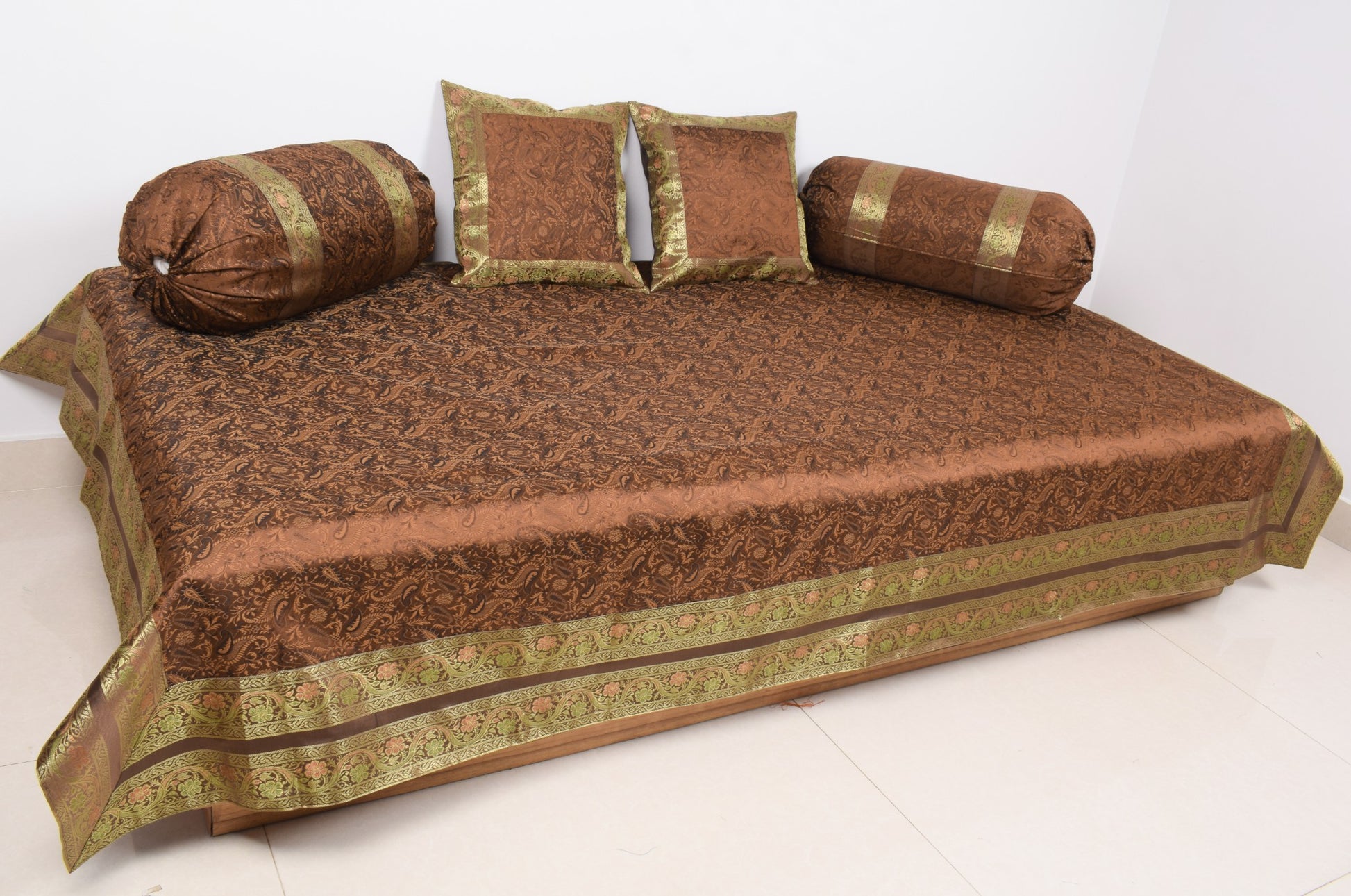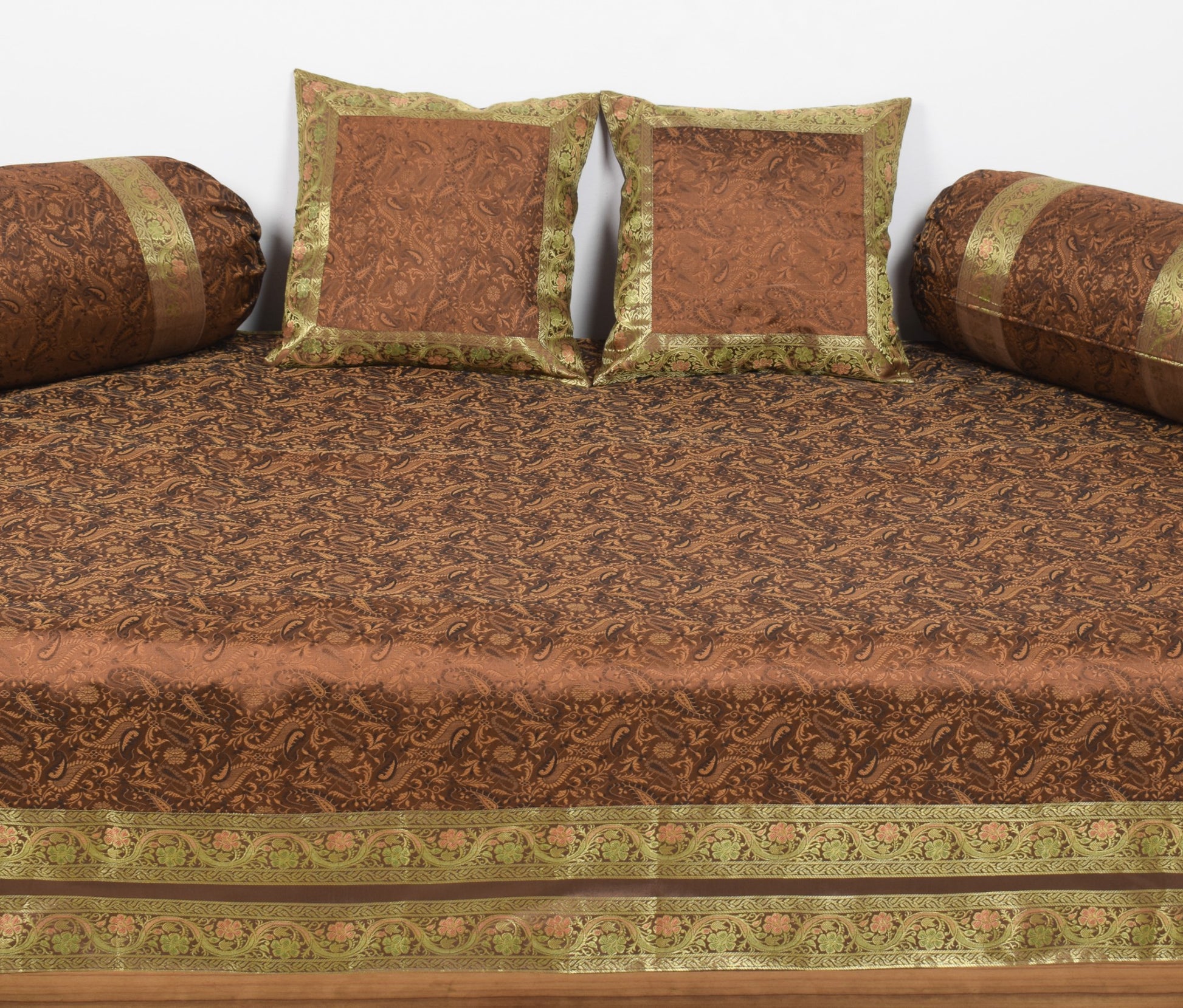 Dark Brown Banarasi Diwan Set Silk Zari Brocade Gift Cushion & Bolster Cover