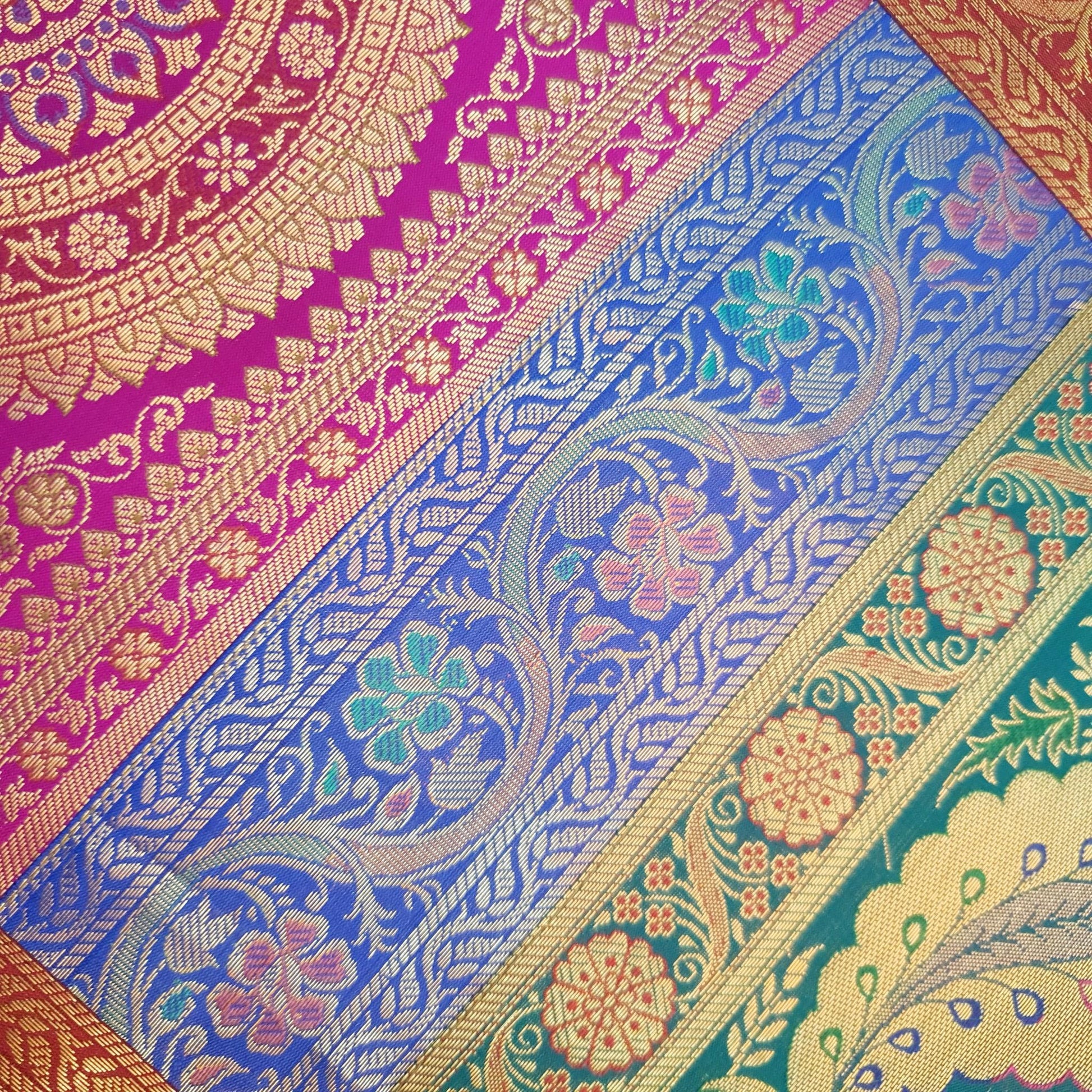 Step into a world of timeless elegance with our exquisite Woven Zari Brocade Banarasi Fabric Table Runner or Wall Tapestry. Crafted with meticulous attention to detail, this piece effortlessly blends tradition with contemporary style, adding a touch of opulence to any space.
