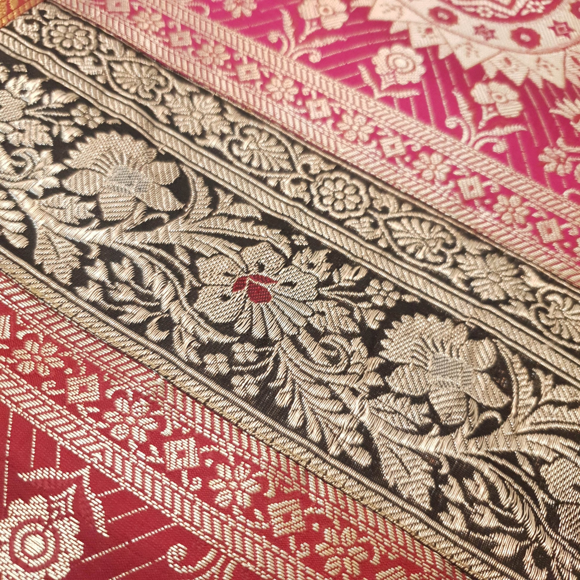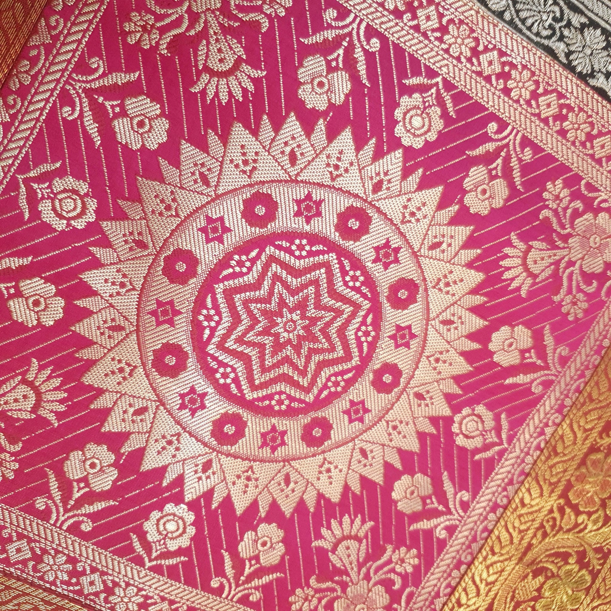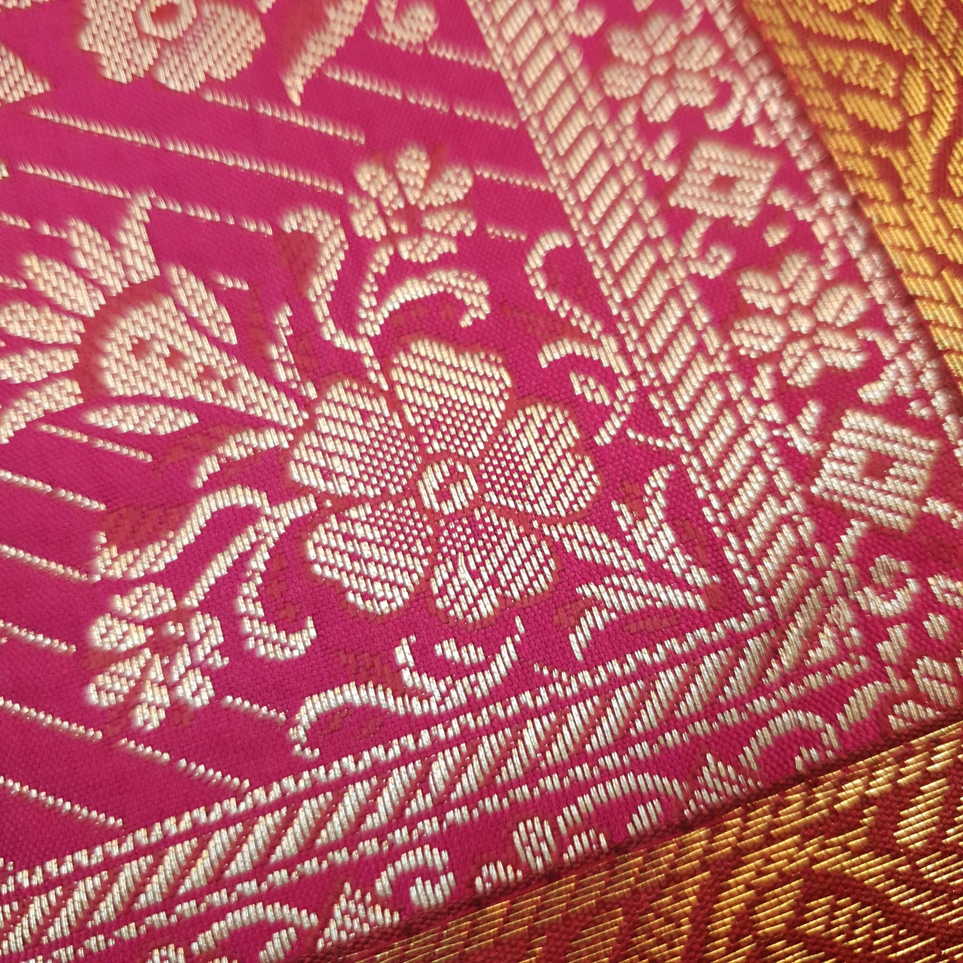 Step into a world of timeless elegance with our exquisite Woven Zari Brocade Banarasi Fabric Table Runner or Wall Tapestry. Crafted with meticulous attention to detail, this piece effortlessly blends tradition with contemporary style, adding a touch of opulence to any space.