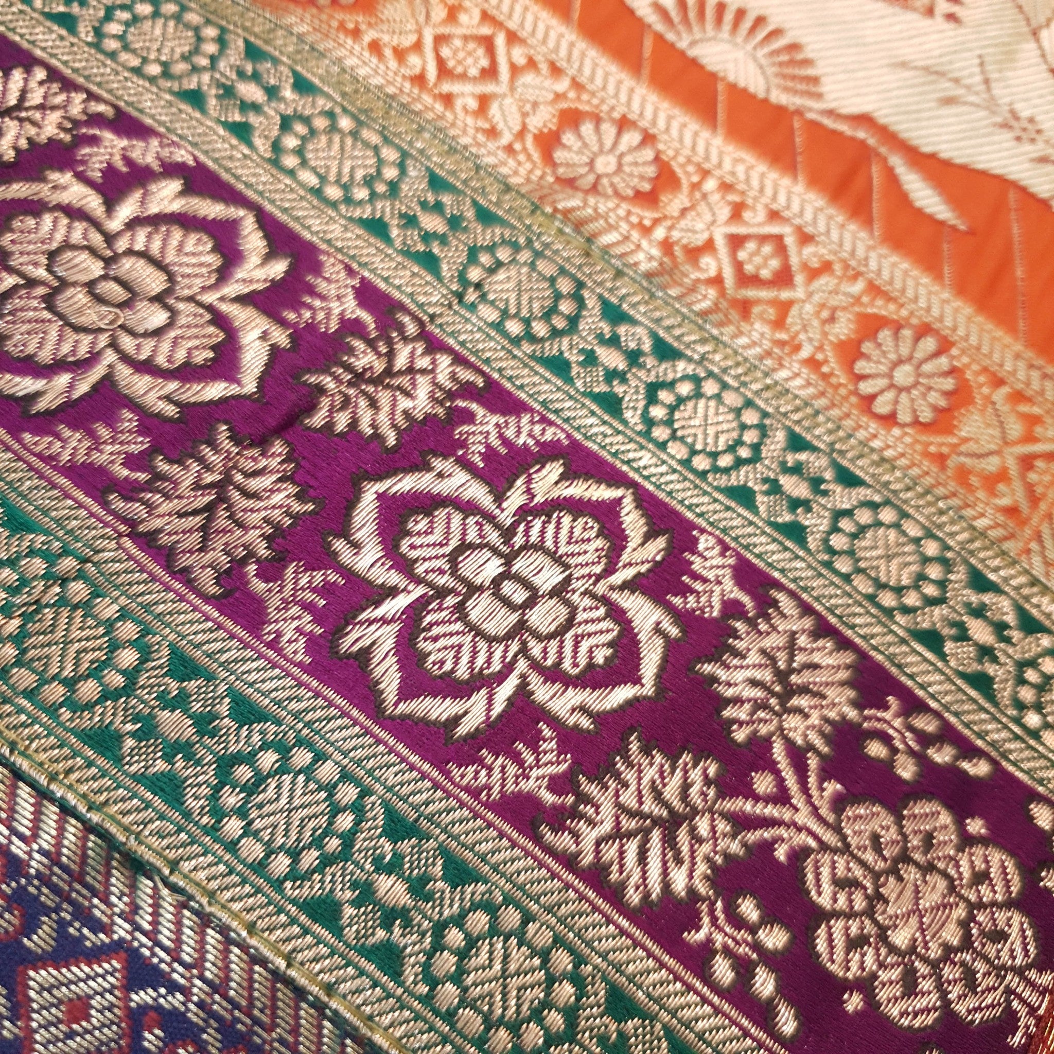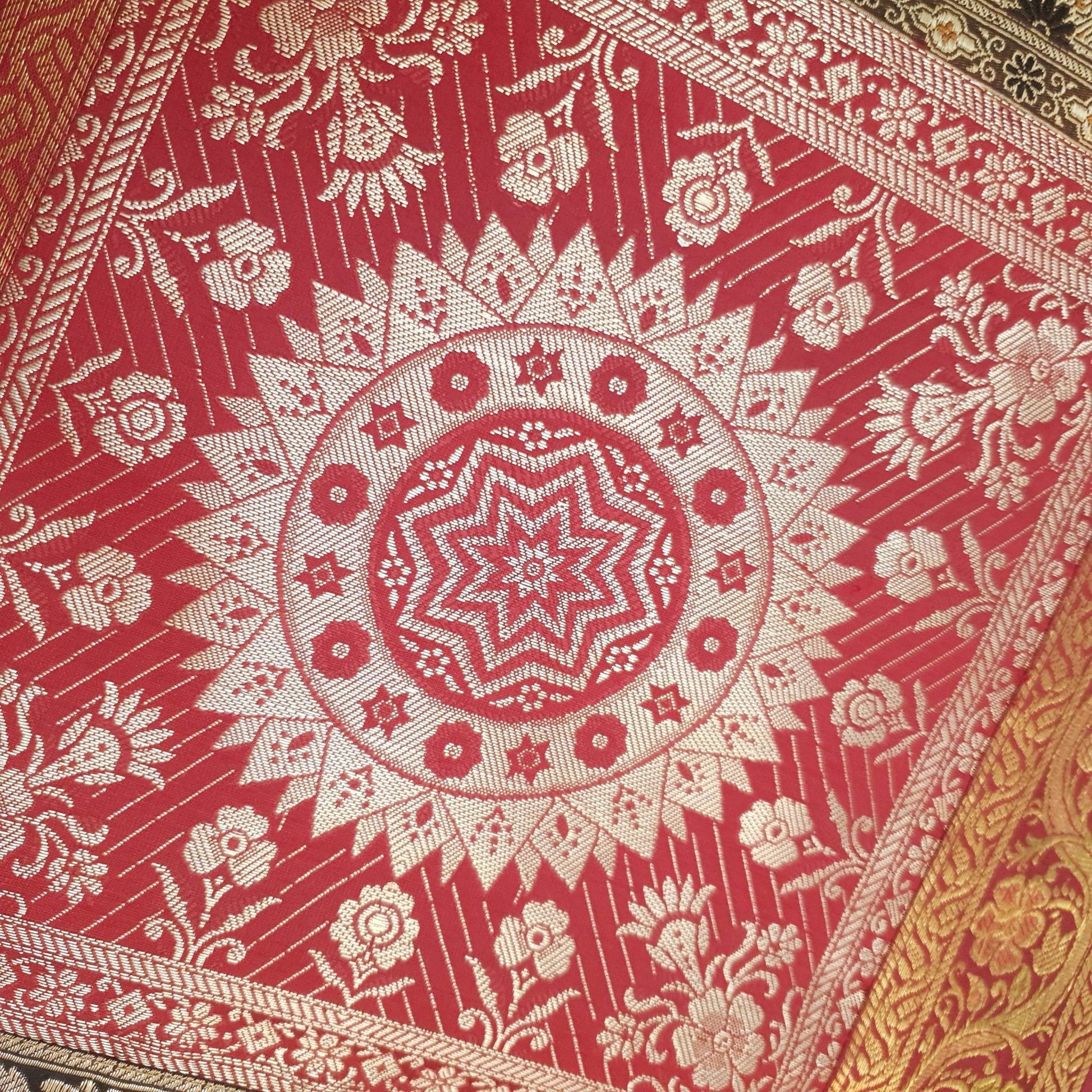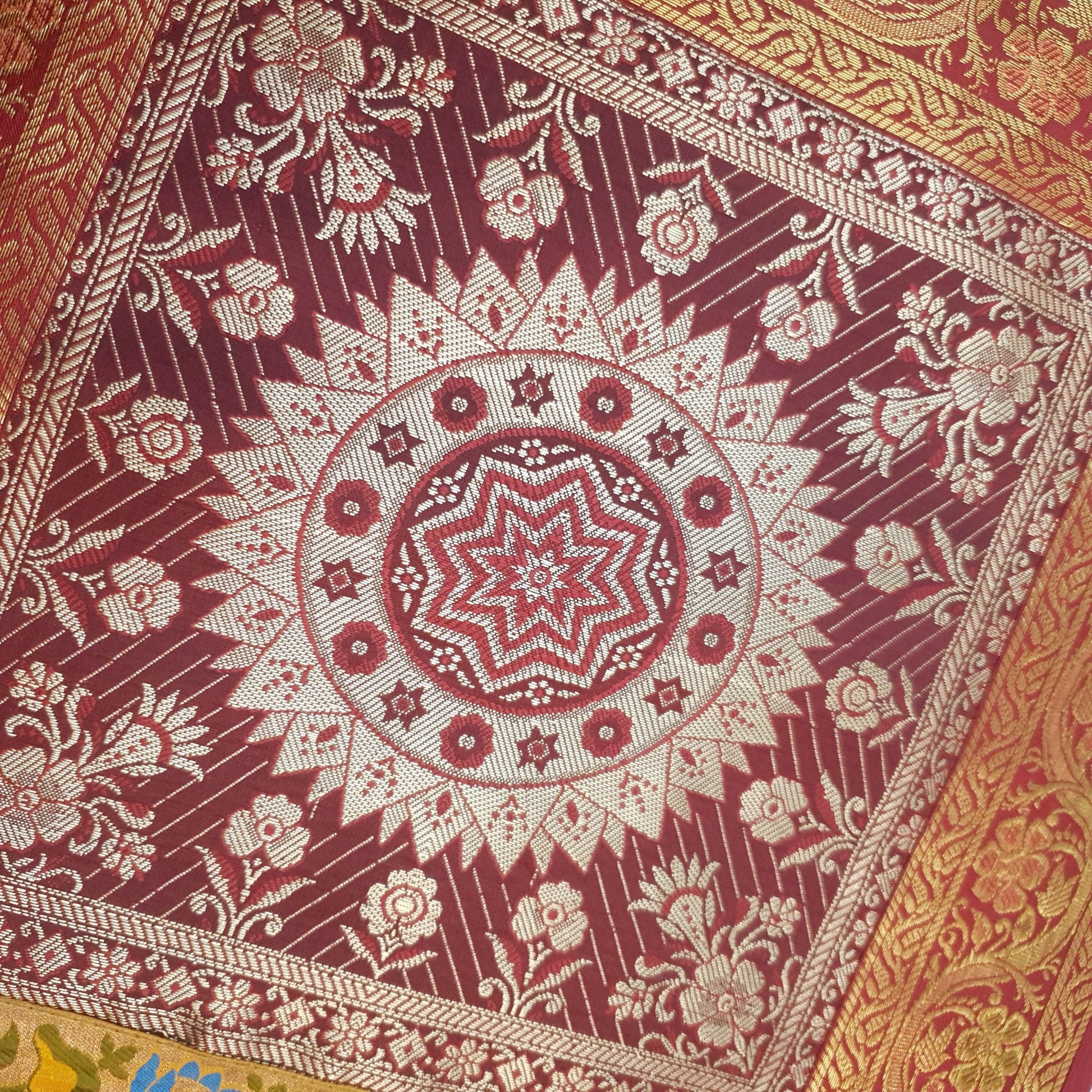 Embrace the allure of Indian craftsmanship and add a touch of elegance to your home with our Woven Zari Brocade Banarasi Fabric Table Runner or Wall Tapestry. Experience the timeless beauty and luxury it brings to your living space, creating moments to cherish for years to come.