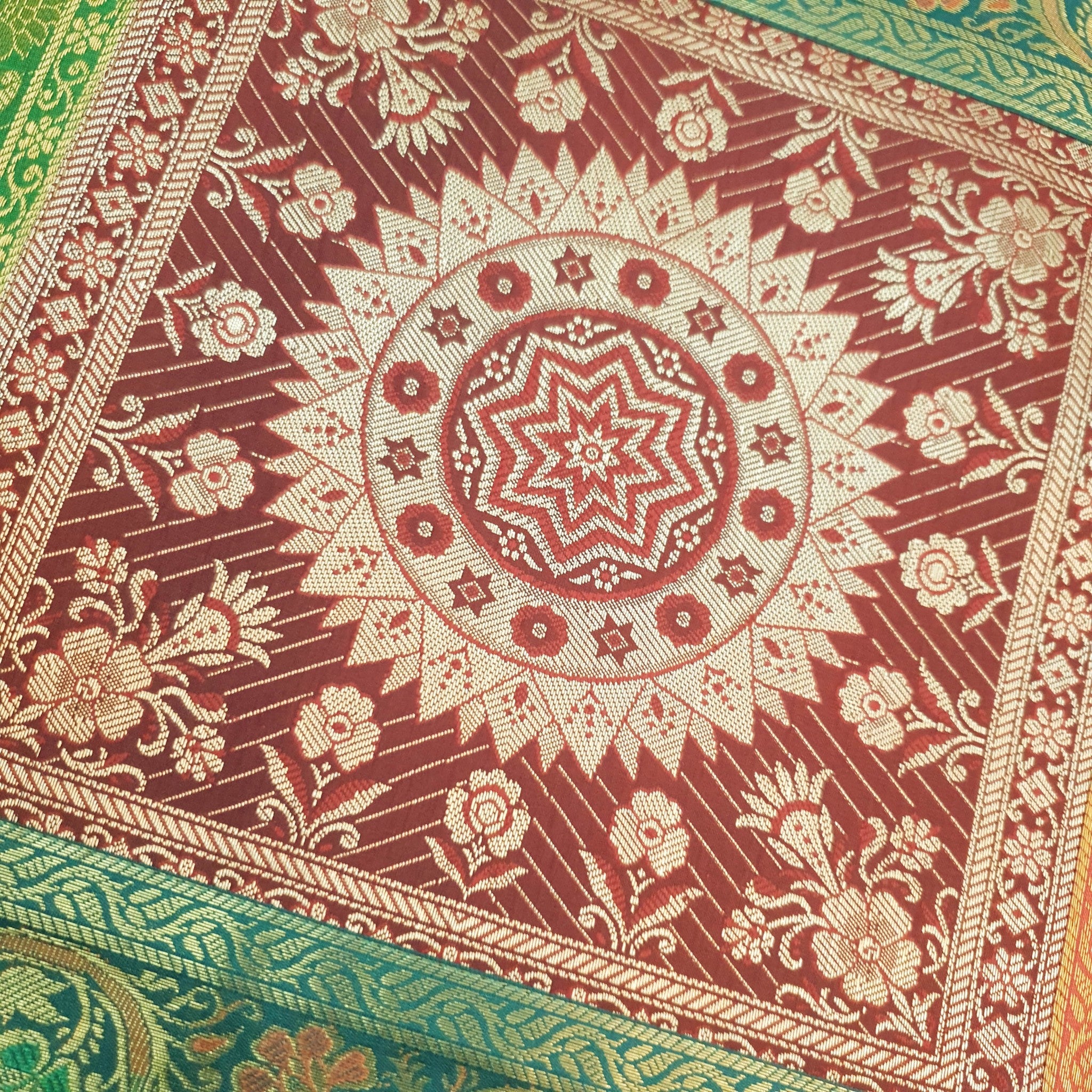 Step into a world of timeless elegance with our exquisite Woven Zari Brocade Banarasi Fabric Table Runner or Wall Tapestry. Crafted with meticulous attention to detail, this piece effortlessly blends tradition with contemporary style, adding a touch of opulence to any space.