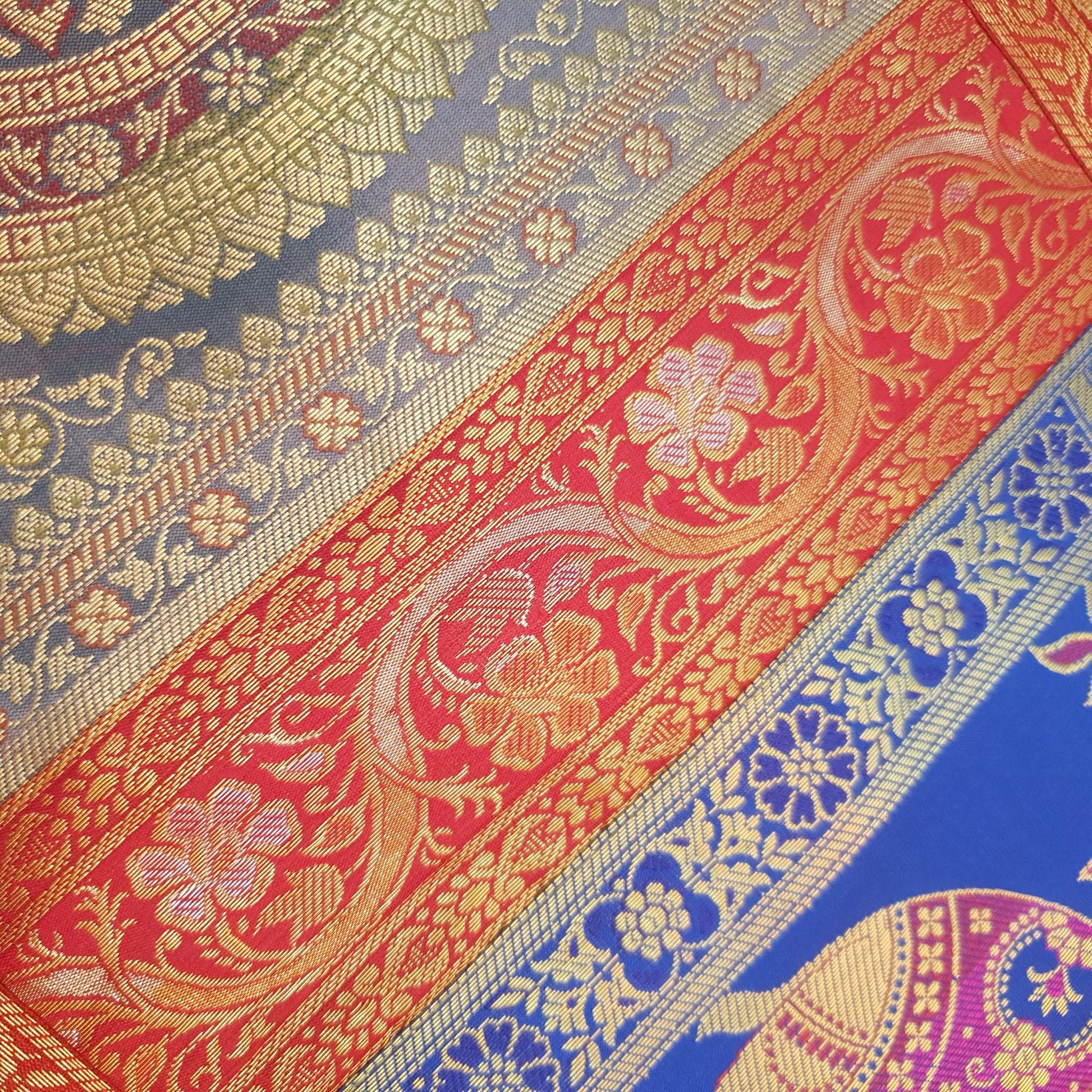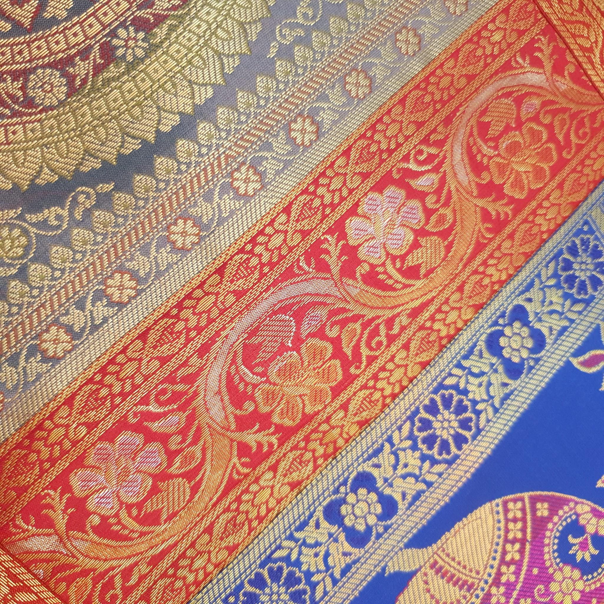 Step into a world of timeless elegance with our exquisite Woven Zari Brocade Banarasi Fabric Table Runner or Wall Tapestry. Crafted with meticulous attention to detail, this piece effortlessly blends tradition with contemporary style, adding a touch of opulence to any space.