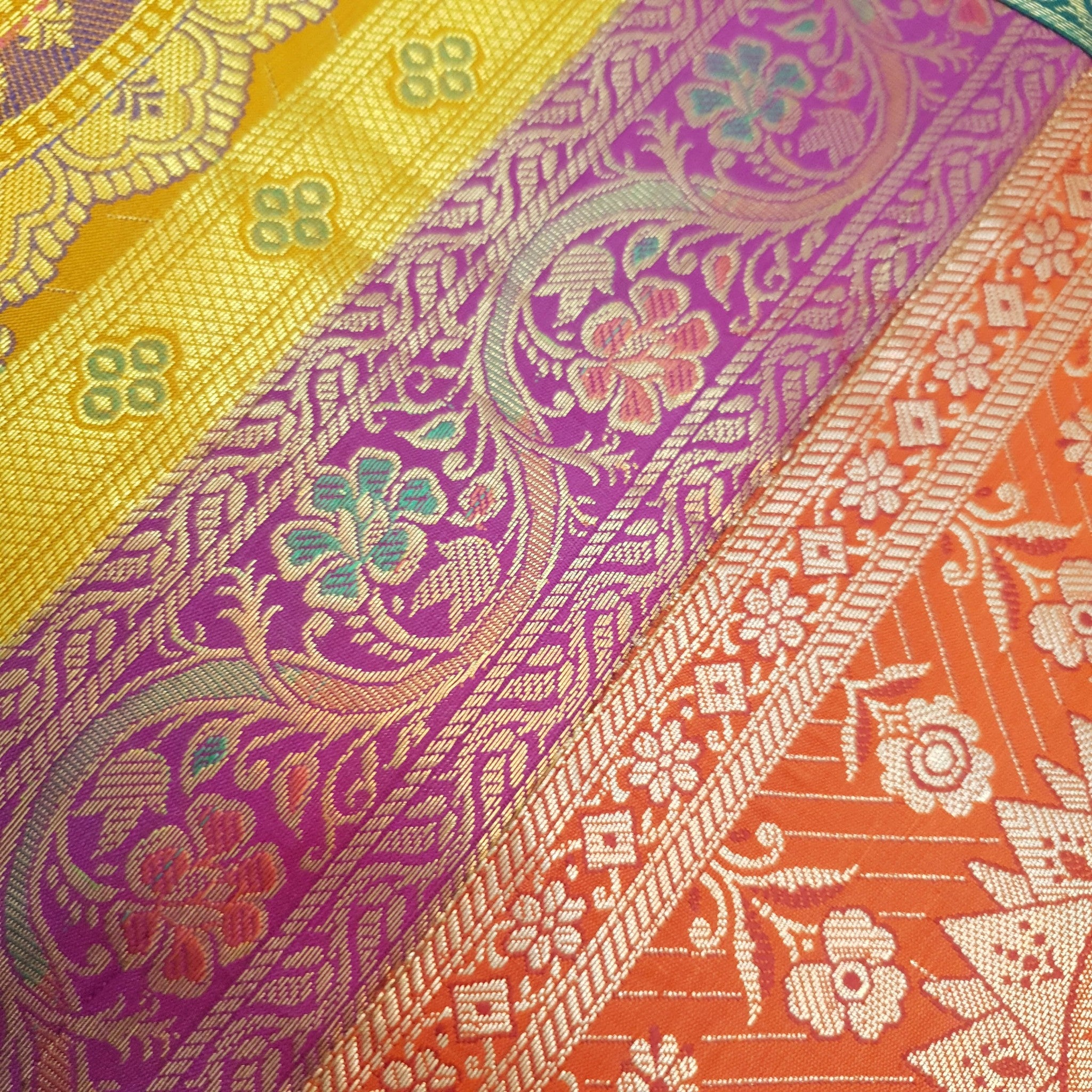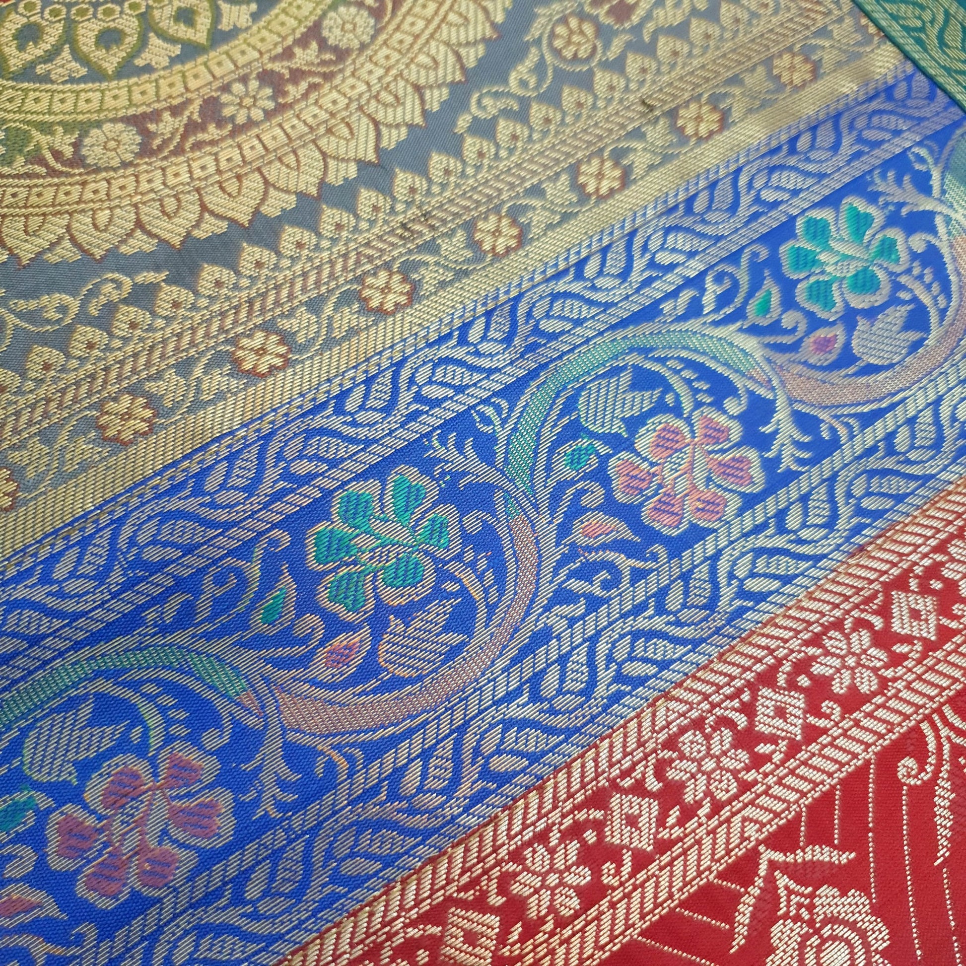 Step into a world of timeless elegance with our exquisite Woven Zari Brocade Banarasi Fabric Table Runner or Wall Tapestry. Crafted with meticulous attention to detail, this piece effortlessly blends tradition with contemporary style, adding a touch of opulence to any space.
