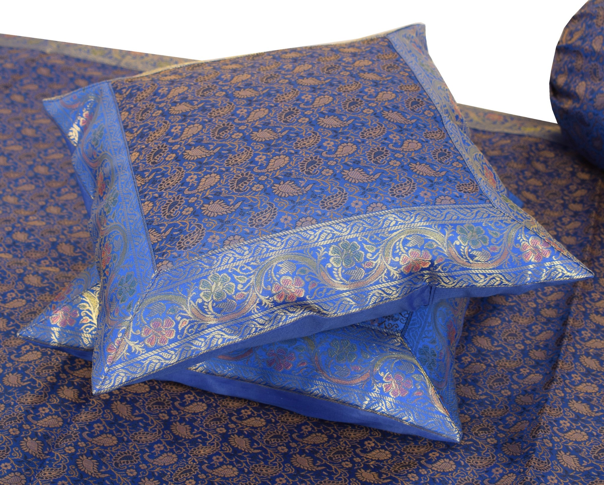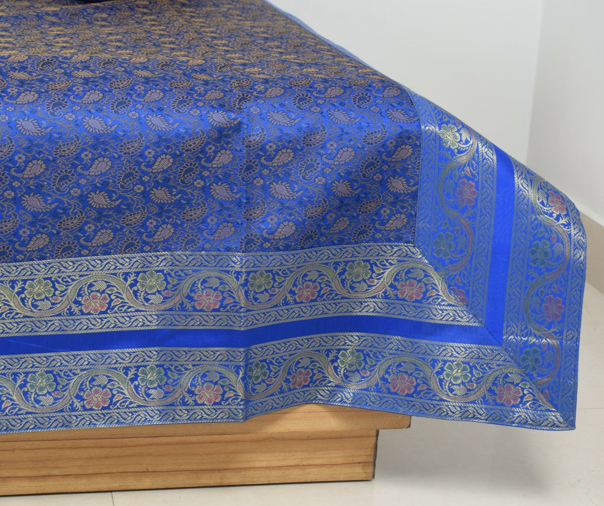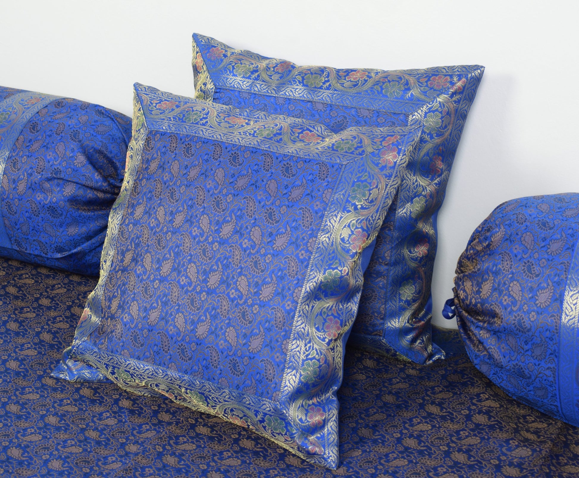 This is a Patch Work Diwan Set in Art Silk Fabric with all side Banarasi Silk Woven Golden Zari Brocade Border, this Diwan Set comes with Matching color Back lining fabric with Hidden Zip which allow you to insert the Blanket in Bed Cover and Pillow in the Cushion Cover & Bolster Cover . The base color of the cover is Blue Color Border & Art or Artificial Silk fabric.