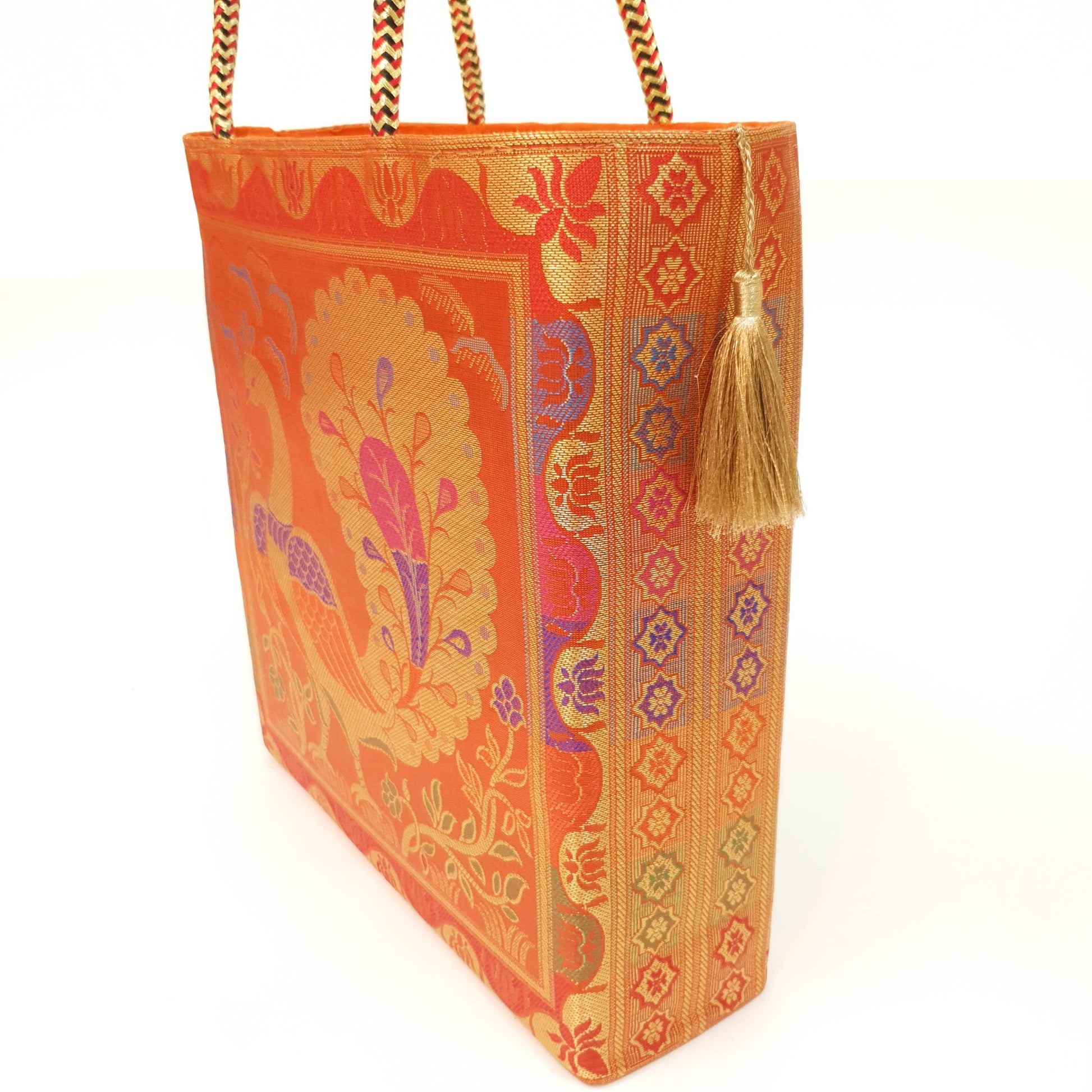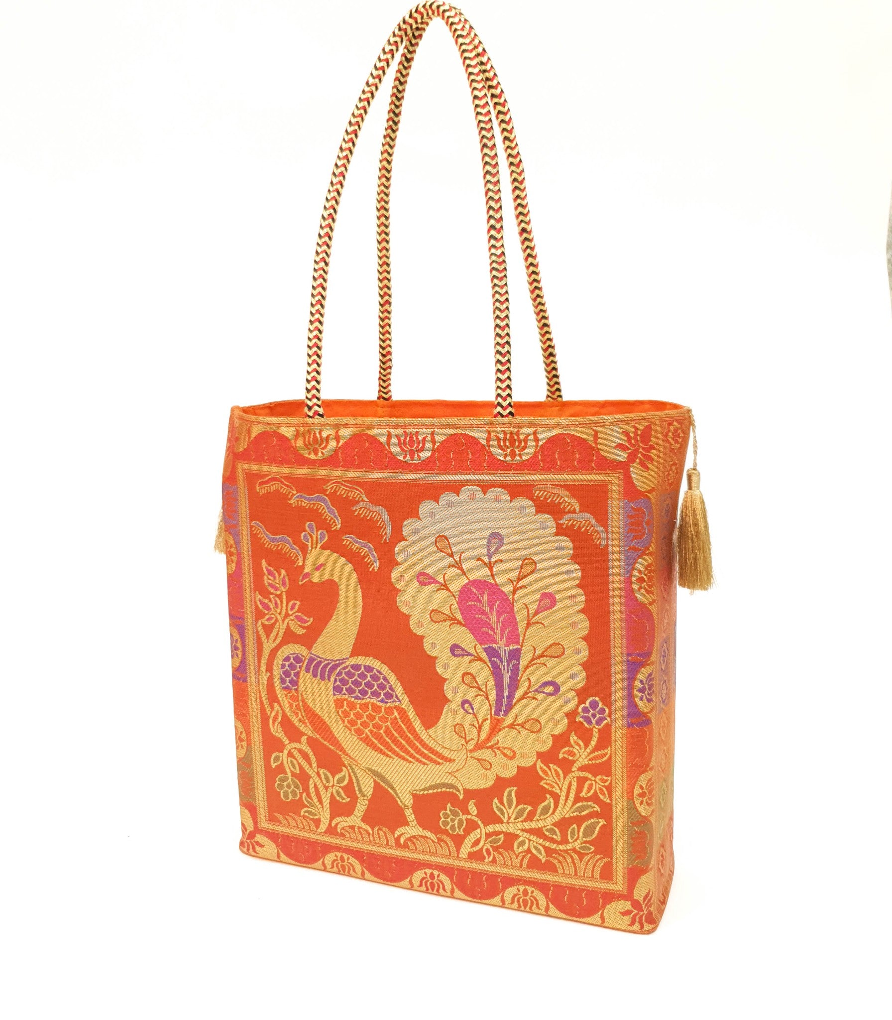 Ethnic Handbag Orange Peacock Woven Zari Brocade Fabric Casual Shoulder Bag