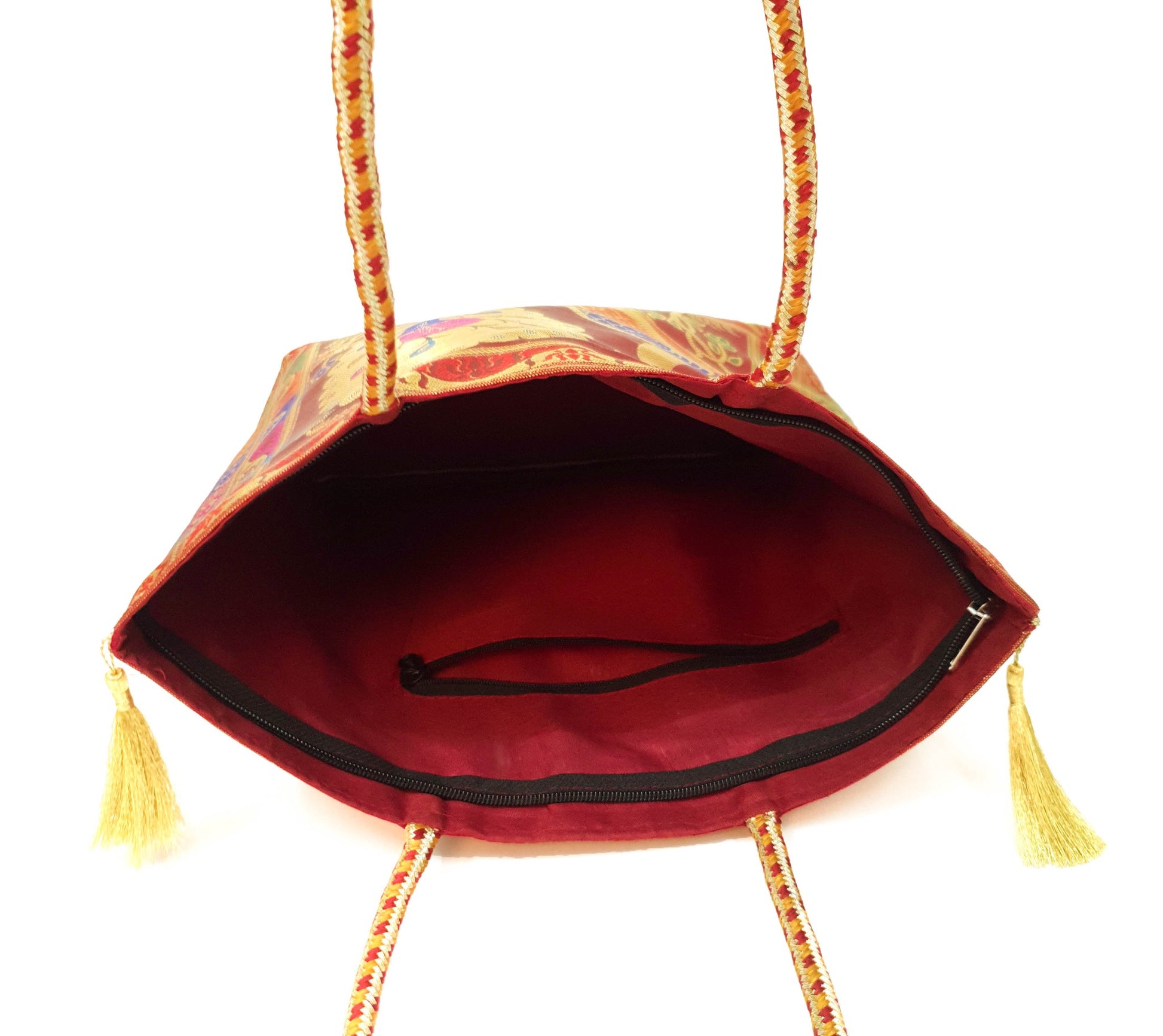Matching color Back lining fabric is used inside the bag with one zip based compartment inside the bag and one main large zip on top of the Bag .. There are two Zari Tassels used on both end of the main Zip (As shown in the images).