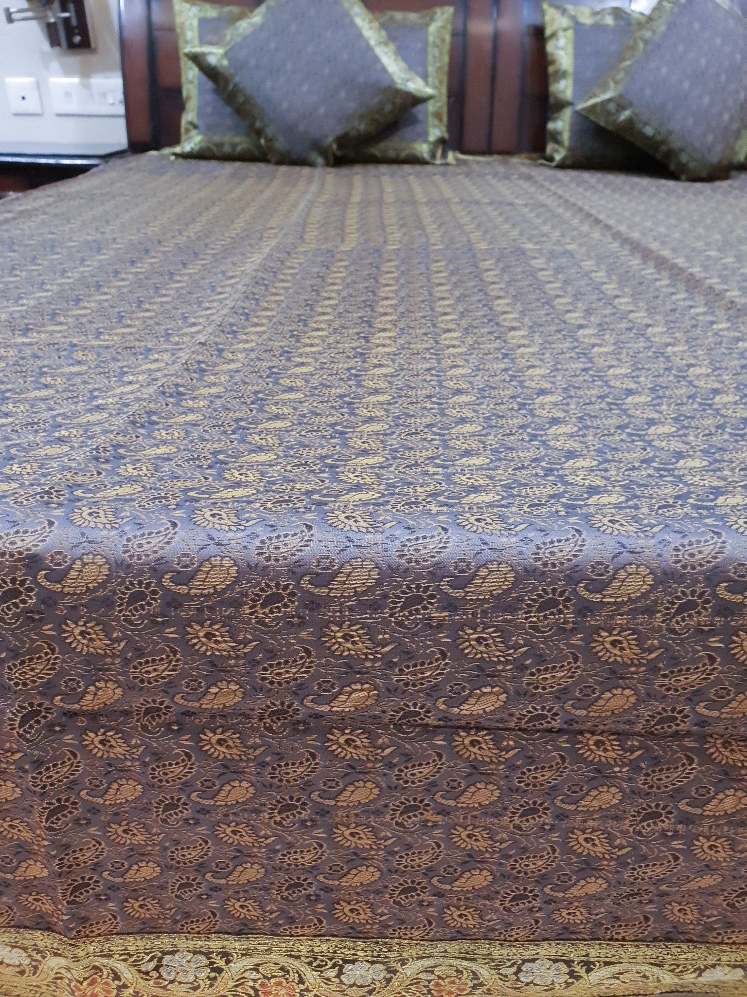 This is a Patch Work Bed Cover Set in Art Silk Fabric with all side Banarasi Silk Woven Golden Zari Brocade Border, this Bed Cover comes with Matching color Back lining fabric with Hidden Zip which allow you to insert the Blanket in Bed Cover and Pillow in the Cushion Cover & Pillow Cover . The base color of the cover is Gray.