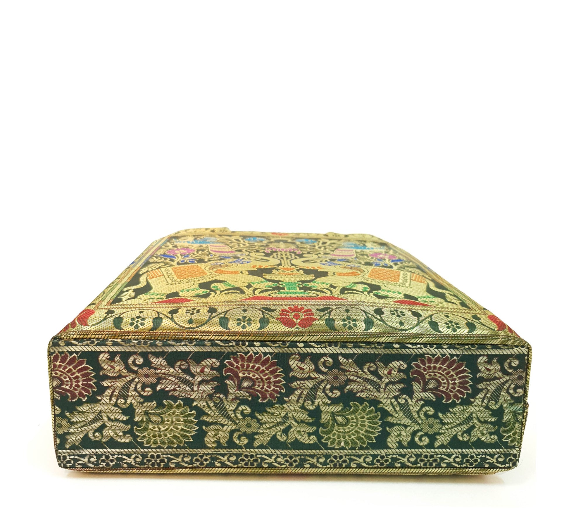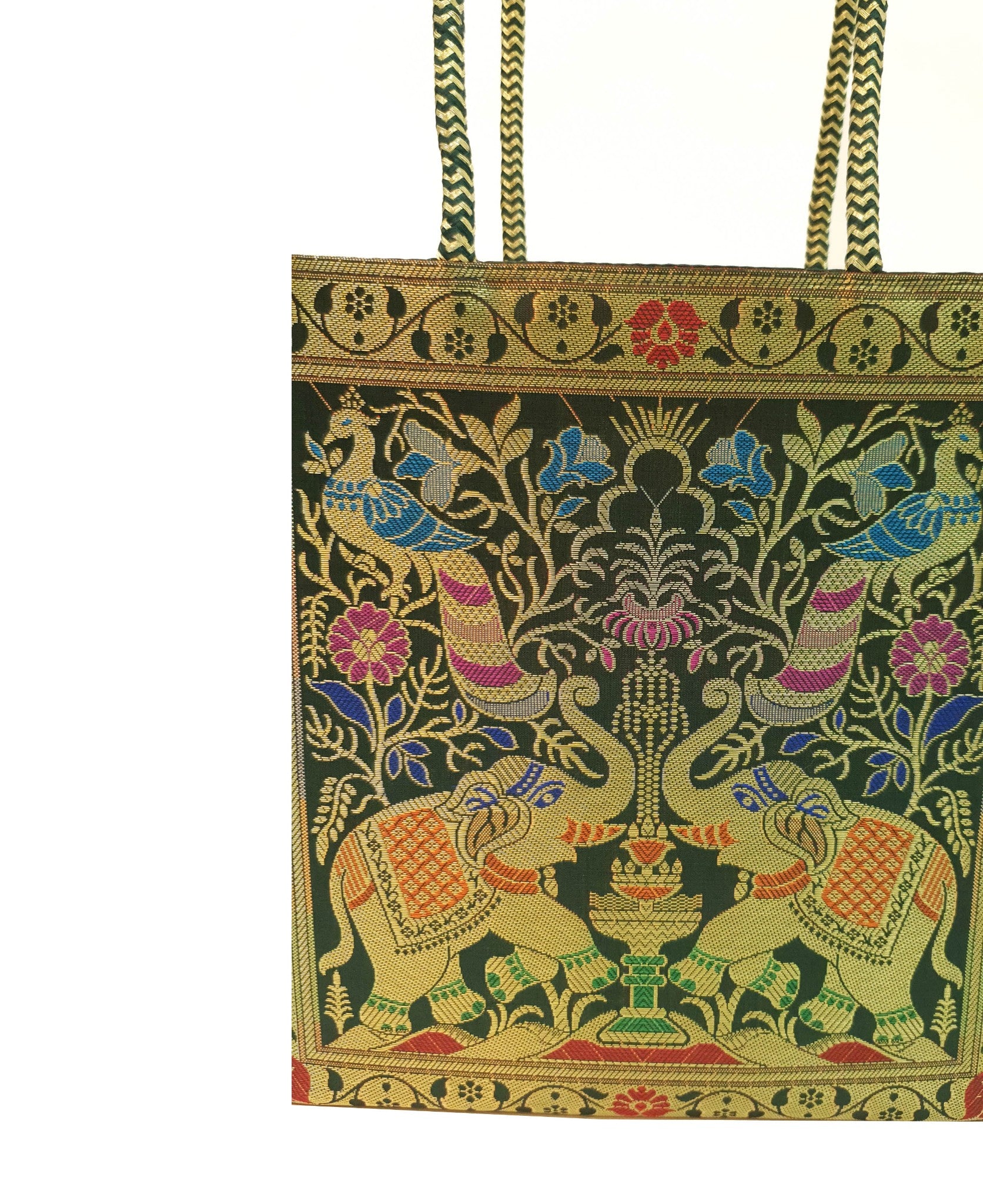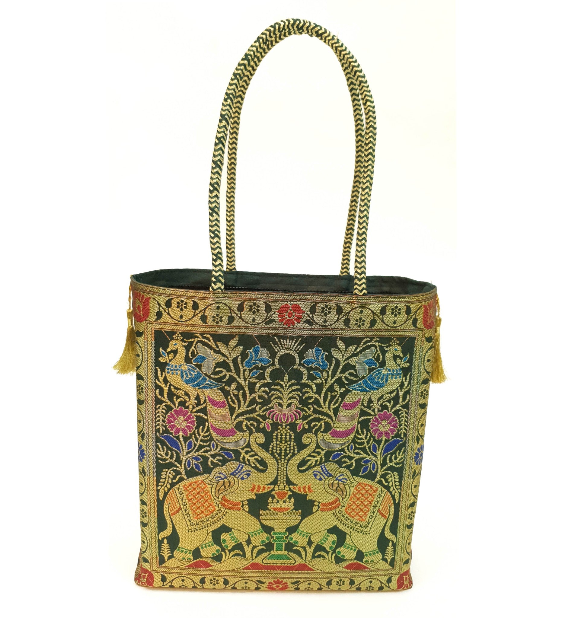 Handbag Ethnic Peacock Elephant Woven Zari Brocade Dark Green Shoulder Hand Bag