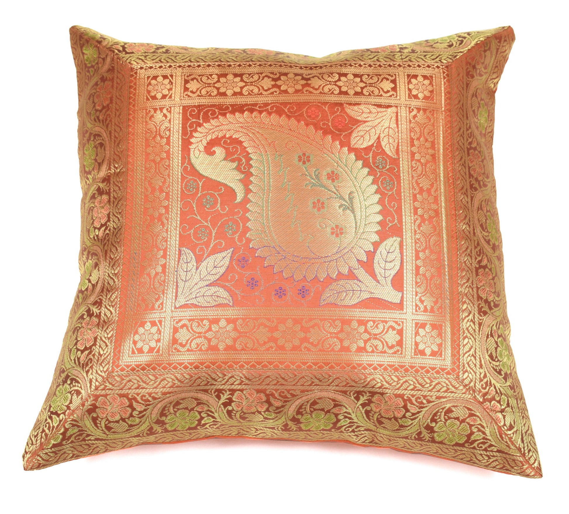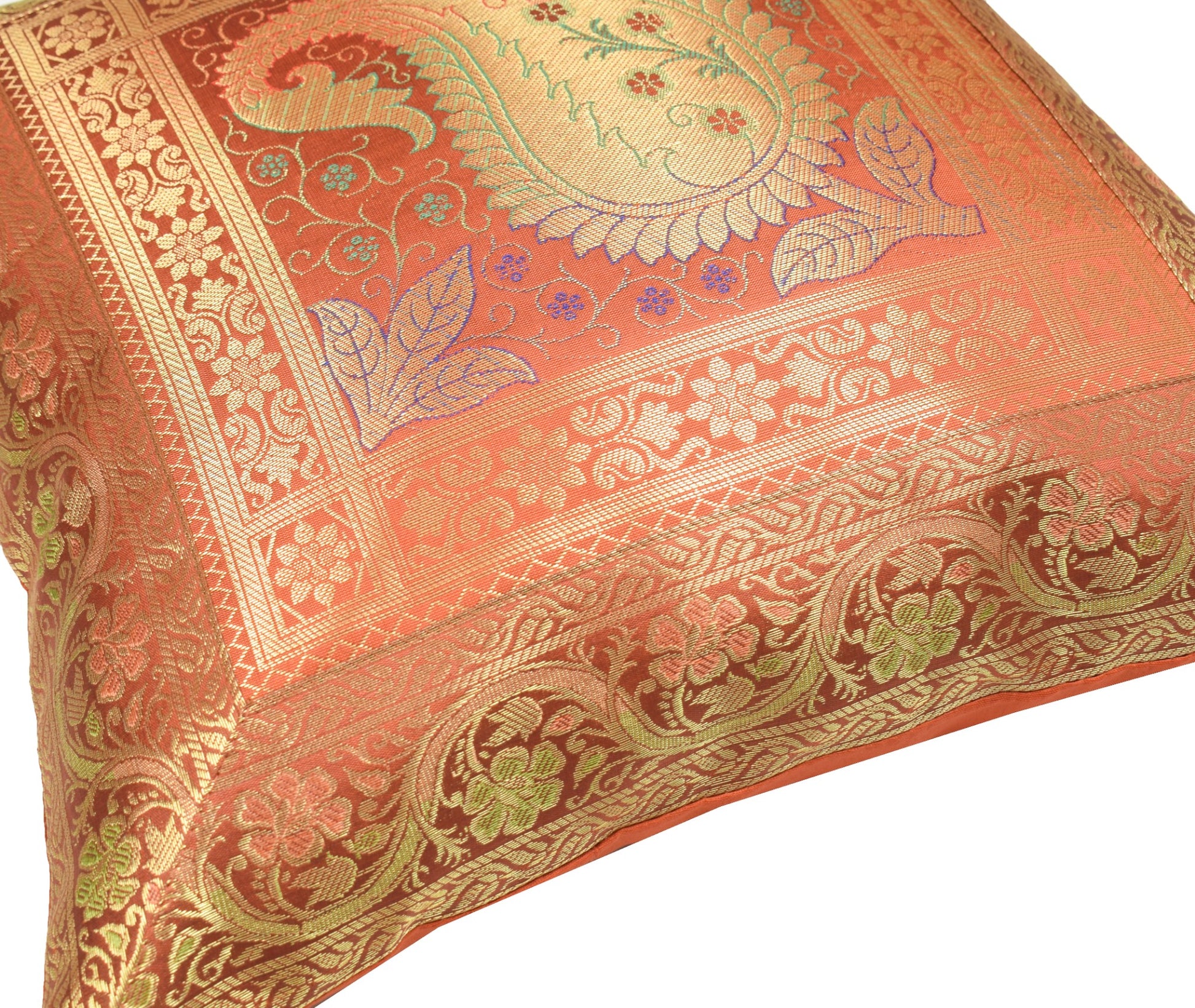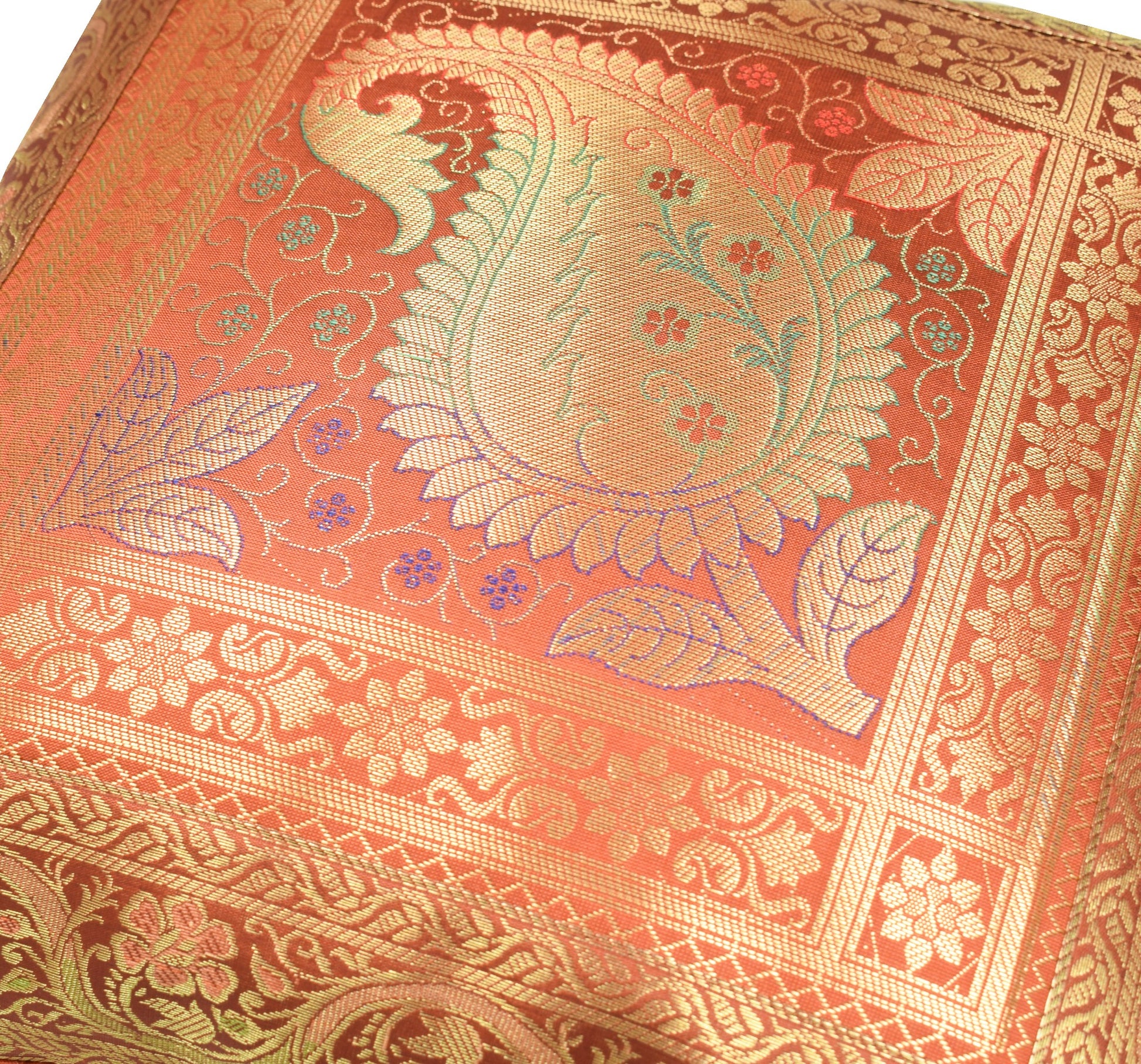 Banarasi Vastra Presents Indian Art Silk Woven Zari Brocade Banarasi Cushion Pillow Cover in Paisley Pattern in the centre Part of the cover with all 4 Side Floral Zari Woven Border. this Cover comes with Matching color Back lining fabric with Hidden Zip which allow you to insert the Cushion Pillow. The base color of the cover is Rust.