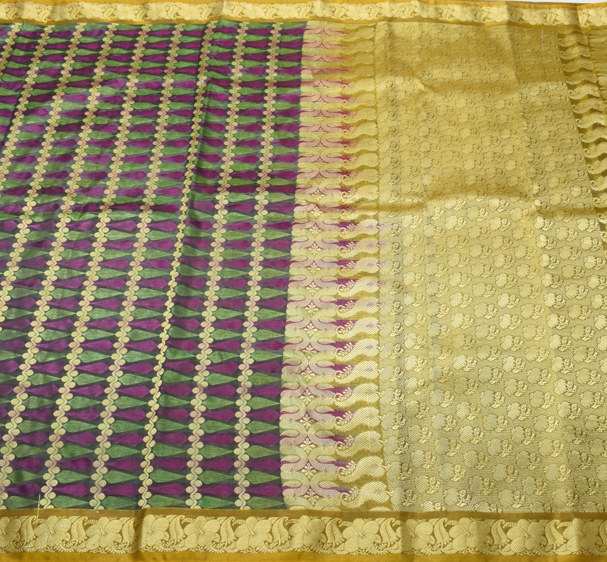 Elegant multi-color Banarasi saree crafted from premium Art Silk with a contemporary geometrical pattern. Features intricate self & zari woven work. Includes 32-inch unstitched blouse fabric. New, never worn. Total length: 224 inches, width: 45 inches. Weight: 630 grams. Perfect for festive and traditional occasions.