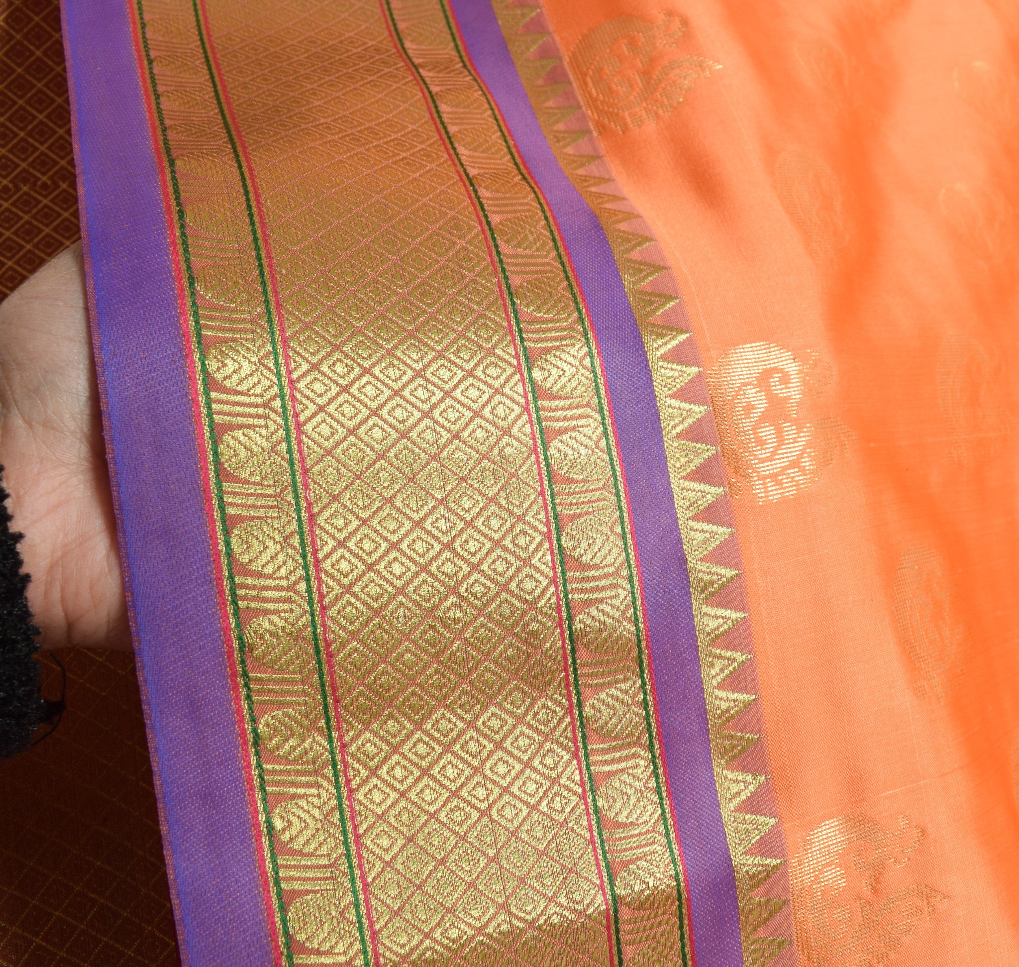 - Color: Peachy Orange with Blue Border Pallu