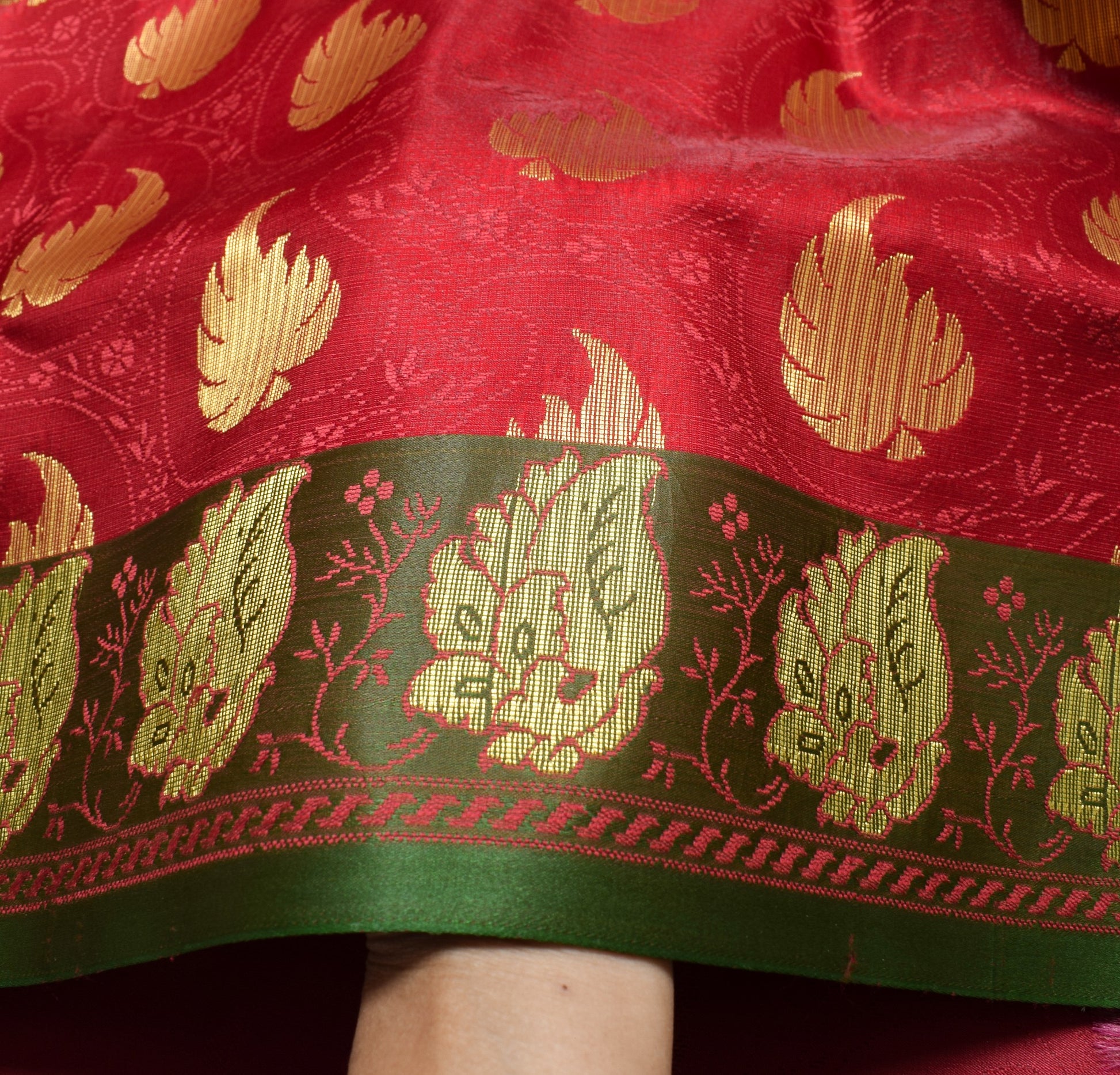 Beautiful Zari and self Woven Indian Art Silk Handloom Saree from Banaras, this sari has all over Zari Woven leaves Pattern motifs with Paisley Rich Pallu and both side 3.5 inches broad Zari Woven Contrast color Border. This Saree comes with Matching (UN-Stitched) Blouse Fabric which need to cut before the Anchal/Pallu. This Saree is great for wearing in parties and special occasions, This Saree is also great for crafting ideas like one can make beautiful curtains, table or bed cover, a beautiful dress etc items.