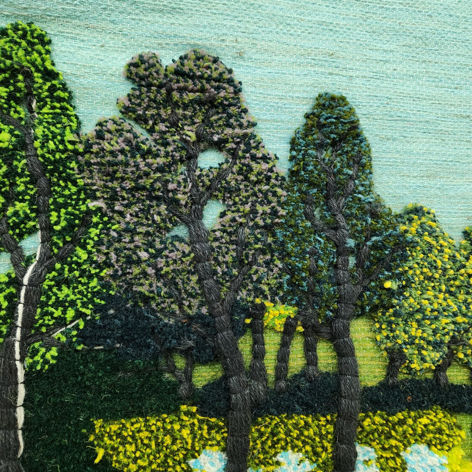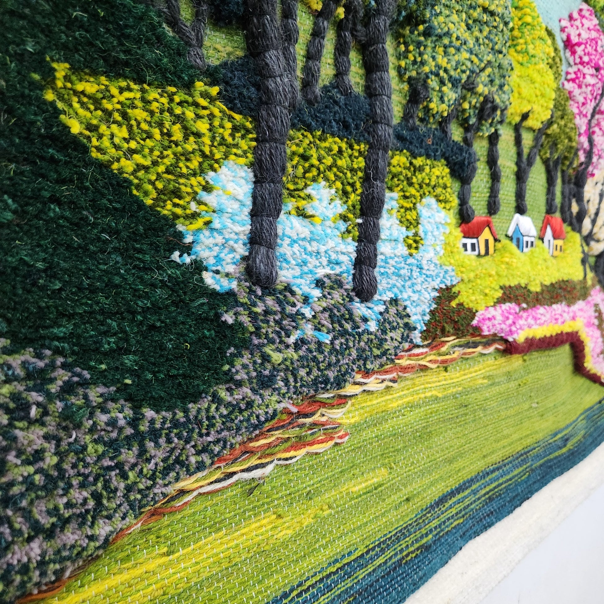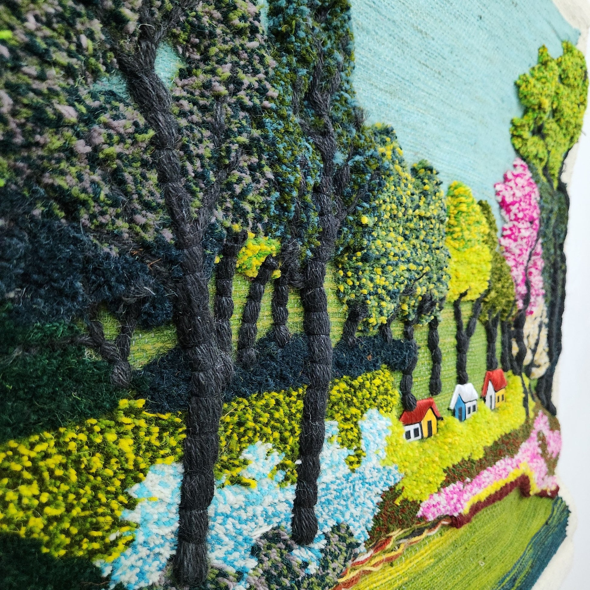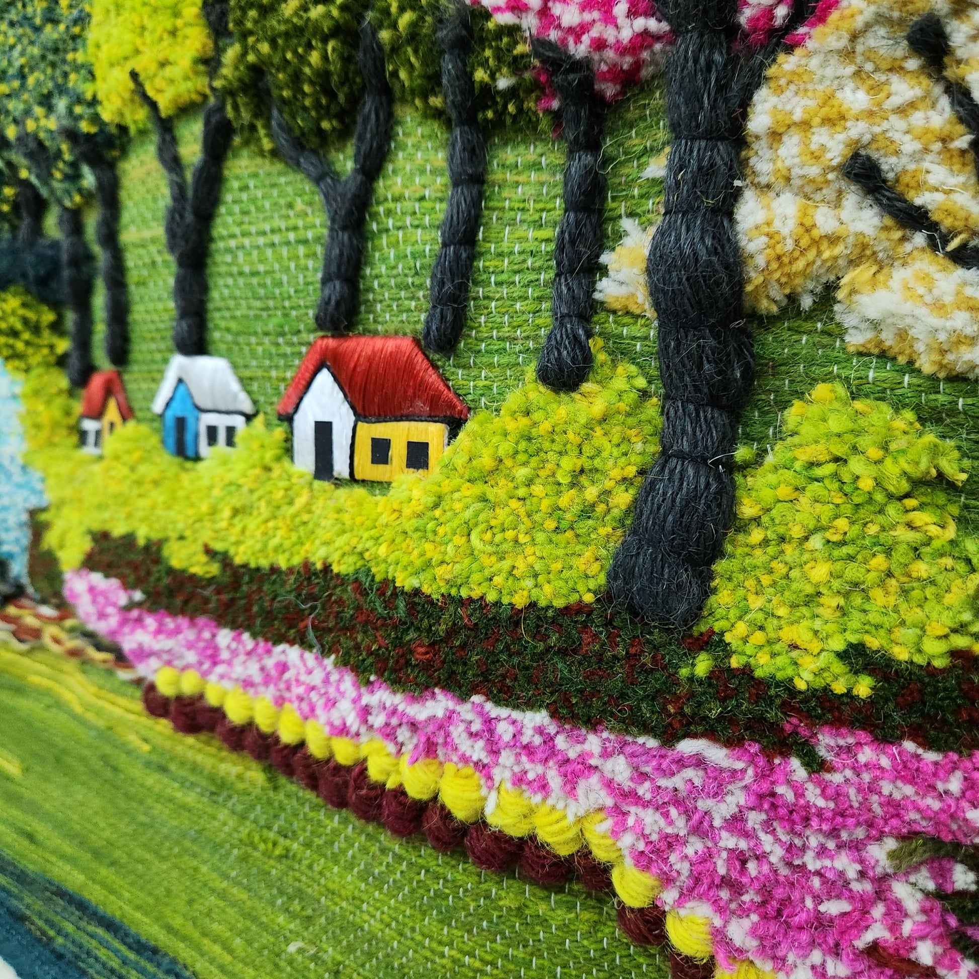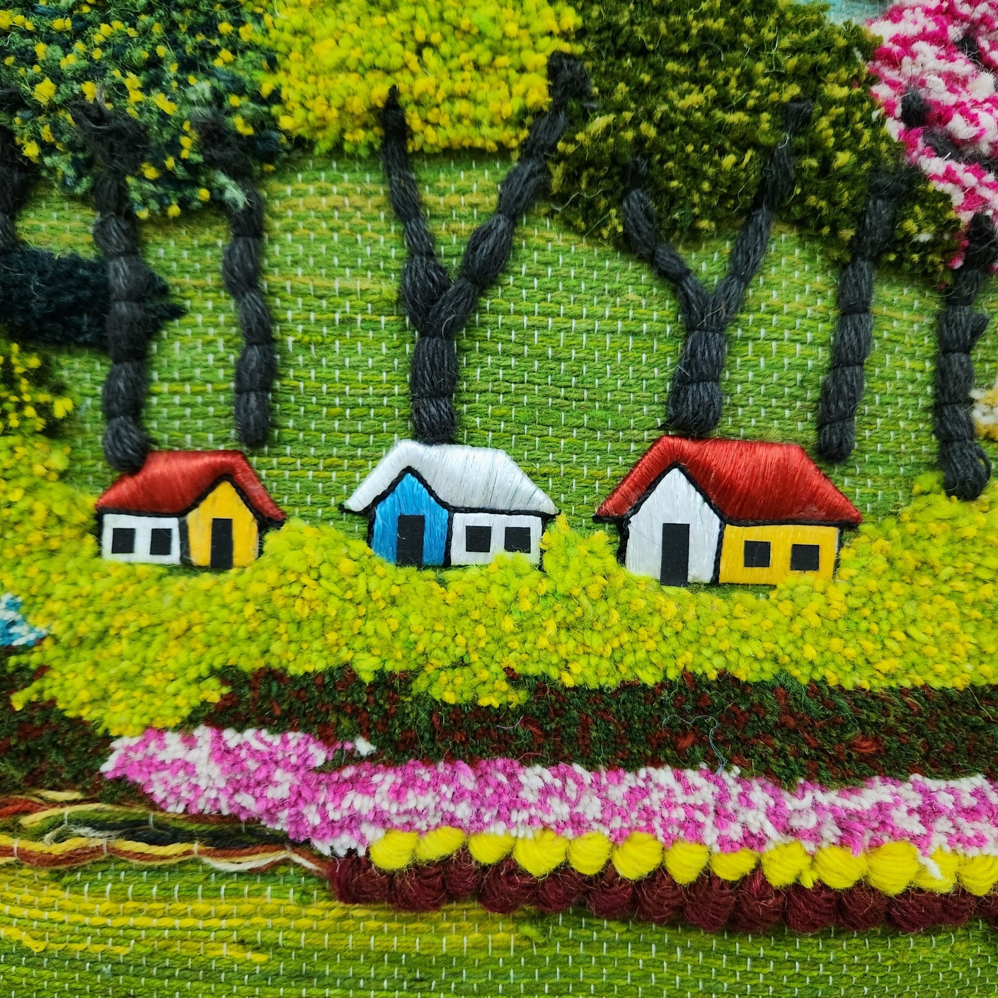 Jute & Wool Wall Hanging HandMade Indian Tapestry 3D Hut Tree Sky Greenery
