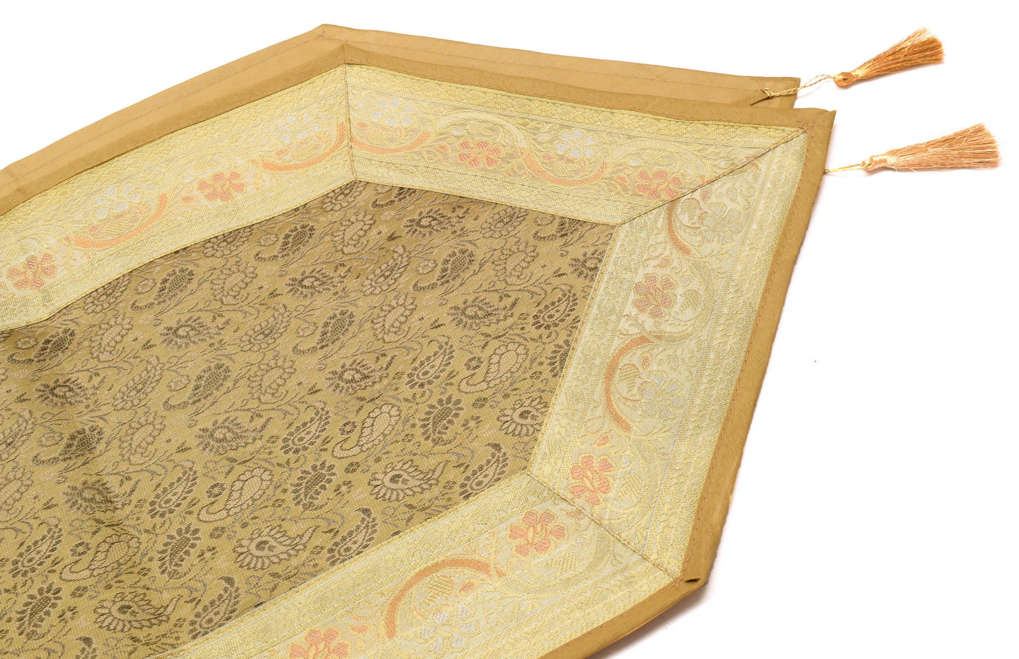 Banarasi Vastra Presents 14 Inch x 60 Inch Woven Golden Zari Brocade Banarasi Silk Table Runner with Woven Paisley Pattern Tanchoi Fabric in the center Part of the cover with all Side Floral Zari Woven Border with 2 side Golden Zari Tassel. this Runner comes with Matching color Back lining fabric.