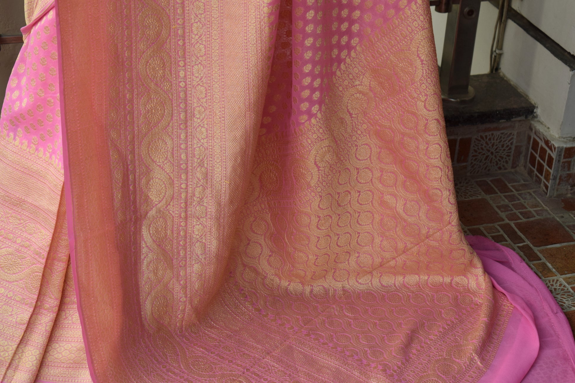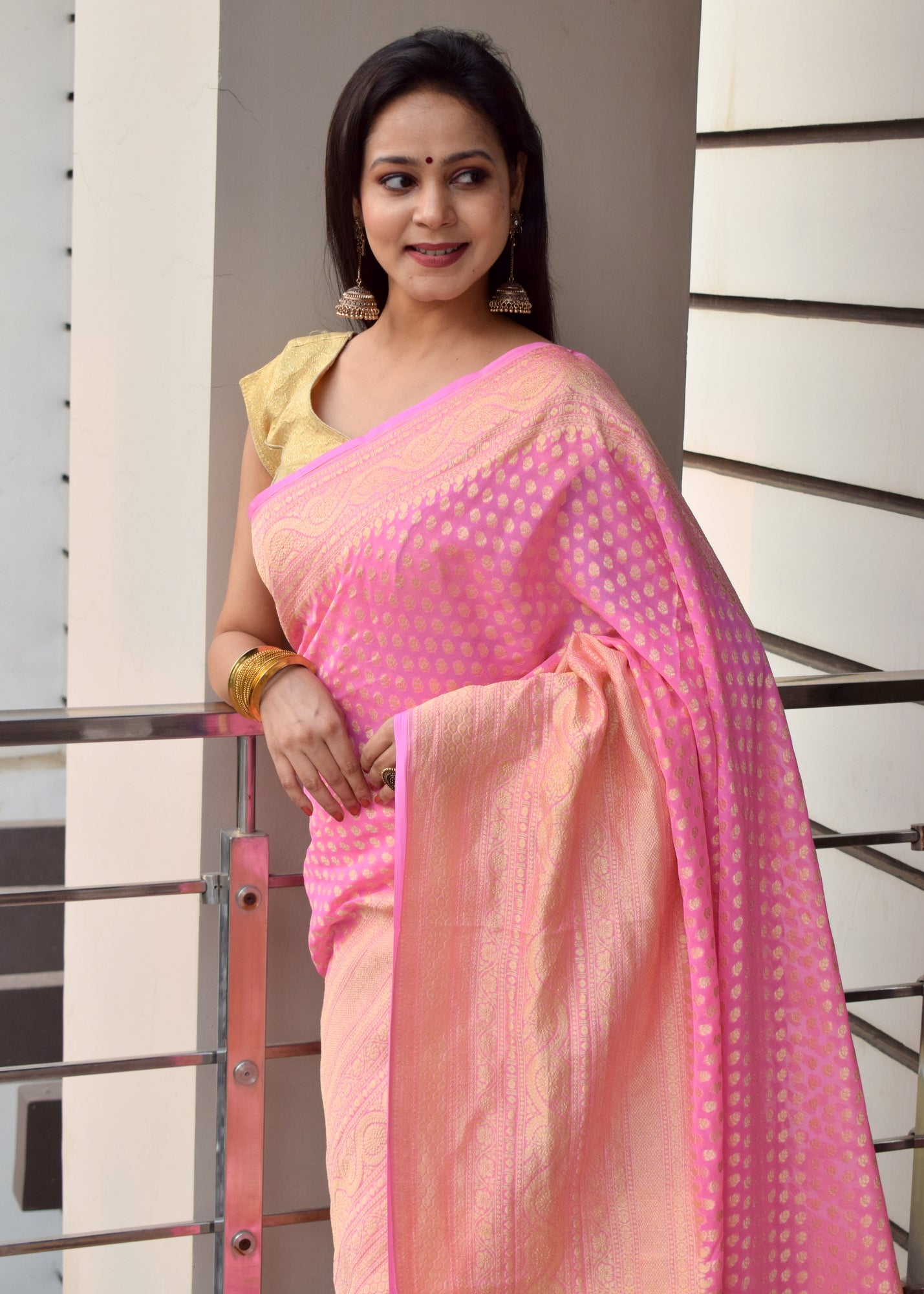 Banarasi Vastra Presents 100% Pure Khaddi Georgette Silk Banarasi Handloom Saree in Light Pink Color with Floral Zari Motifs Pattern in the center part of the saree with Heavy Skirt Border & Rich Pallu.