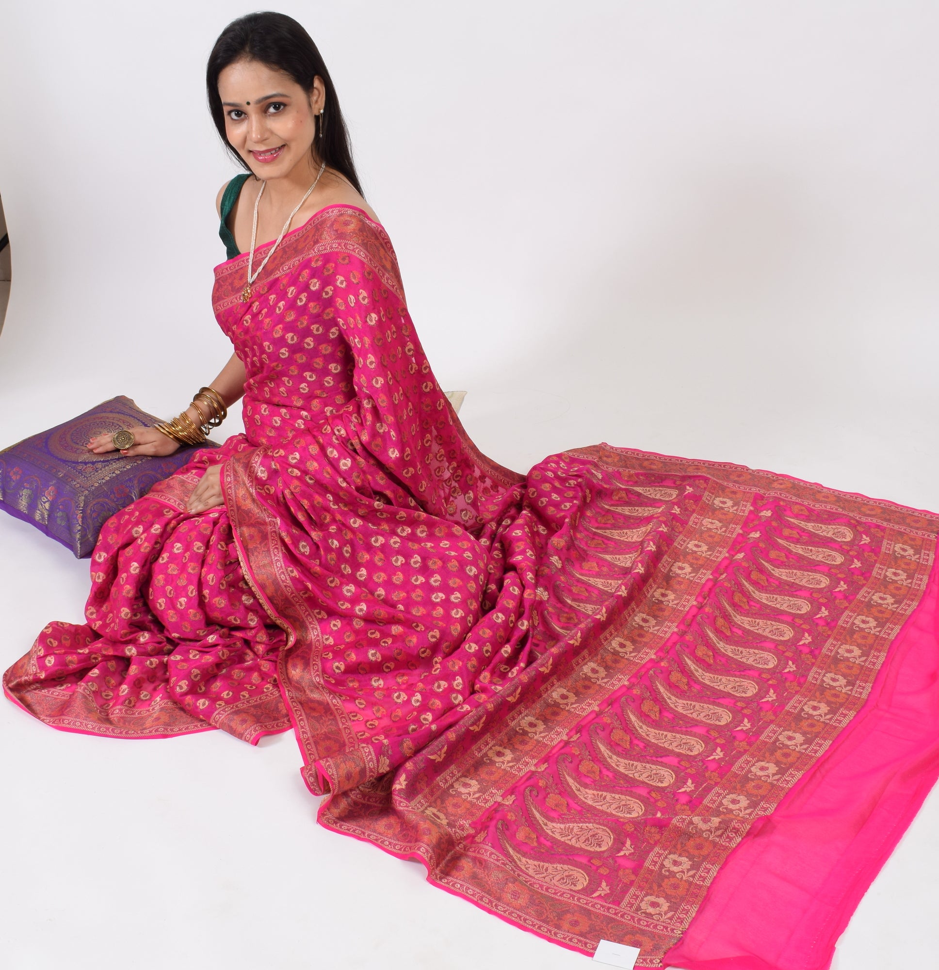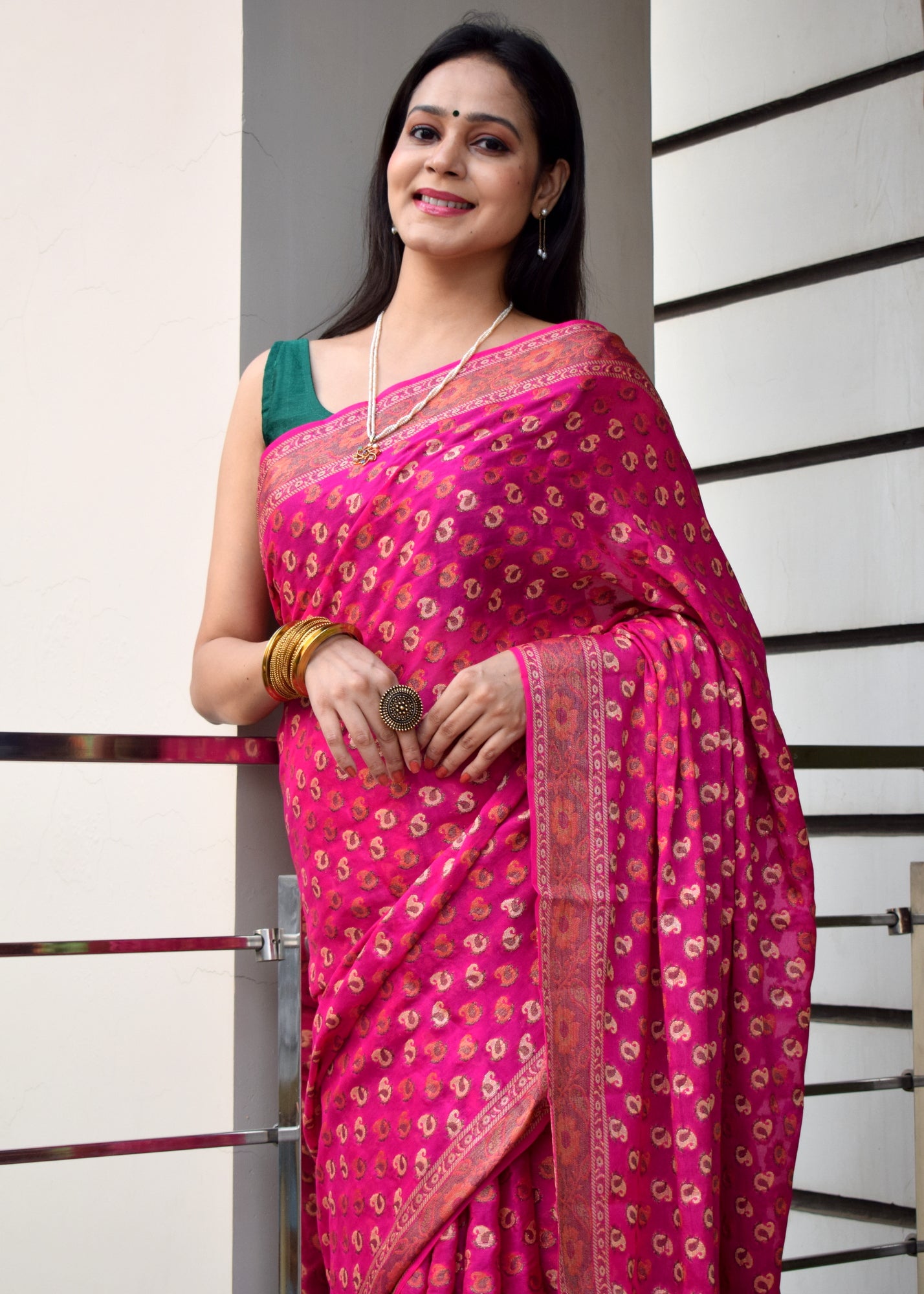 Banarasi Vastra Presents 100% Pure Khaddi Chiffon Silk Banarasi Handloom Saree in Magenta Color with Zari Woven Small Paisley Motifs Pattern in the center part of the saree Floral Zari Border & Rich Pallu.