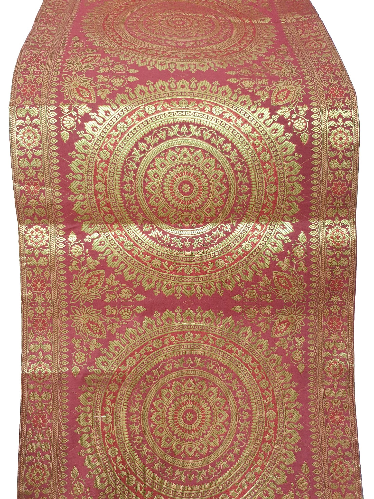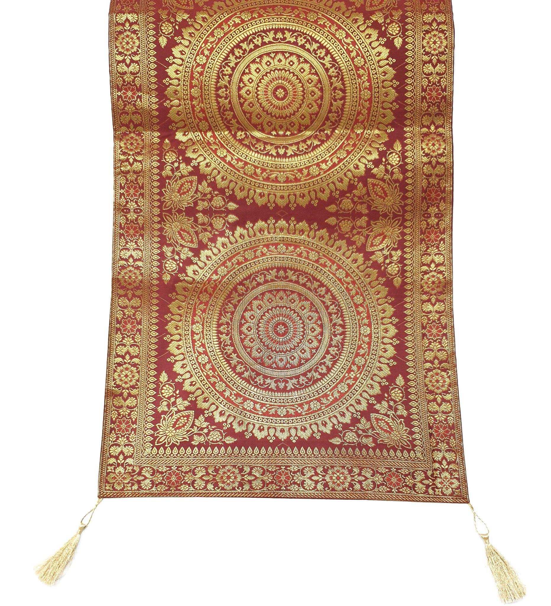 Banarasi Vastra Presents 16 Inch x 72 Inch Woven Golden Zari Brocade Banarasi Silk Table Runner with Woven Mandala Pattern Tanchoi Fabric in the center Part of the cover with all Side Floral Zari Woven Border with 4 side Golden Zari Tassel. this Runner comes with Matching color Back lining fabric.