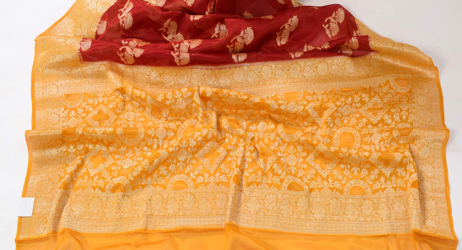 Maroon & Mustard Pure Khaddi Chiffon Silk Banarasi Handloom Premium Saree Fabric