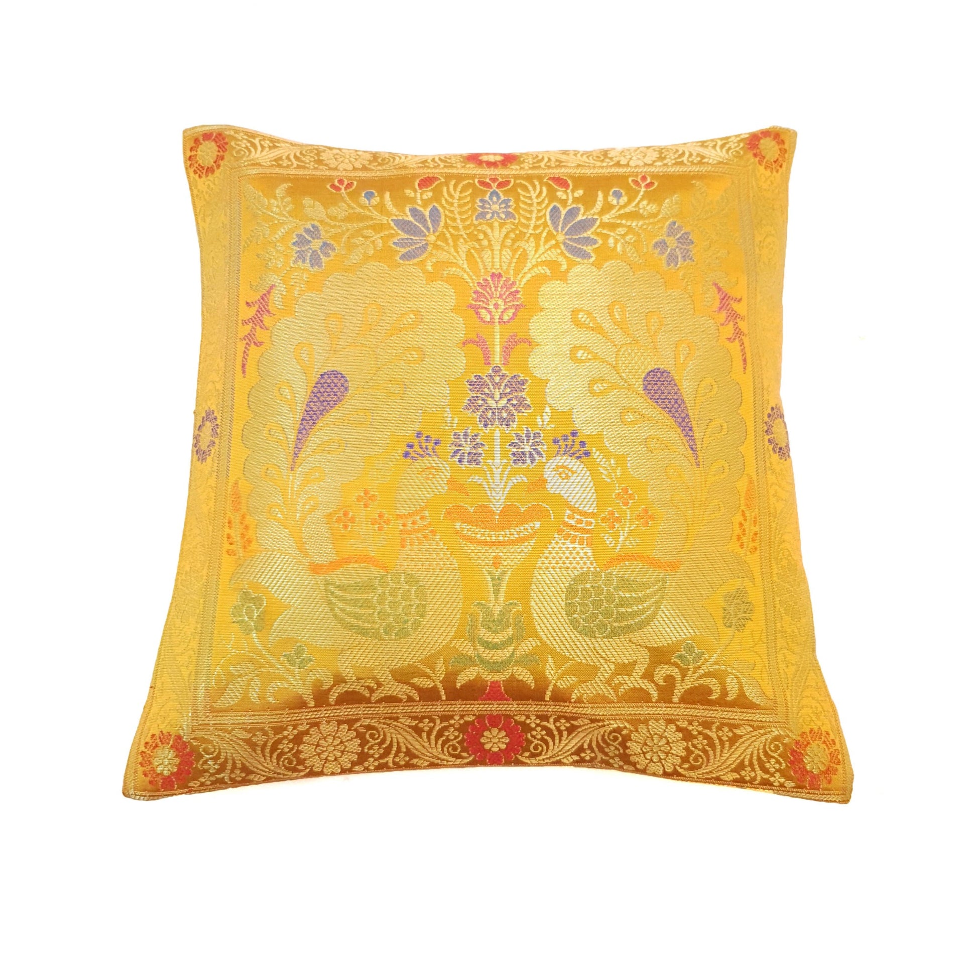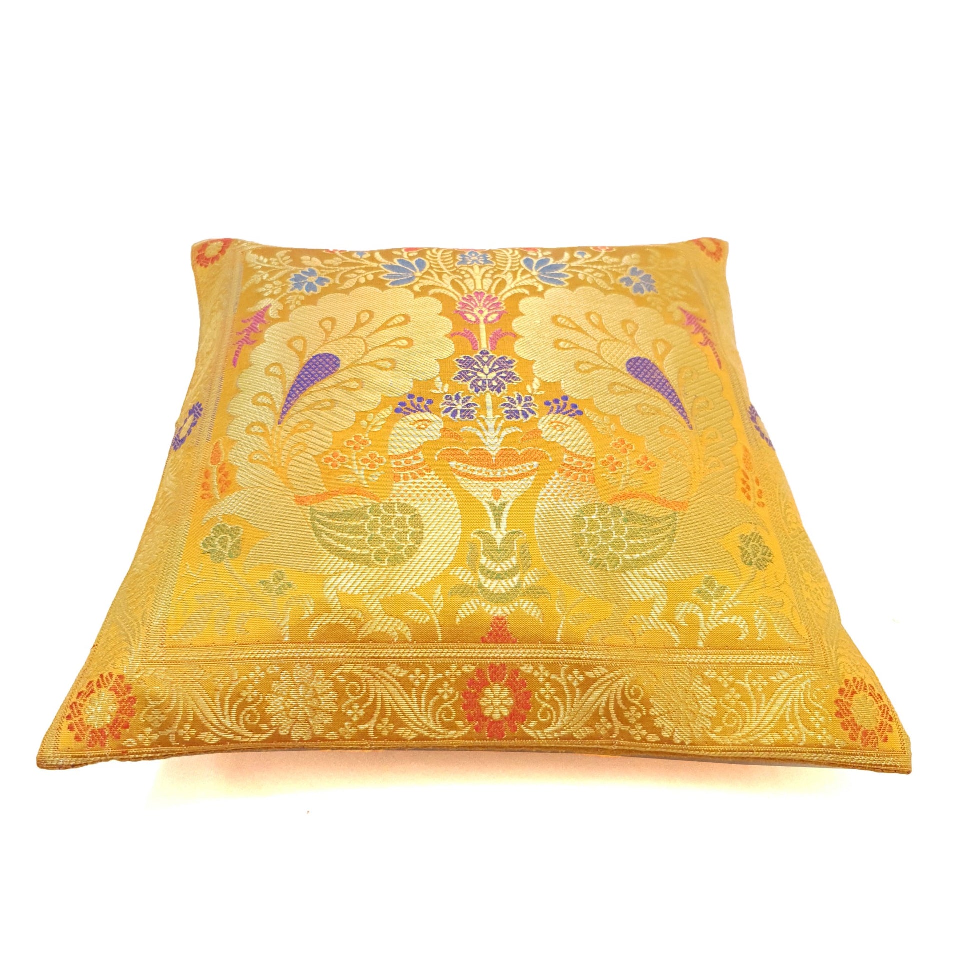 Mustard 12x12 Inch Cushion Cover Indian Banarasi Woven Peacock Zari Brocade Silk