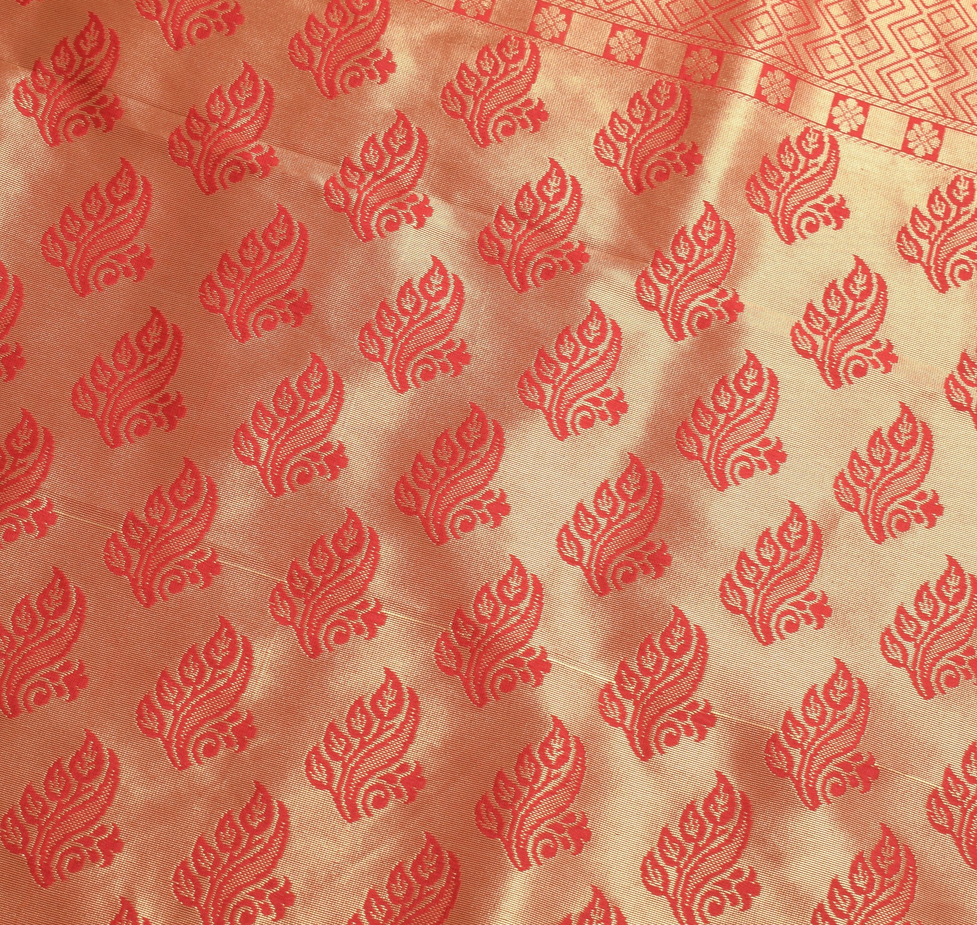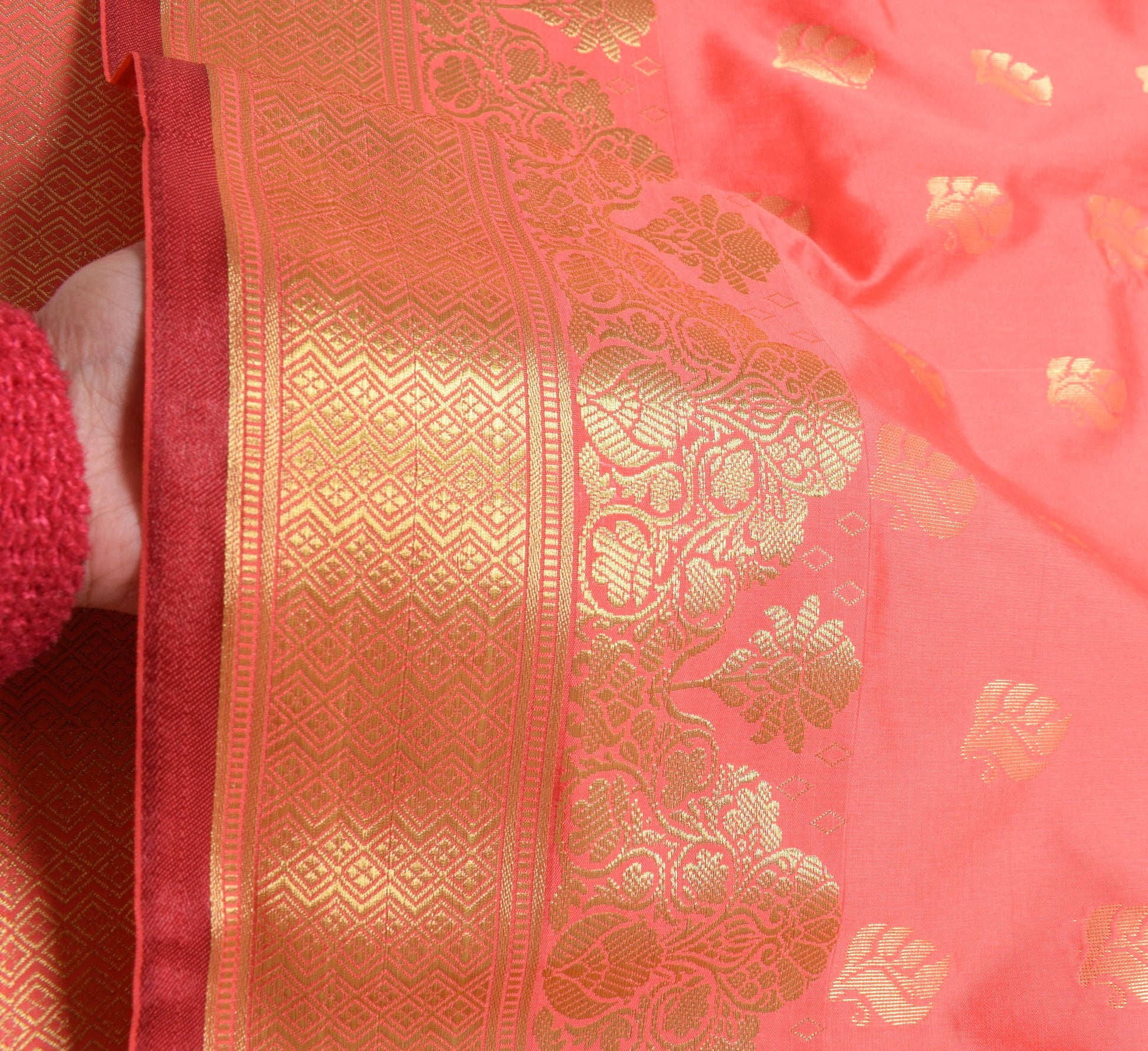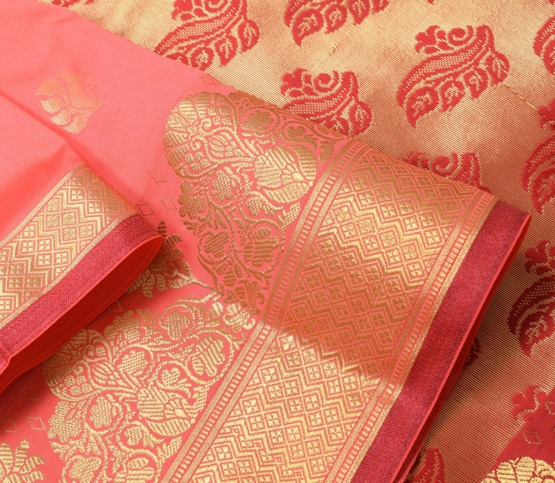 - Color: Peach with Maroon Pallu