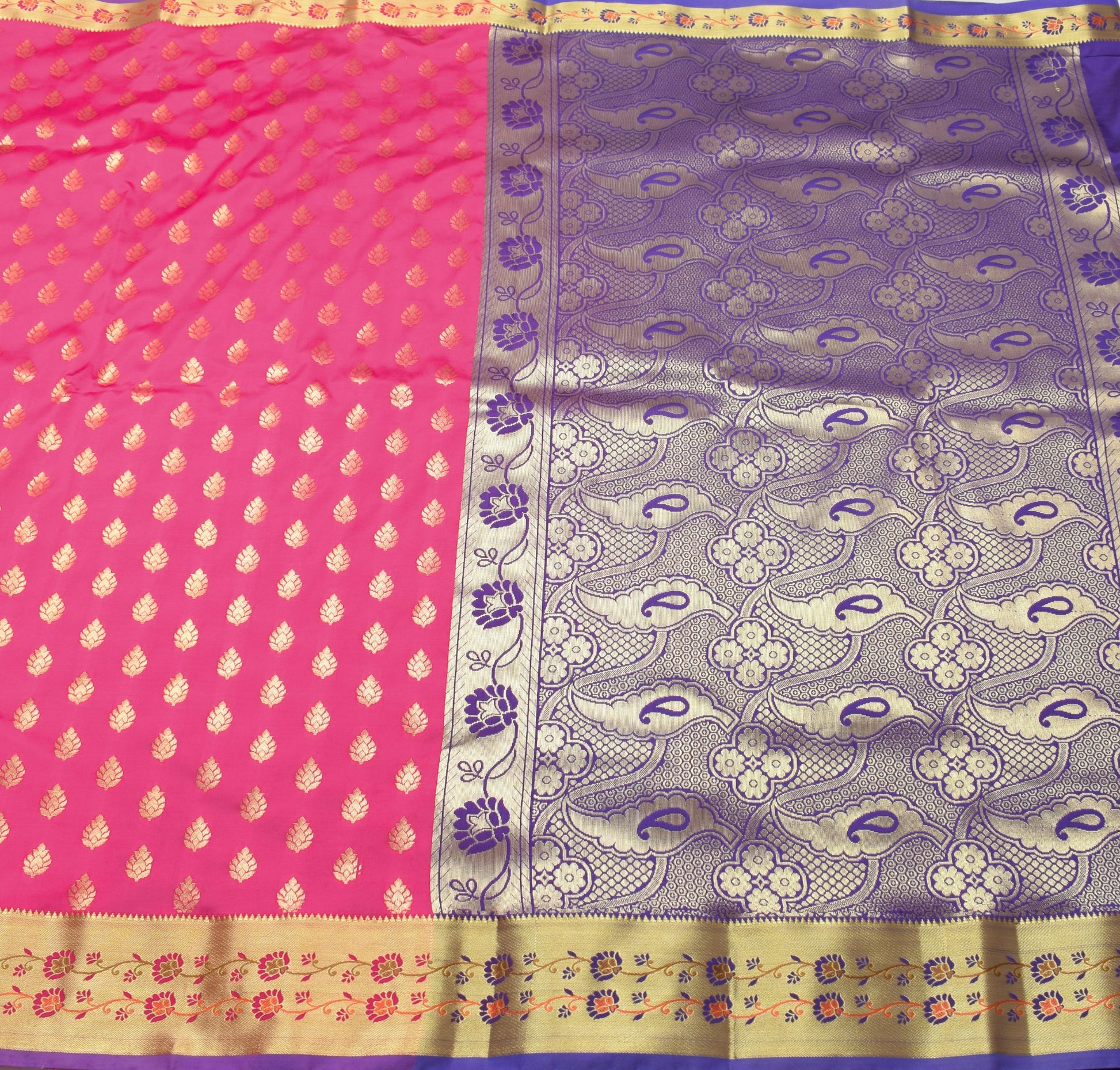 Step into timeless elegance with this Banarasi-inspired saree crafted in premium art silk. Featuring intricate zari-woven leaf motifs, a vibrant pink body, and a contrasting blue pallu and border, this saree captures the regal essence of traditional Indian wear. Lightweight at 630 grams, it drapes beautifully and comes with a matching 35-inch running blouse piece — perfect for festive occasions, weddings, or cultural celebrations. A touch of Banaras in every fold!