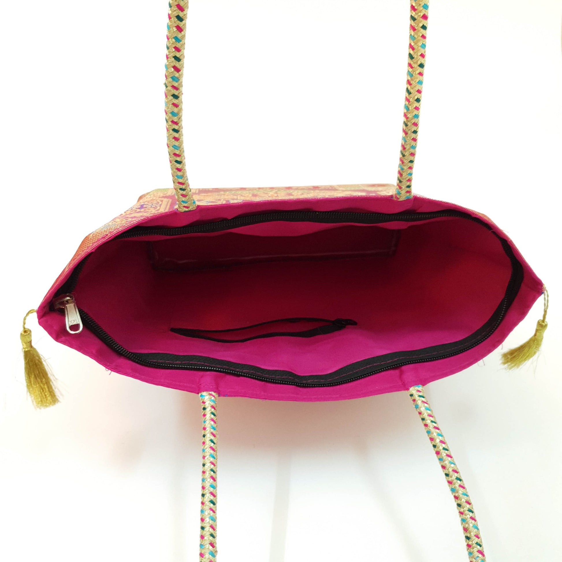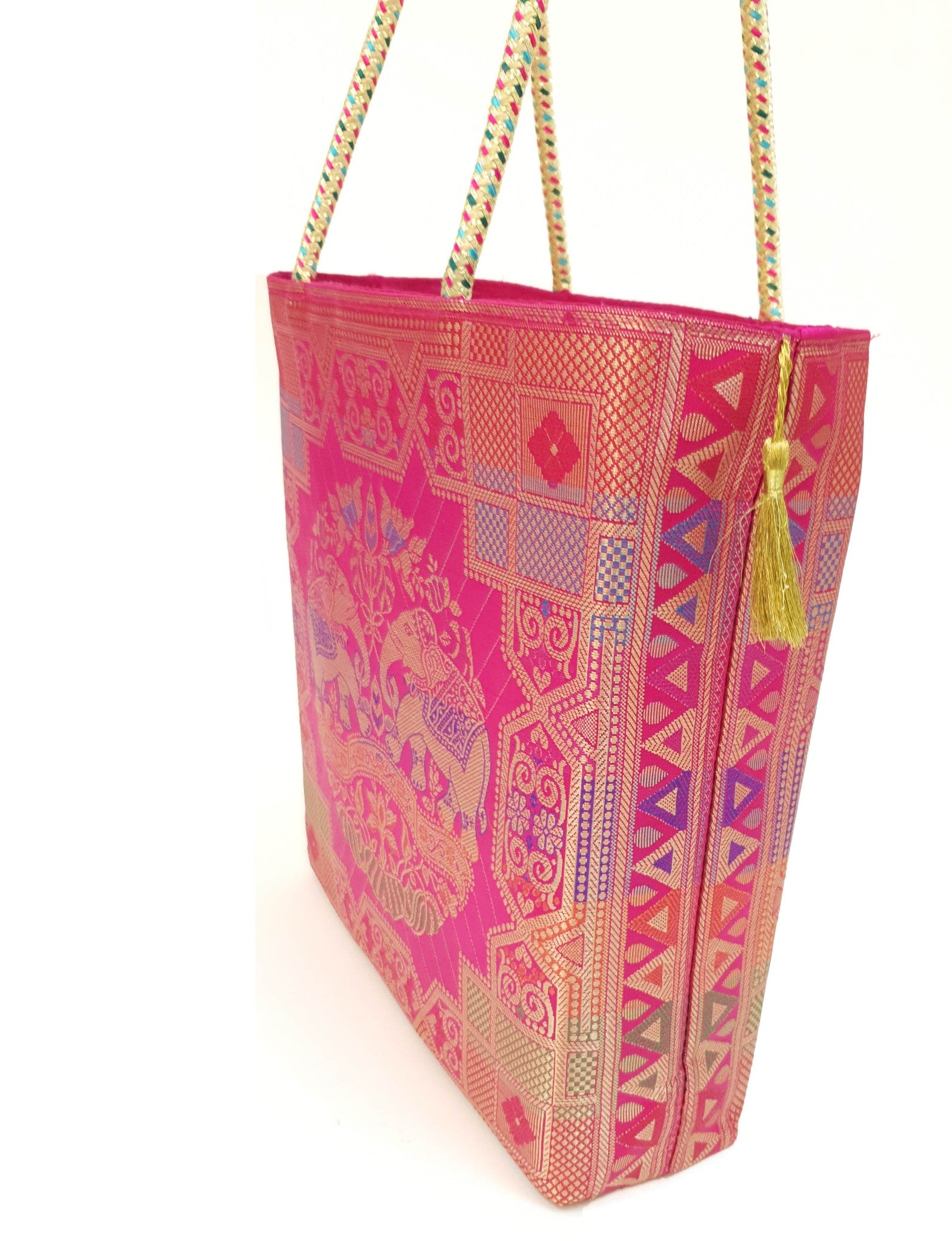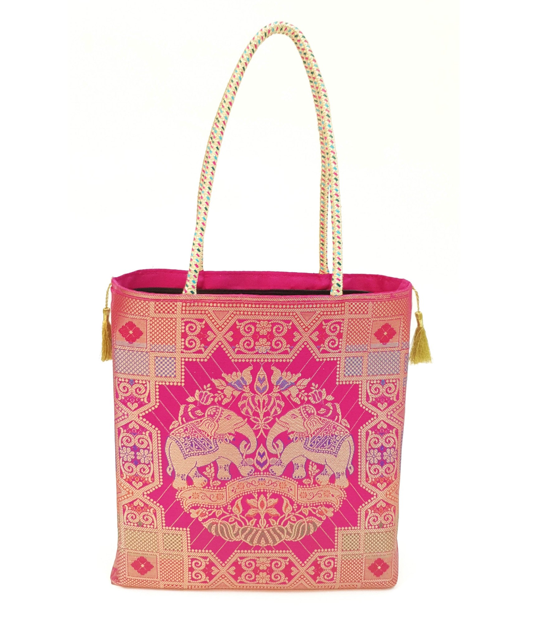 Pink Hand Bag Banarasi Zari Brocade Traditional Golden Tassels in Elephant Motif