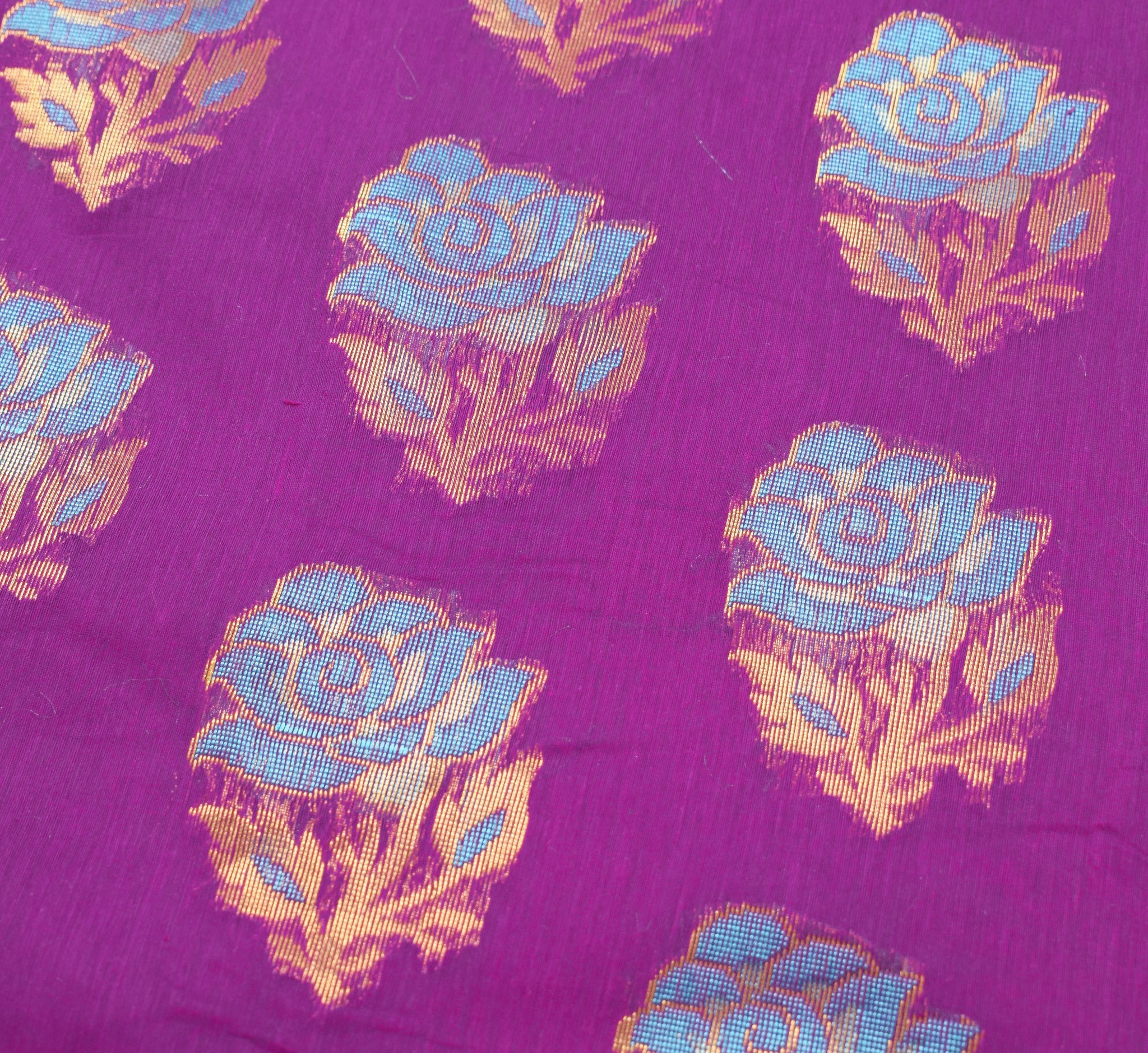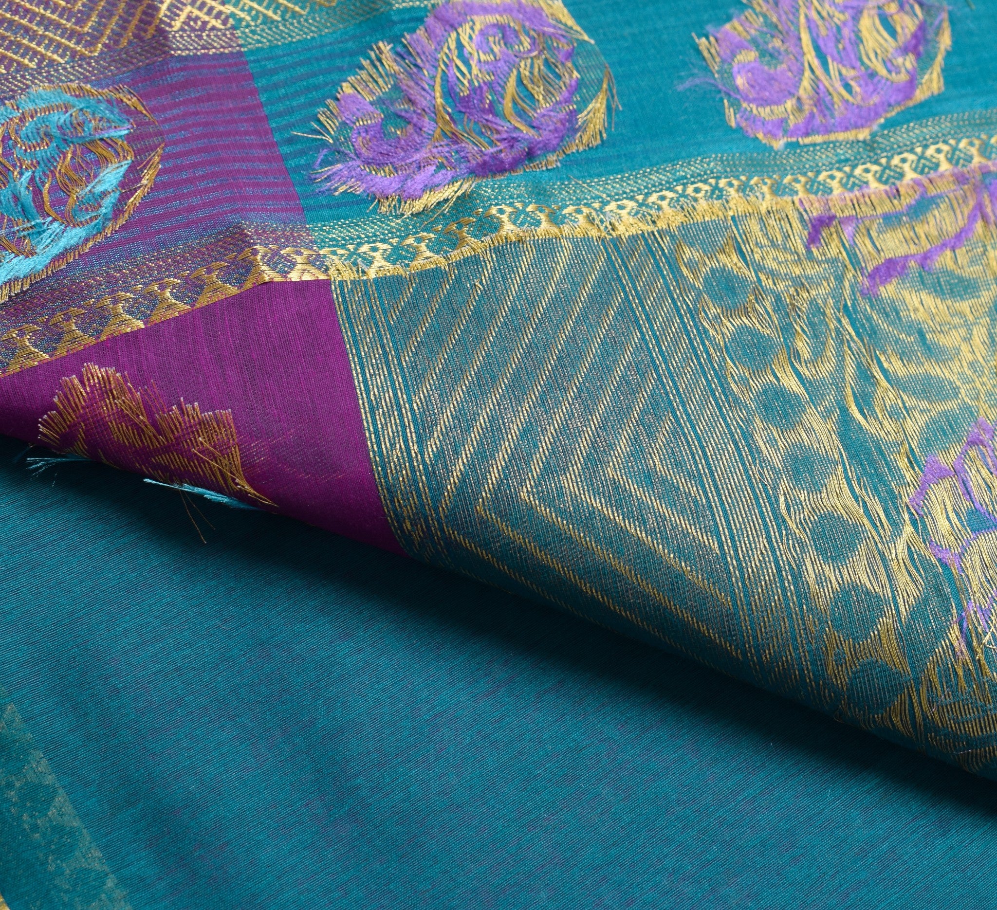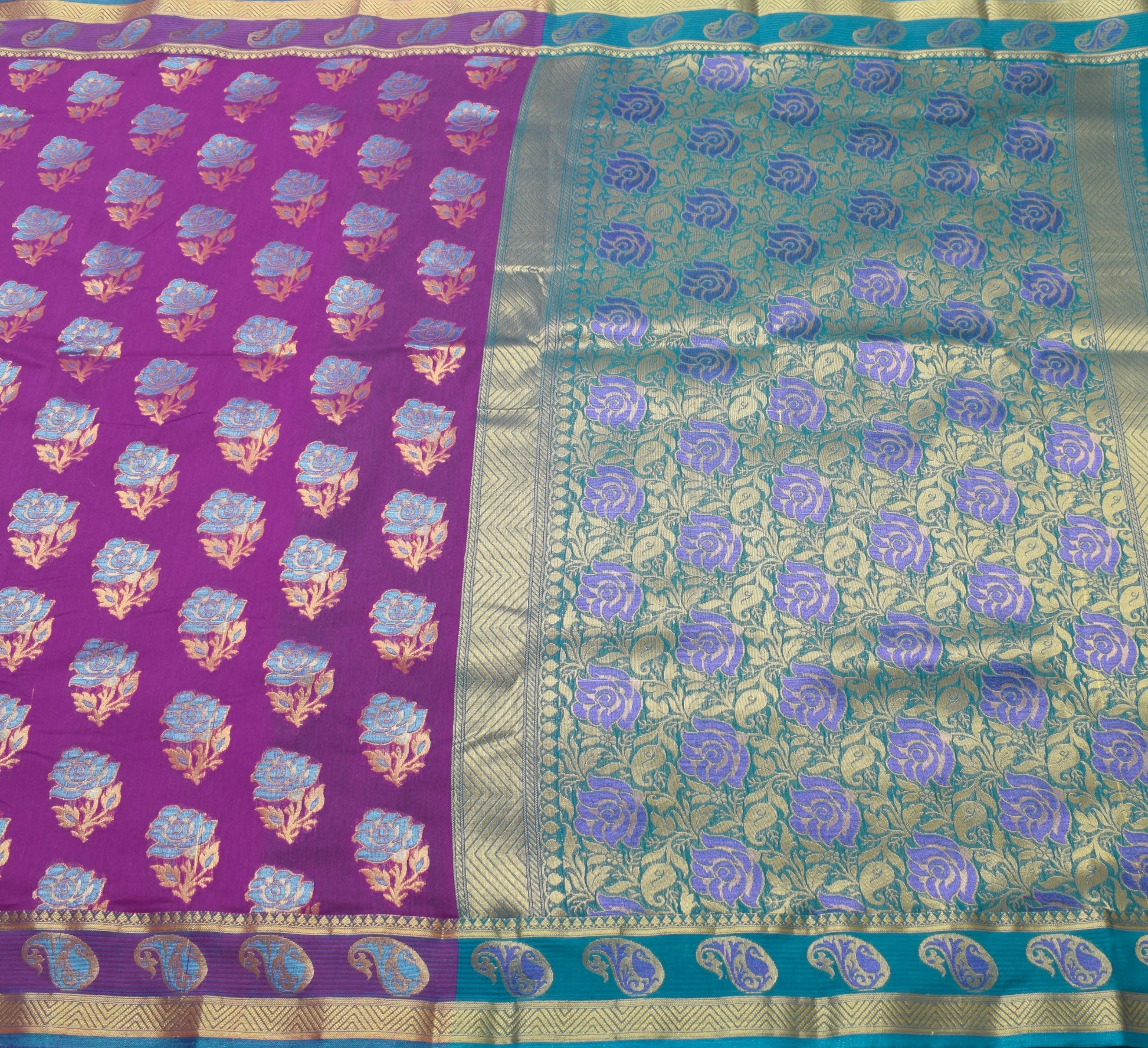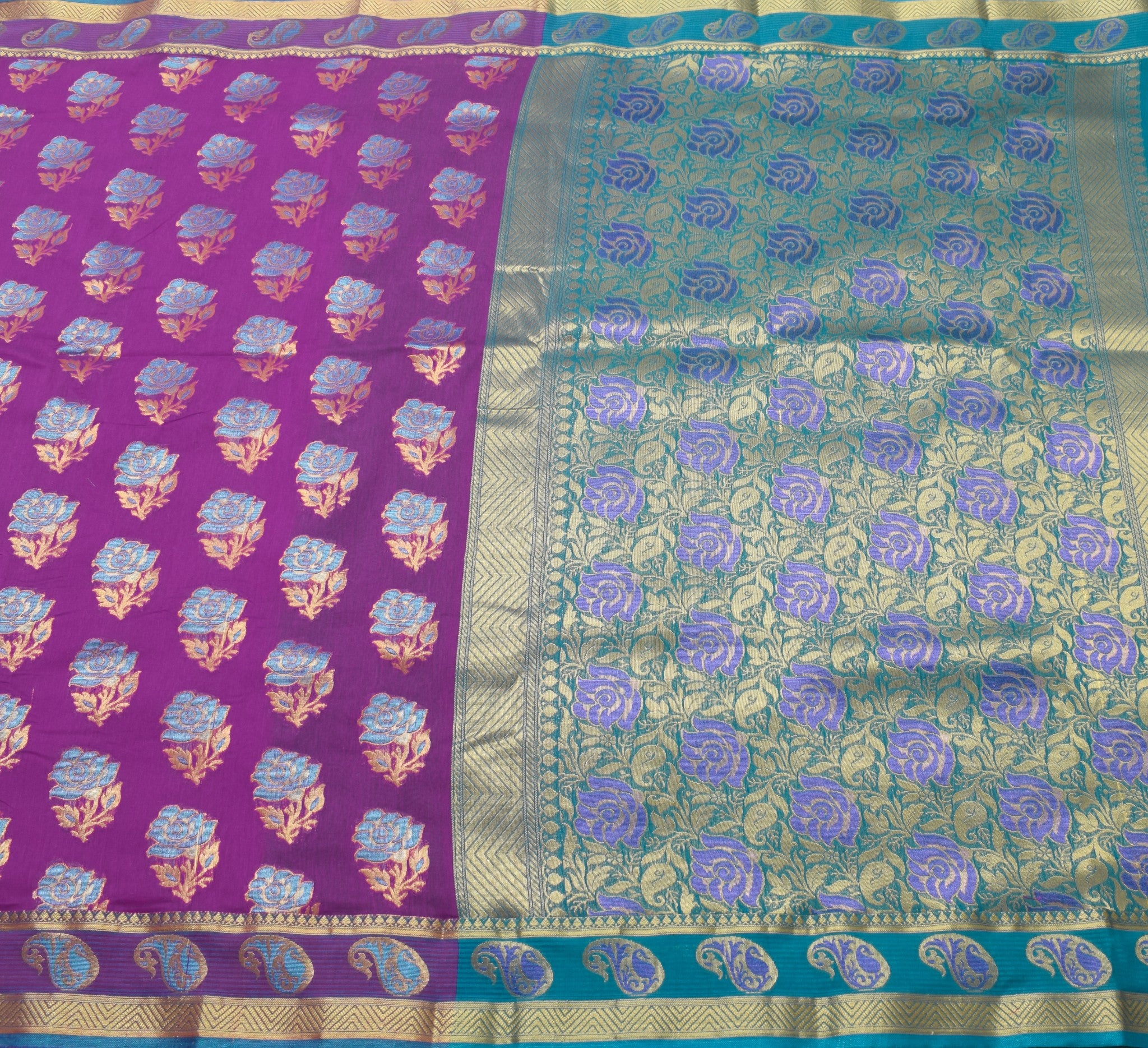 A regal combination of purple and blue, finished with intricate zari weaving—perfect for making a memorable statement.
