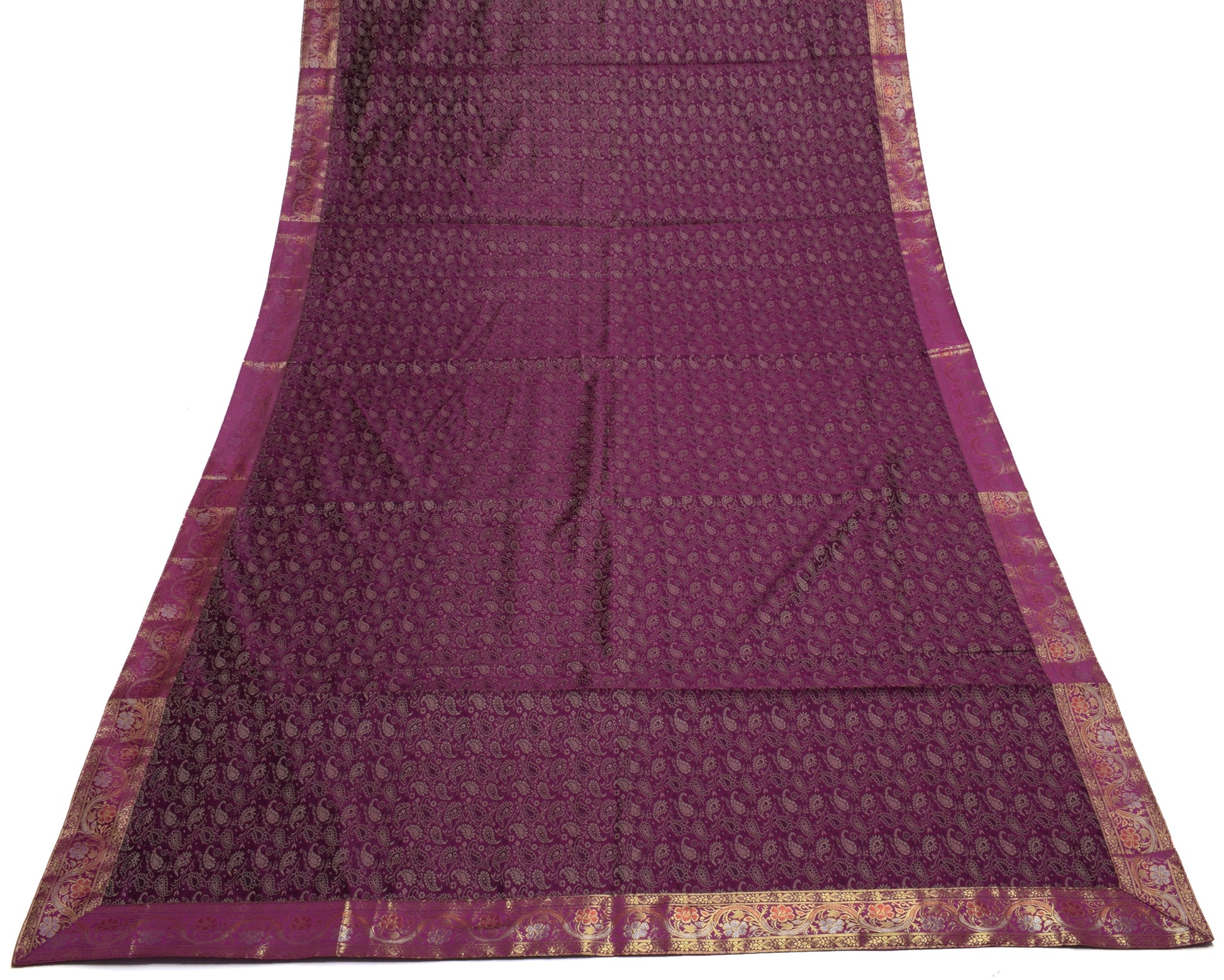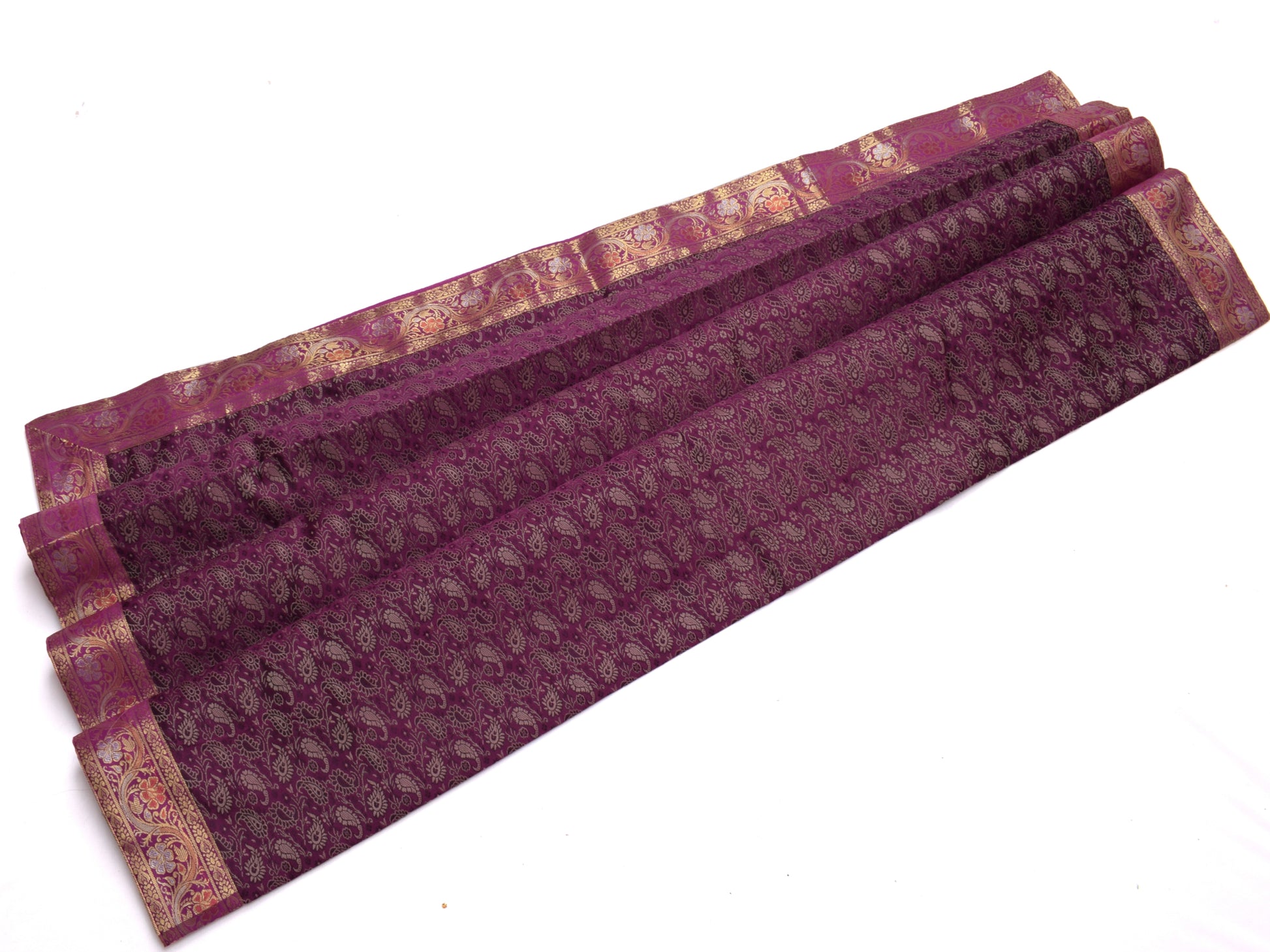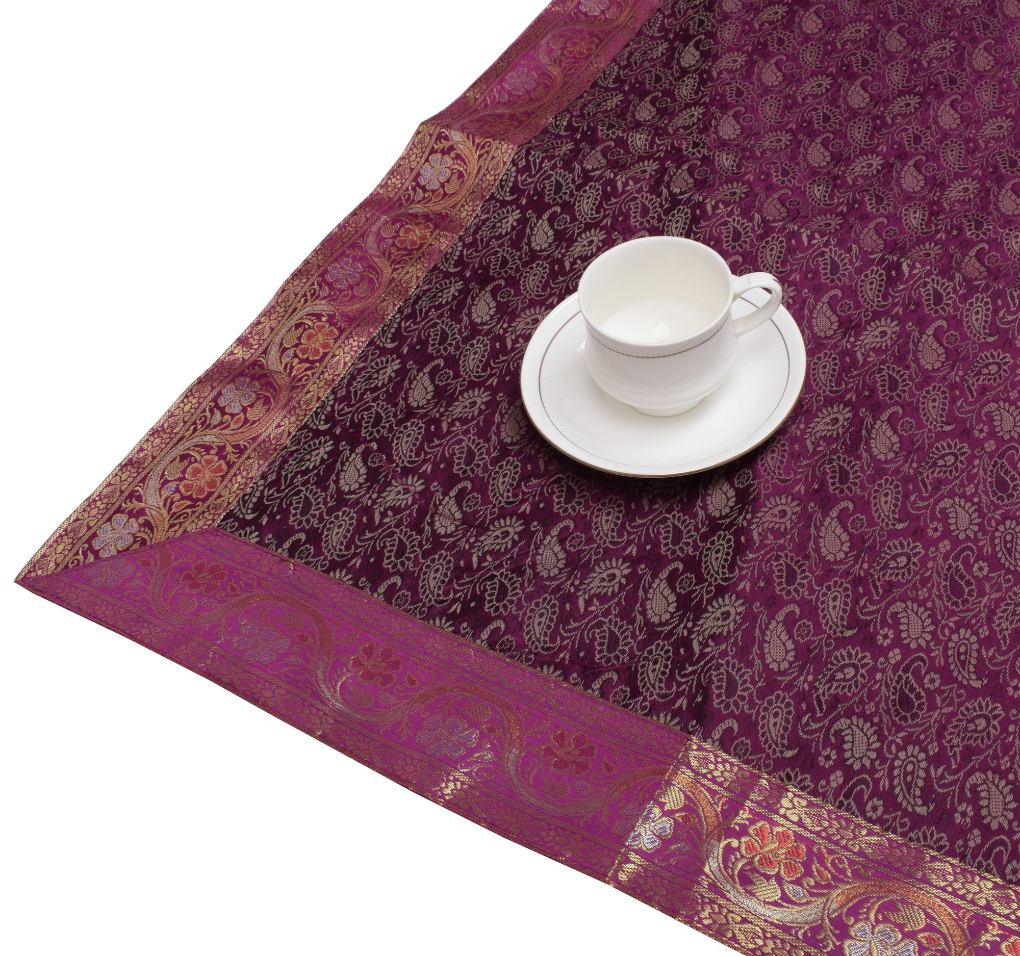 Indian Purple Table Top Cover Woven Zari Border Art Silk Brocade 88" x 47" Cloth