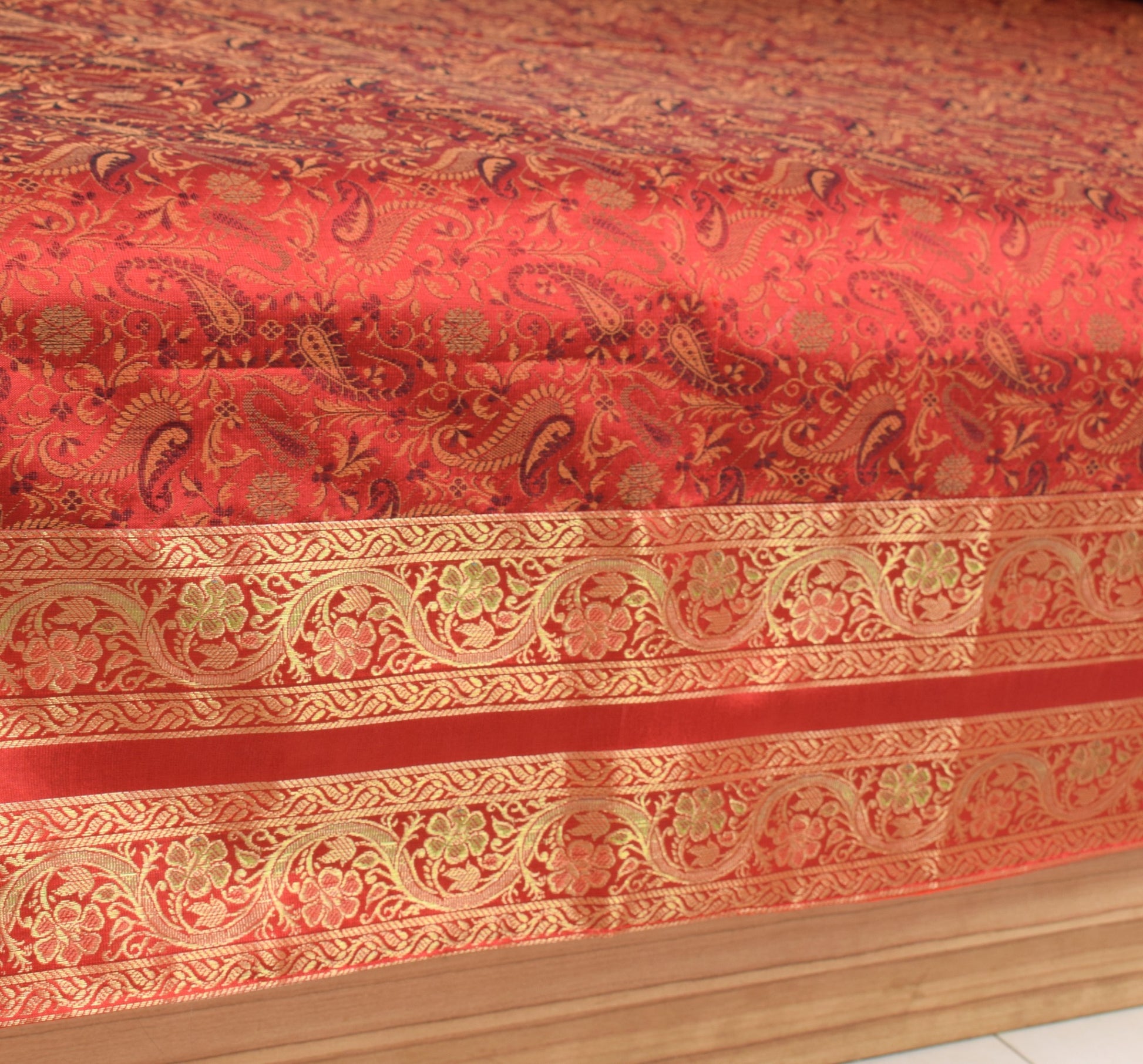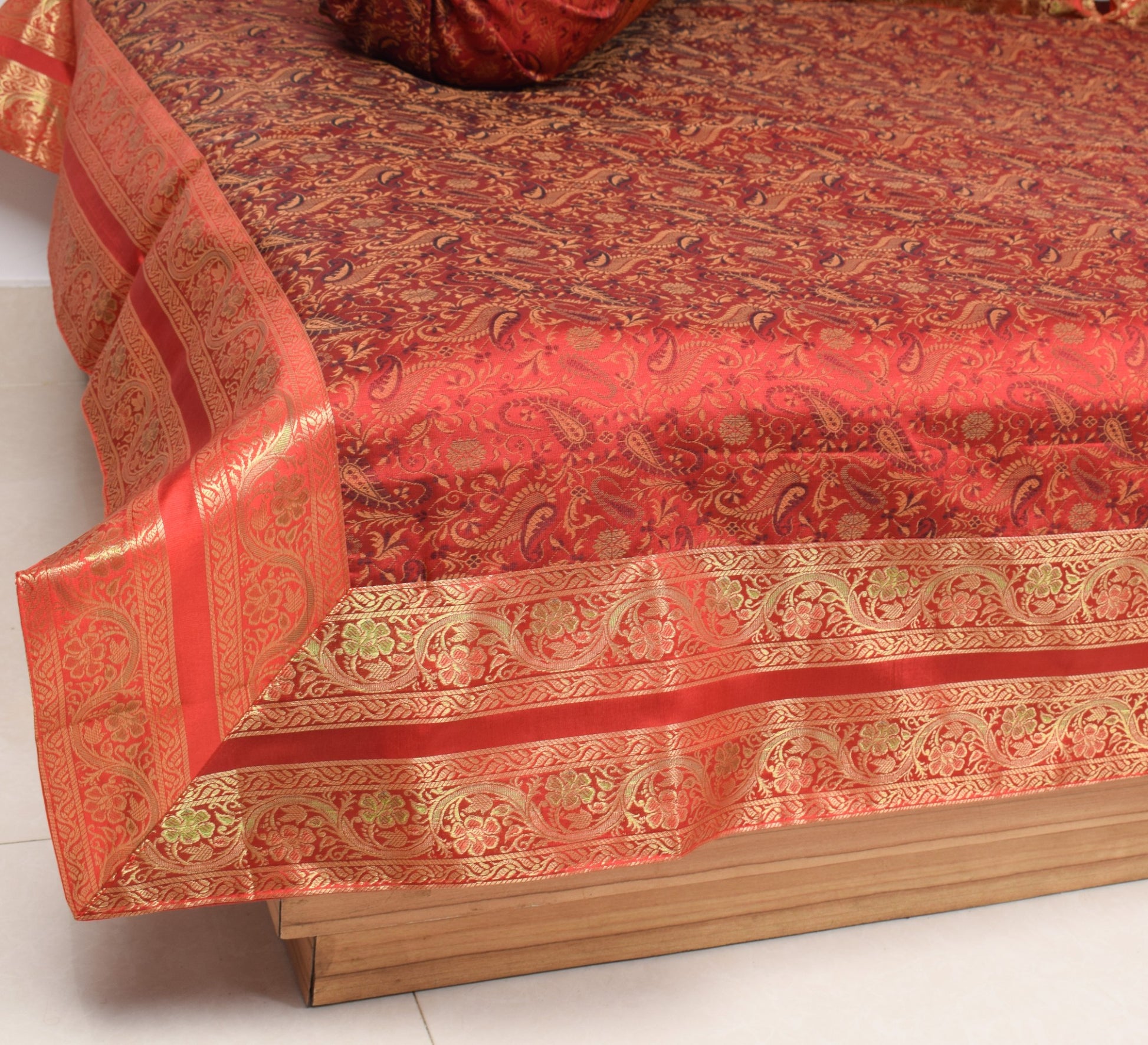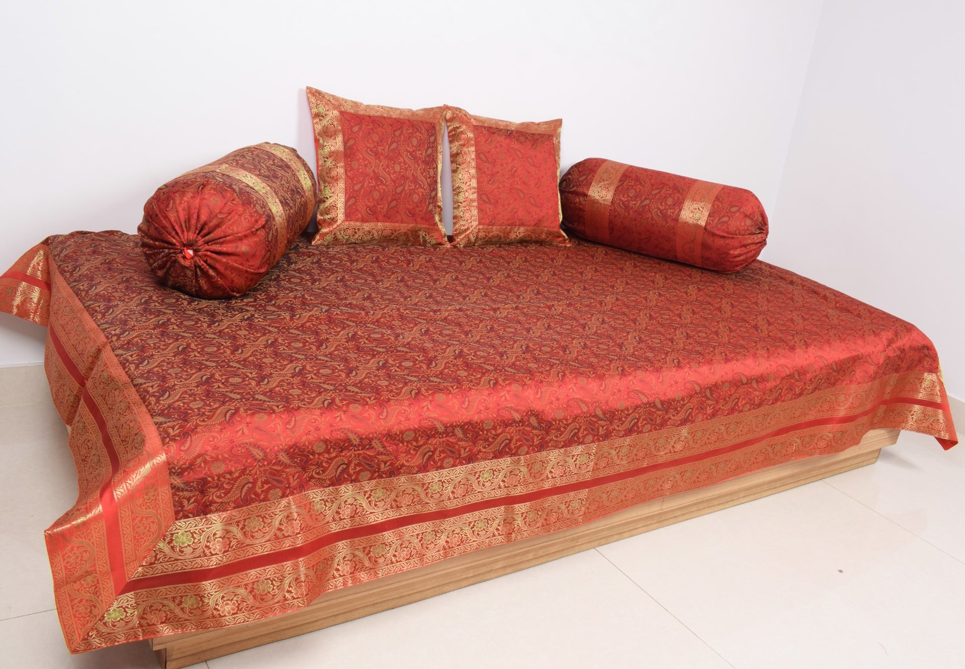 Red Banarasi Diwan Set– Silk Zari Brocade Indian Gift Cushions & Bolster Cover