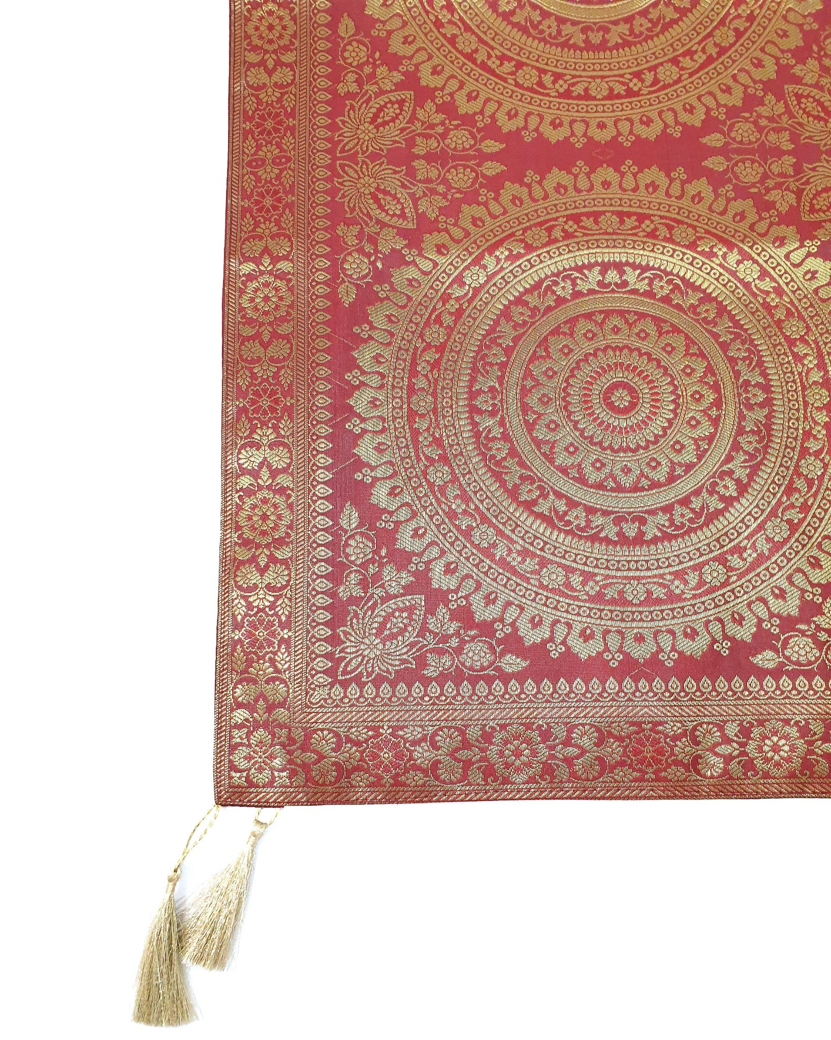 Banarasi Vastra Presents 16 Inch x 72 Inch Woven Golden Zari Brocade Banarasi Silk Table Runner with Woven Mandala Pattern Tanchoi Fabric in the center Part of the cover with all Side Floral Zari Woven Border with 4 side Golden Zari Tassel. this Runner comes with Matching color Back lining fabric.