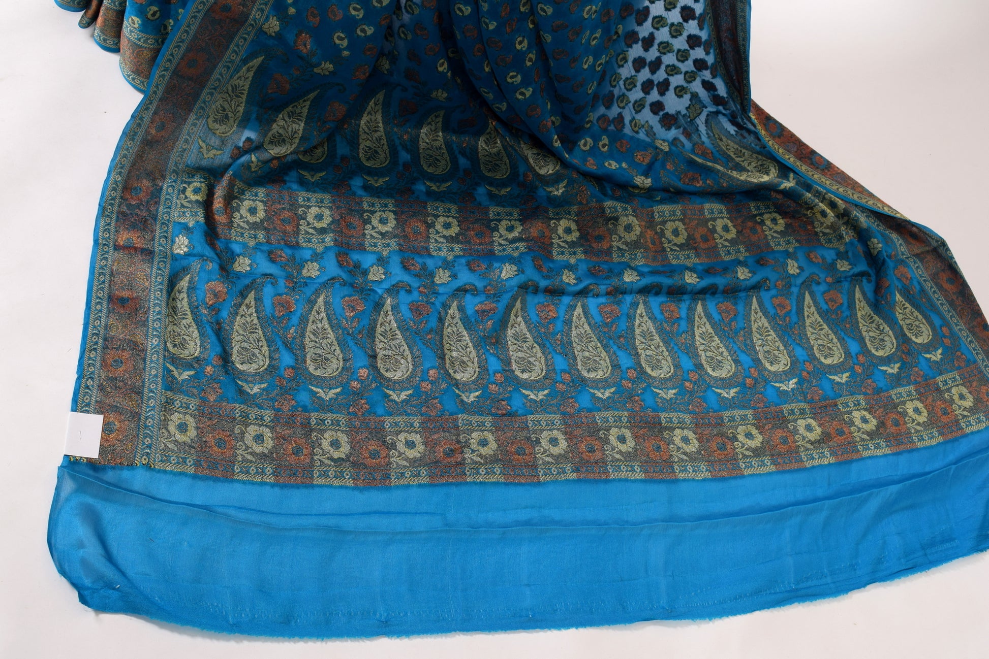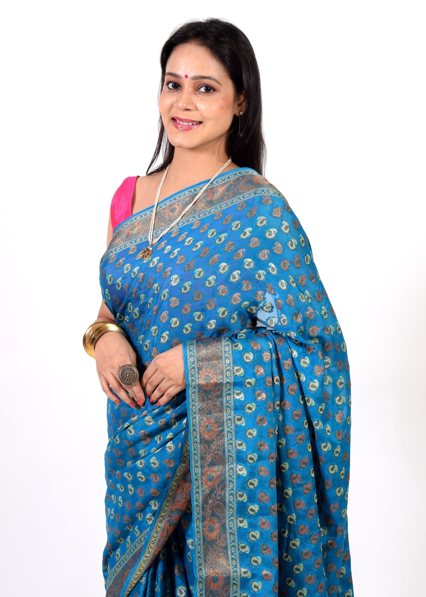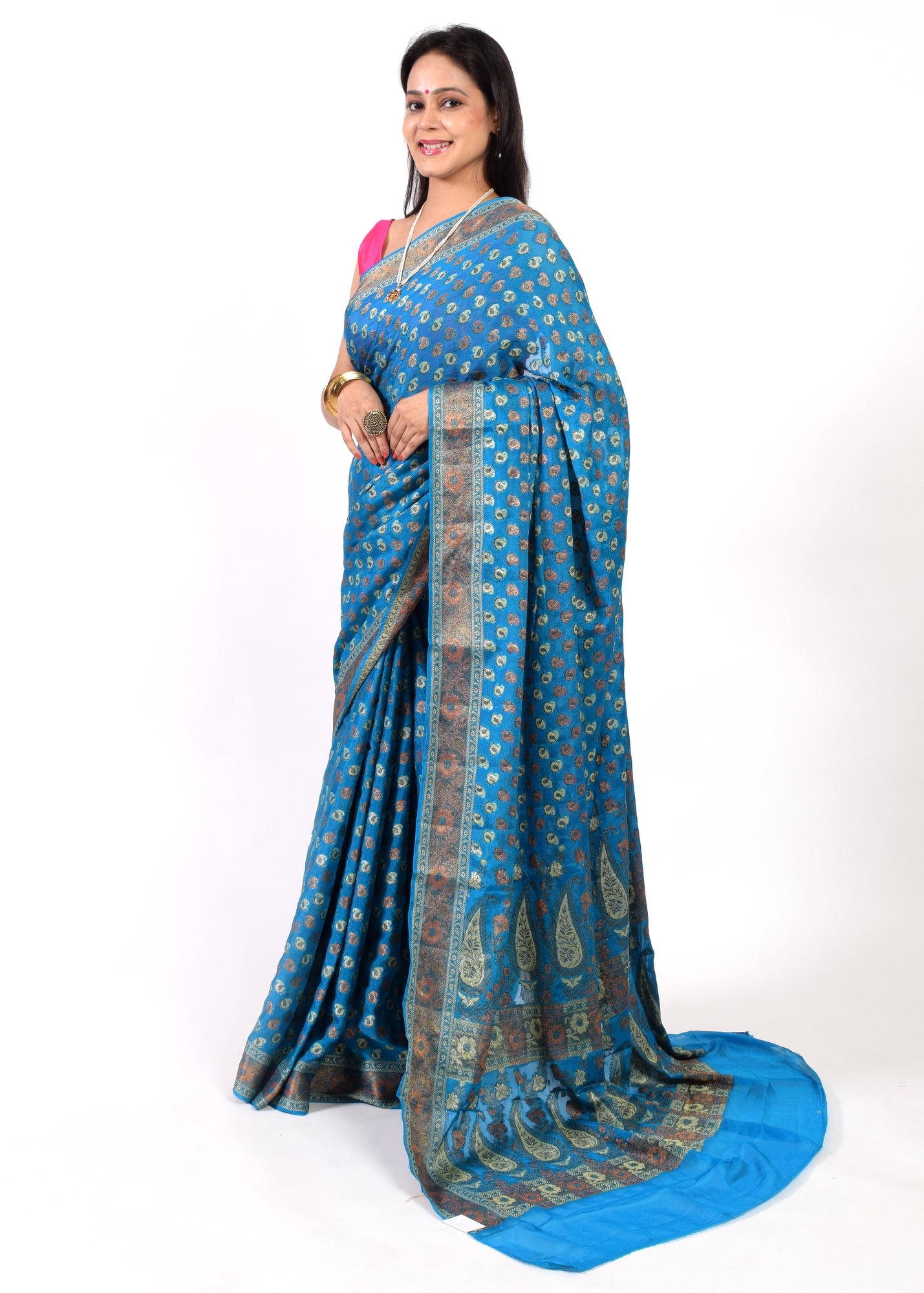 Banarasi Vastra Presents 100% Pure Khaddi Chiffon Silk Banarasi Handloom Saree in Teal Blue Color with Zari Woven Small Paisley Motifs Pattern in the center part of the saree Floral Zari Border & Rich Pallu.