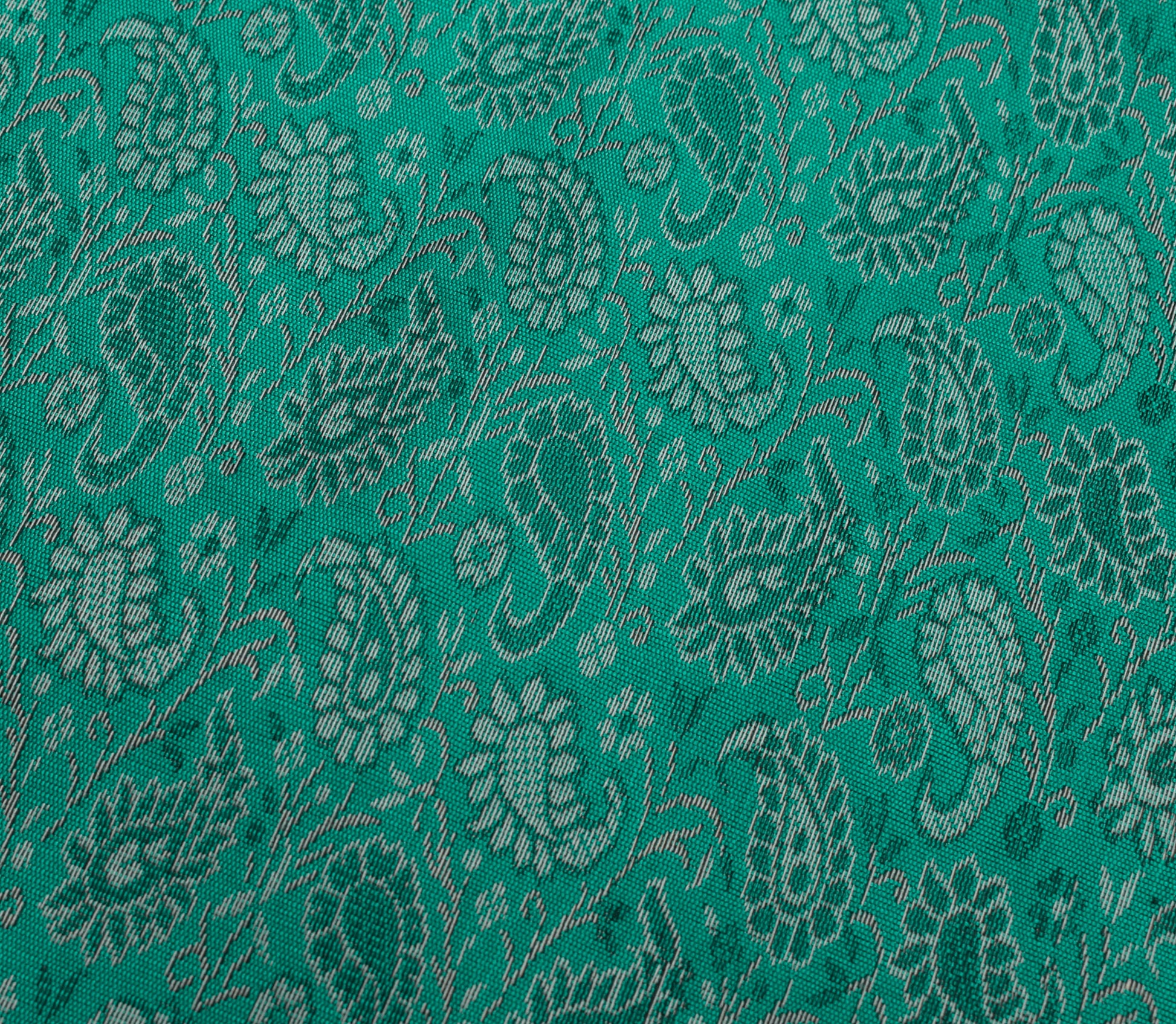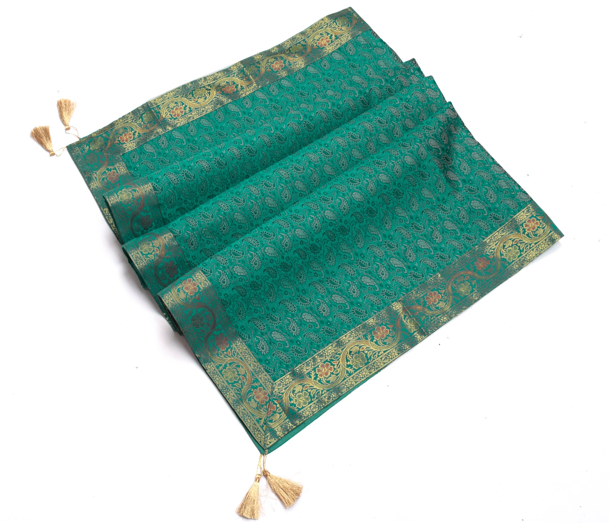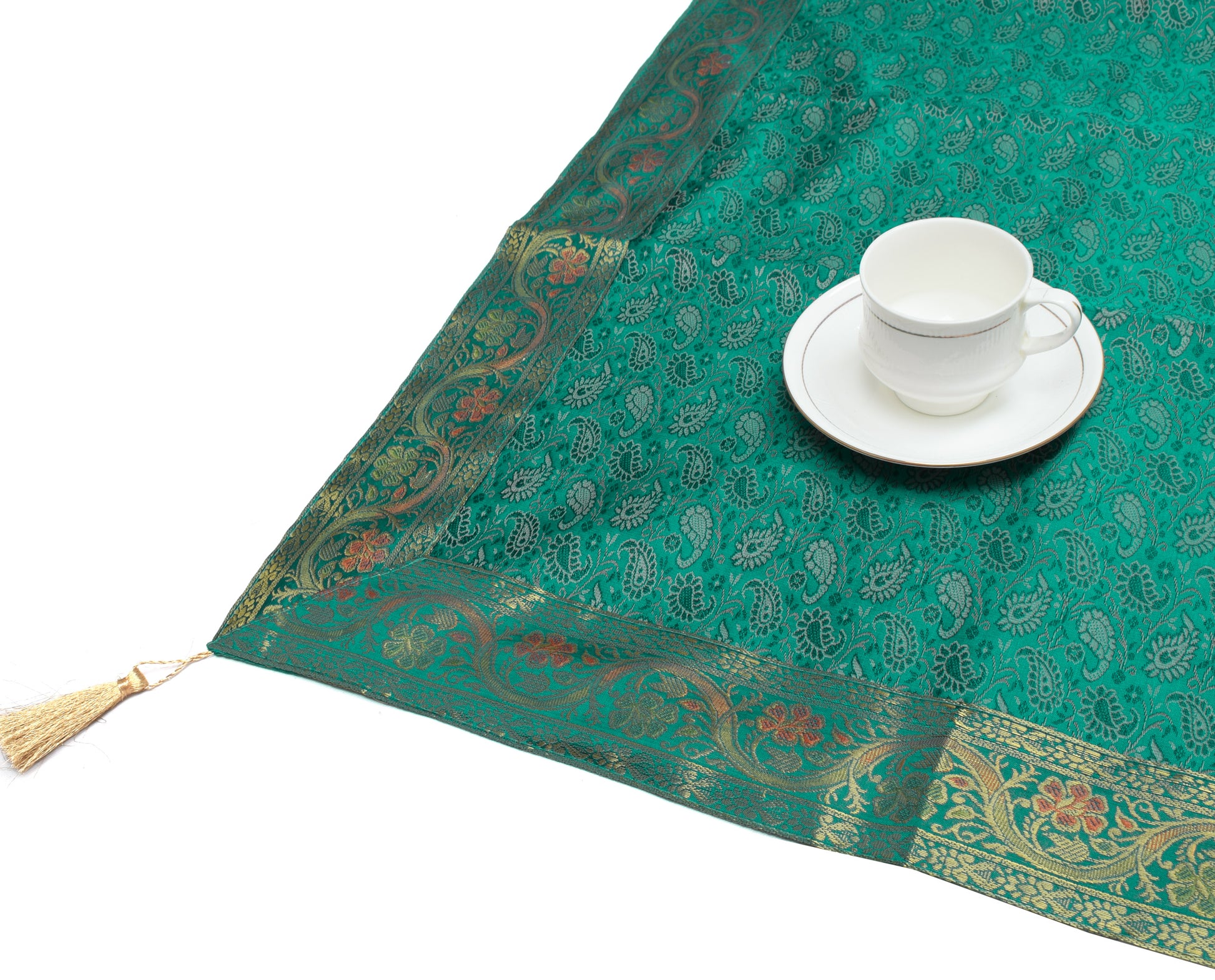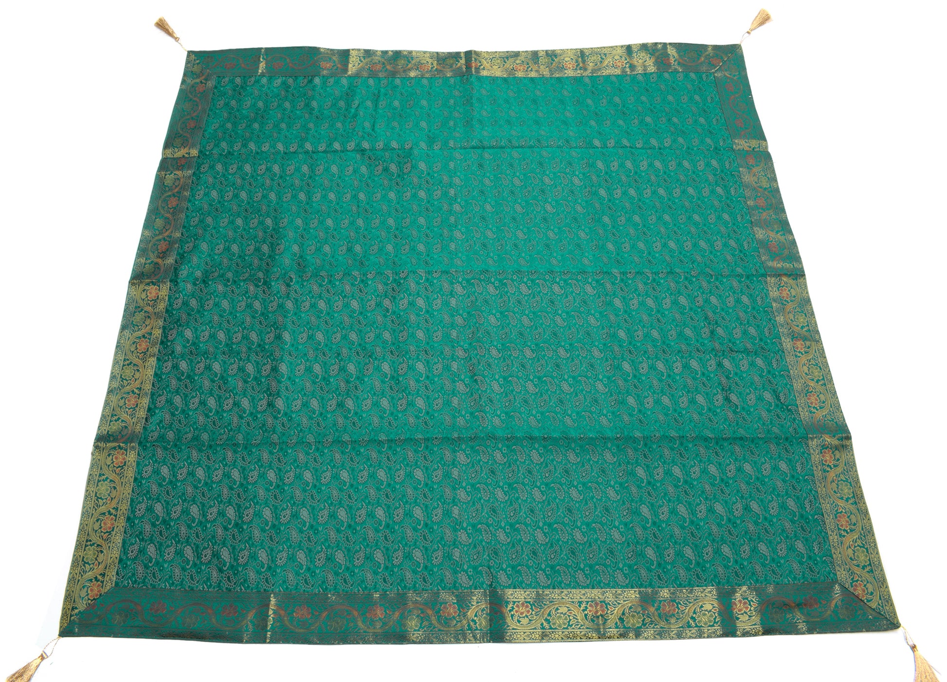 48 Inch Square Table Top Cover Teal Green Woven Zari Border Silk Brocade Cloth