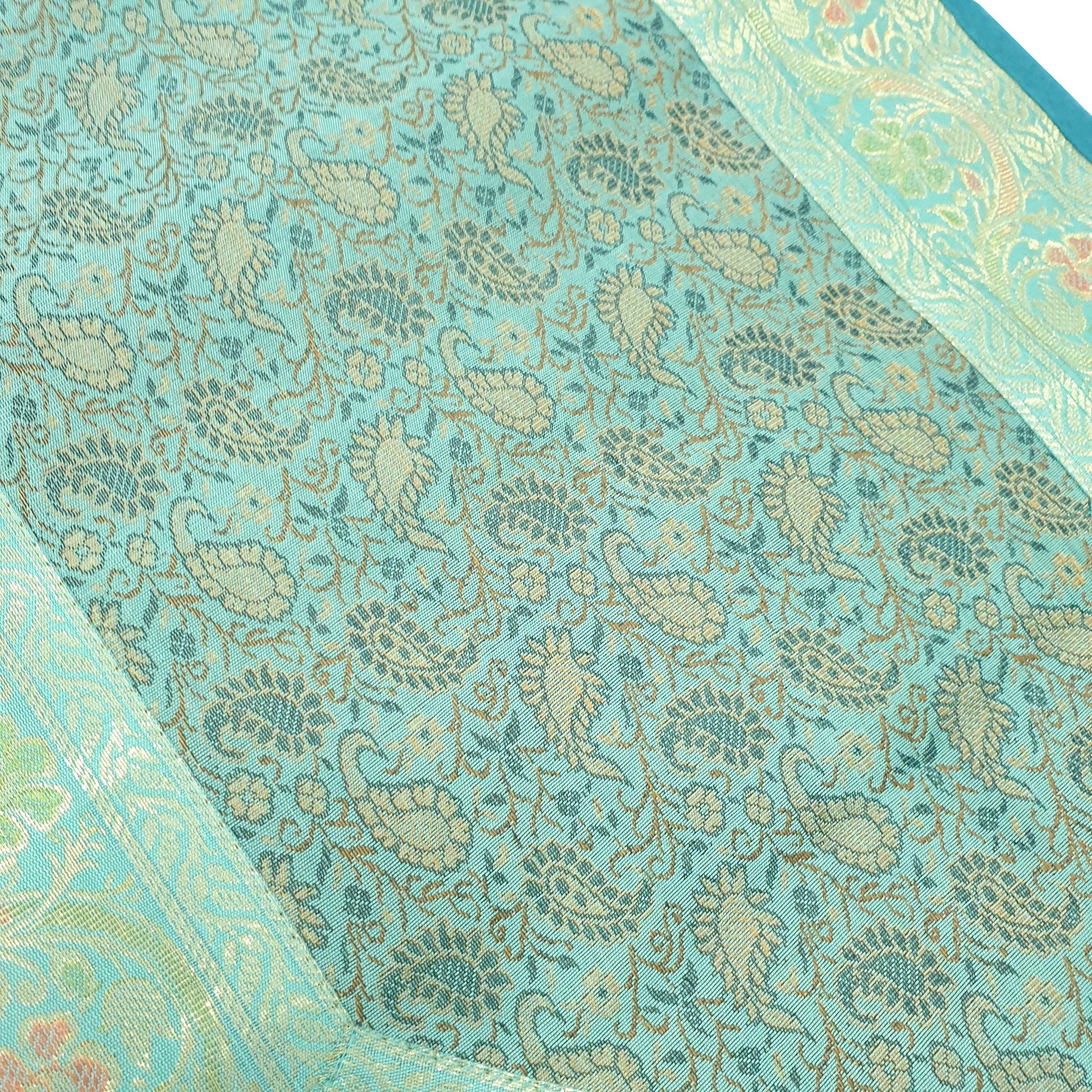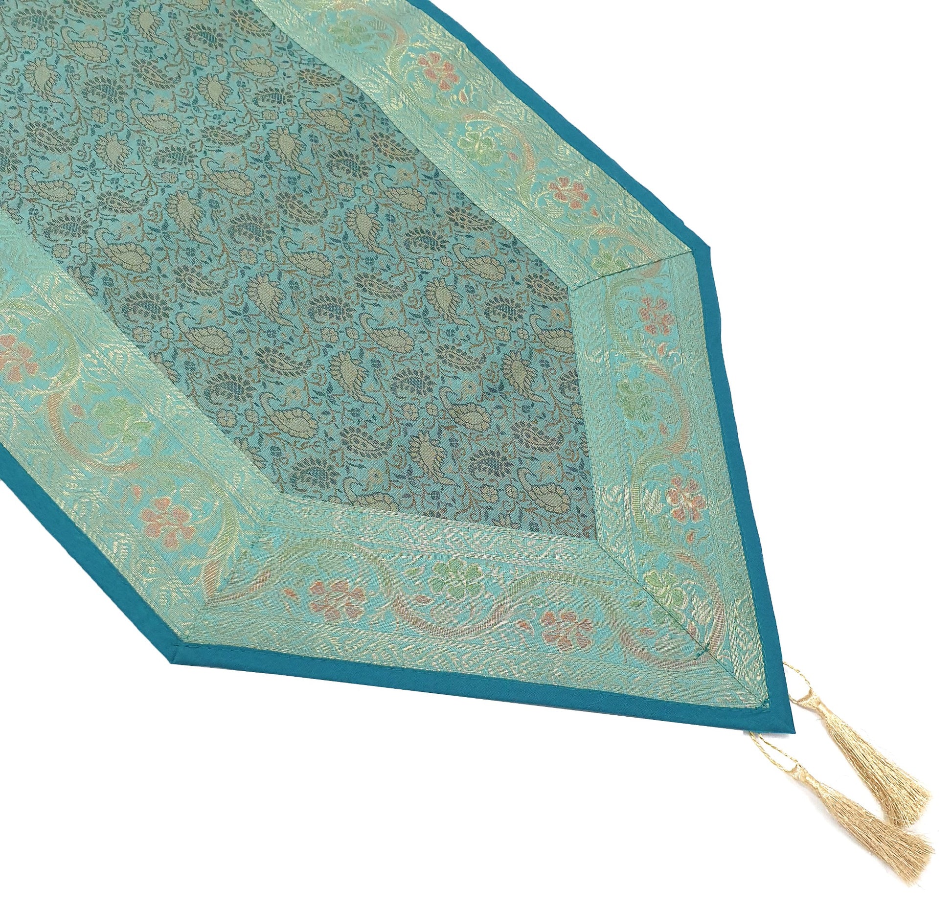 Teal Green Indian Banarasi Table Runner Silk Brocade Paisley Dining Decor Cloth