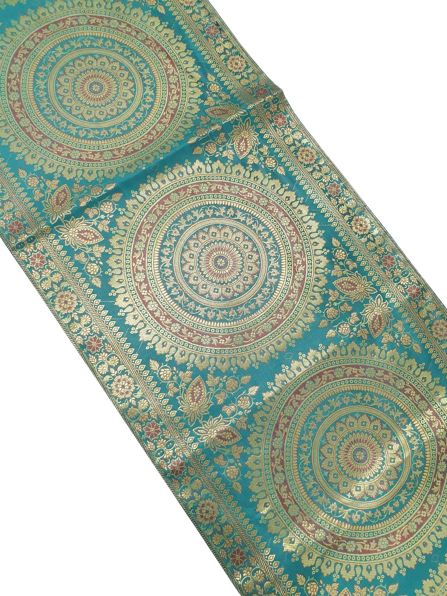 Teal Green Table Runner 72x16" Banarasi Silk Brocade Mandala Dining Decor Cloth