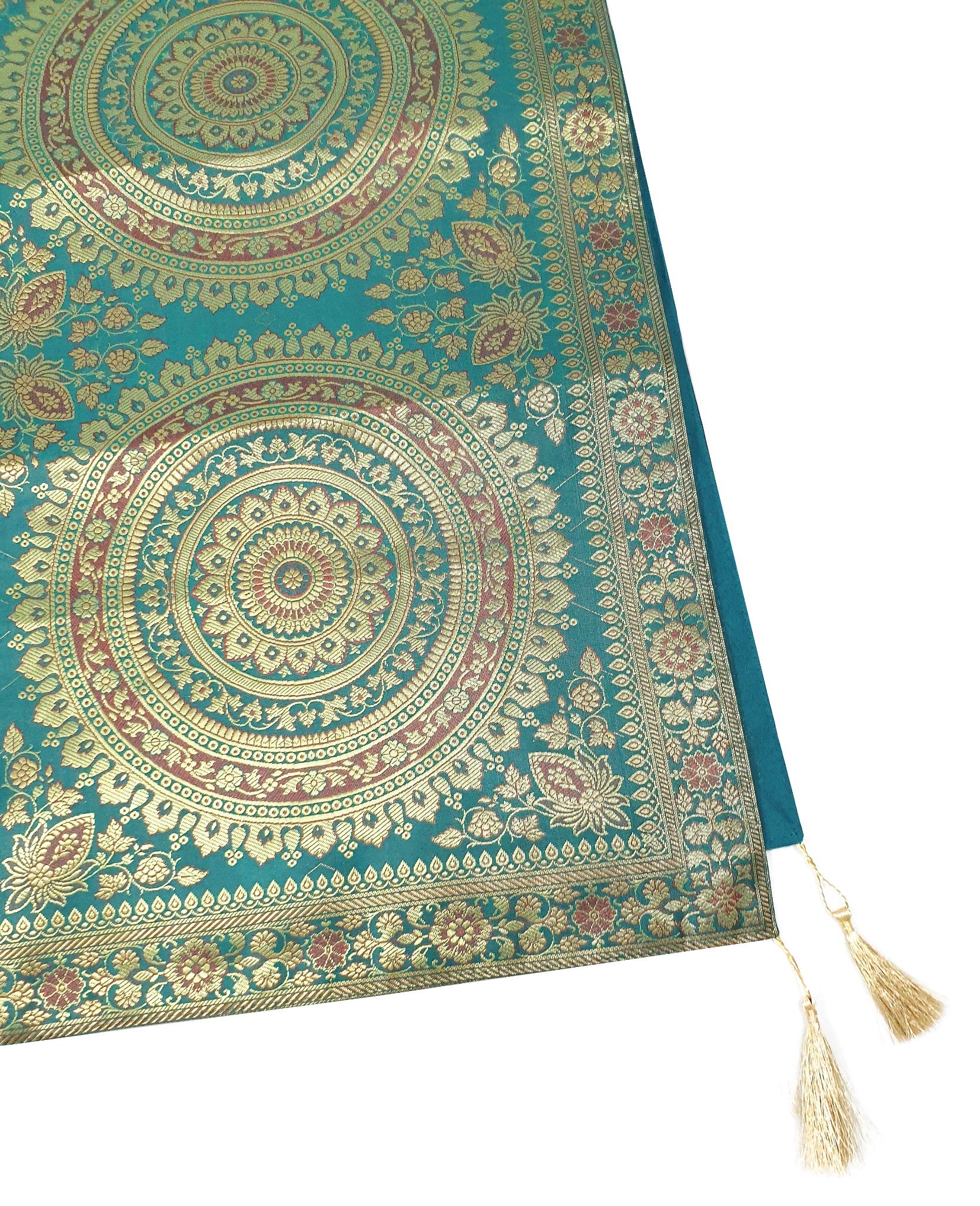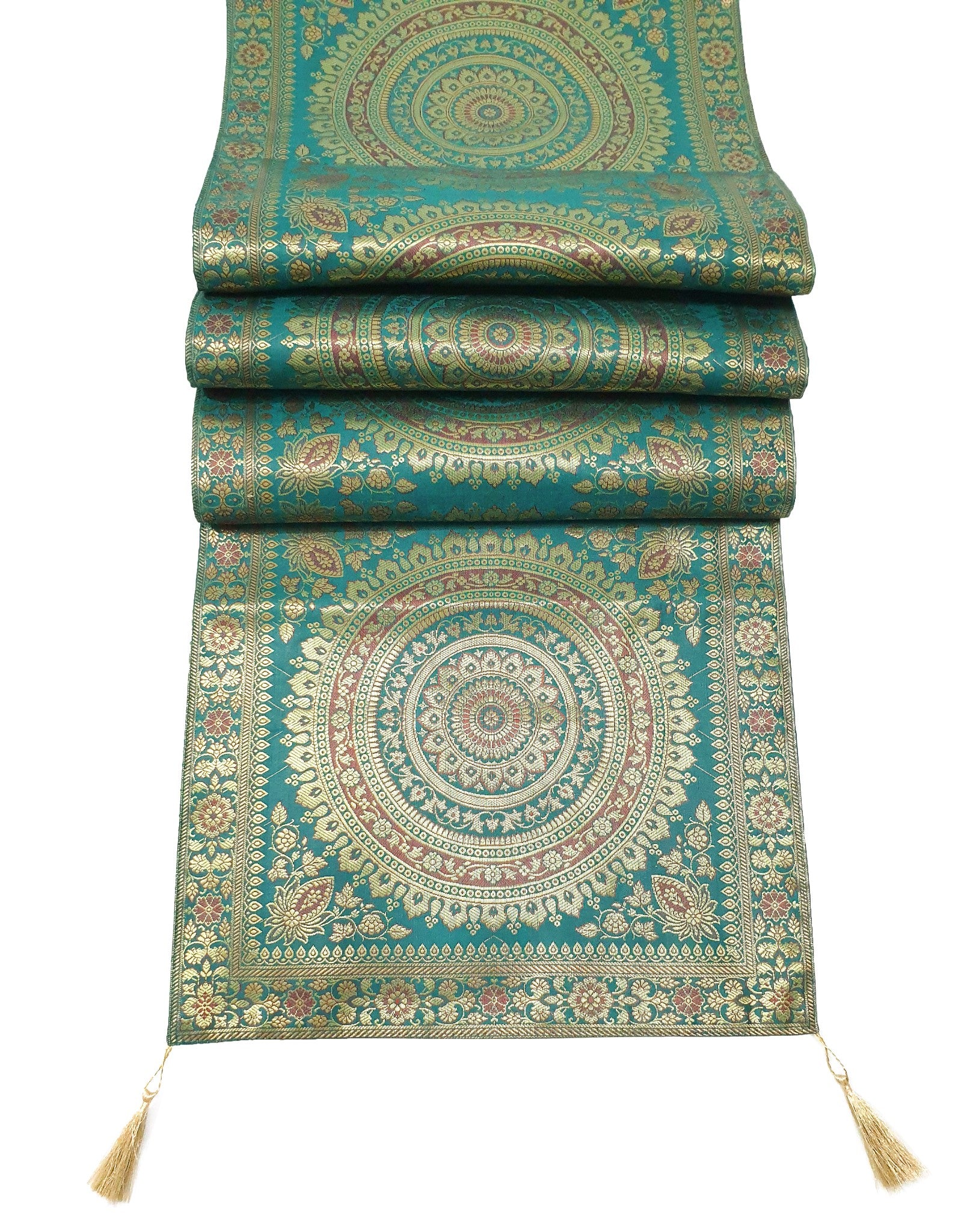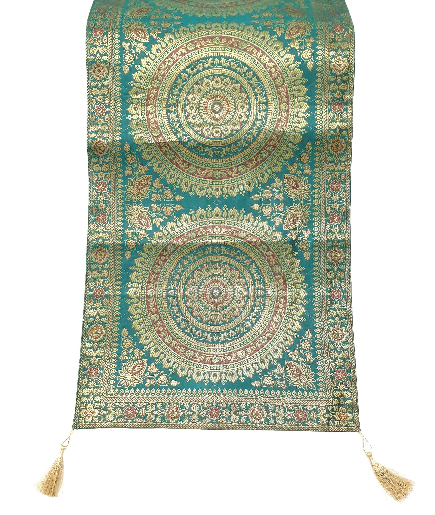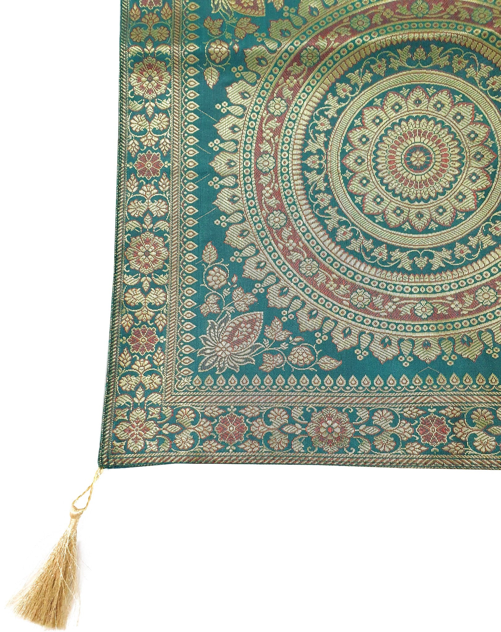 Banarasi Vastra Presents 16 Inch x 72 Inch Woven Golden Zari Brocade Banarasi Silk Table Runner with Woven Mandala Pattern Tanchoi Fabric in the center Part of the cover with all Side Floral Zari Woven Border with 4 side Golden Zari Tassel. this Runner comes with Matching color Back lining fabric.