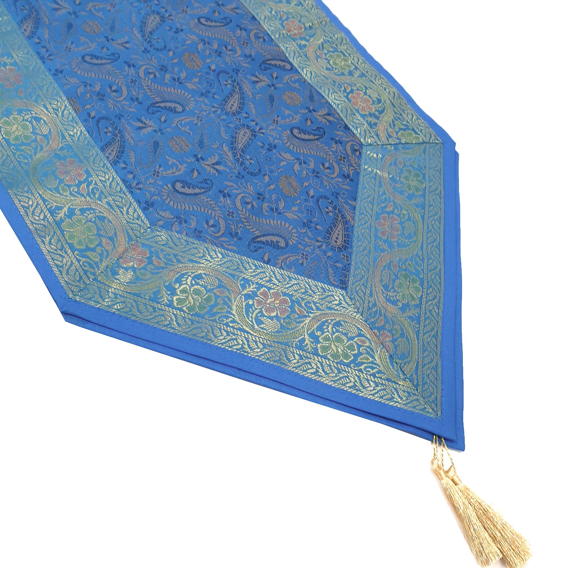 Turq. Blue Banarasi Table Runner Silk Brocade Paisley Dining Decor Indian Cloth