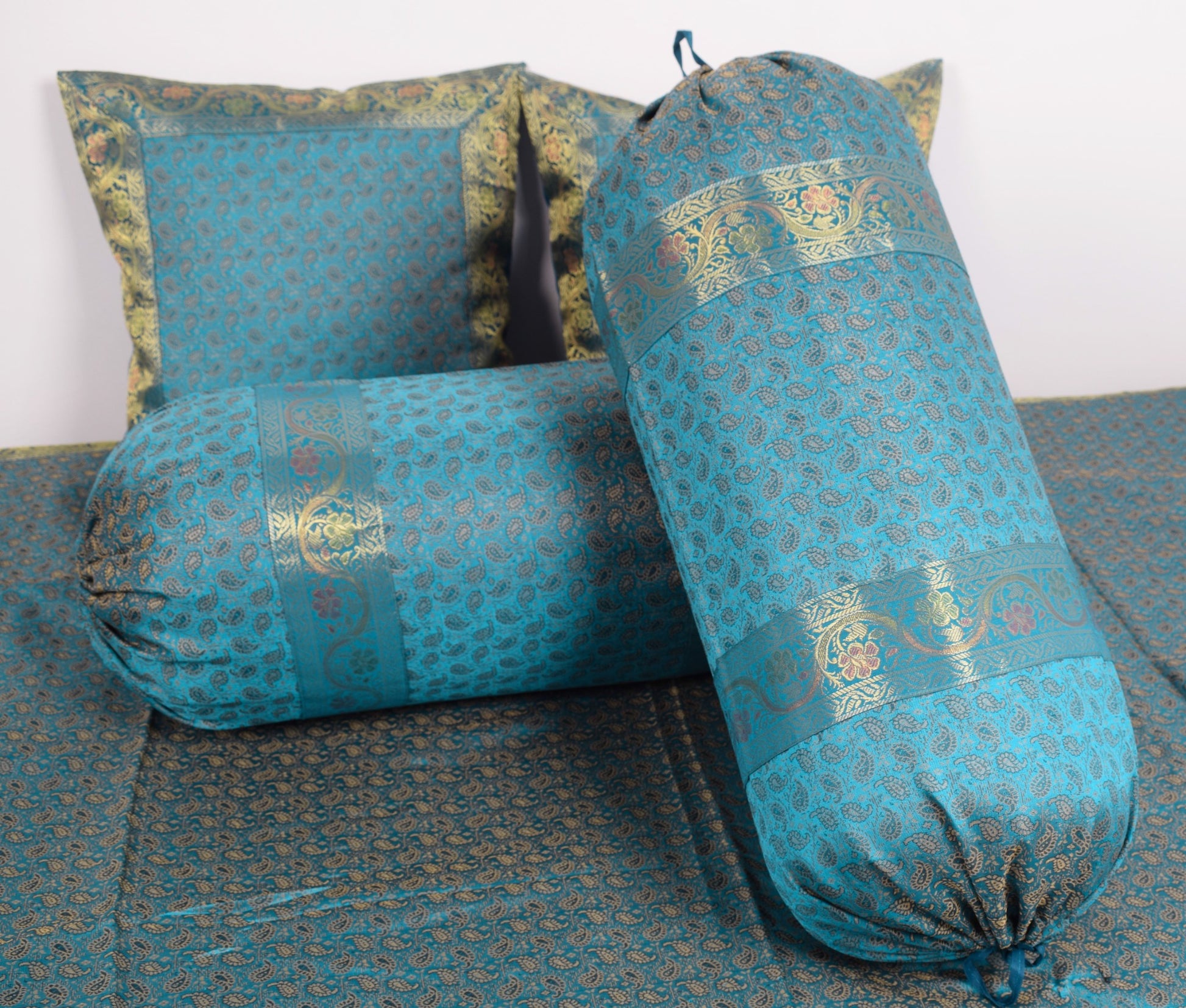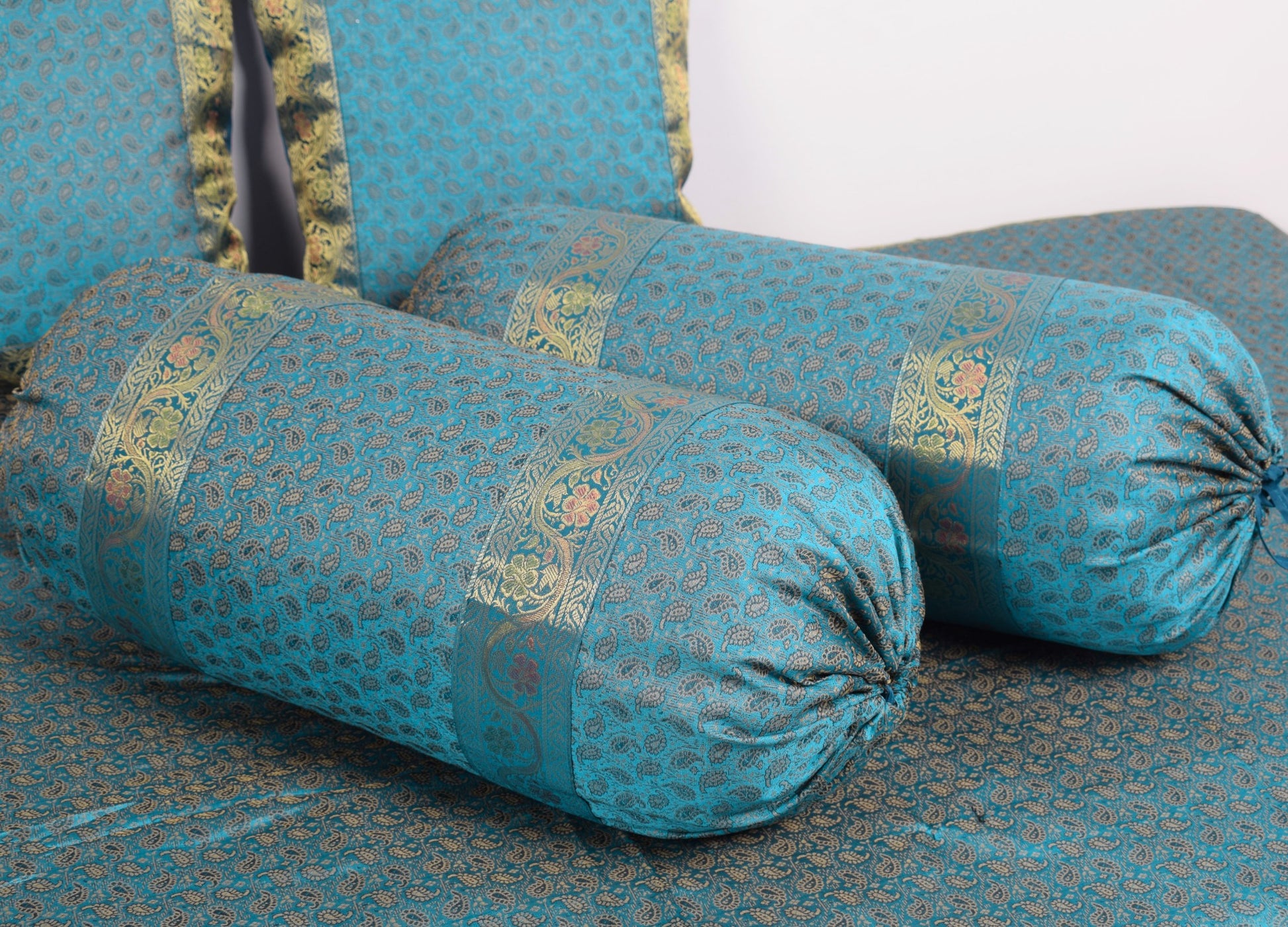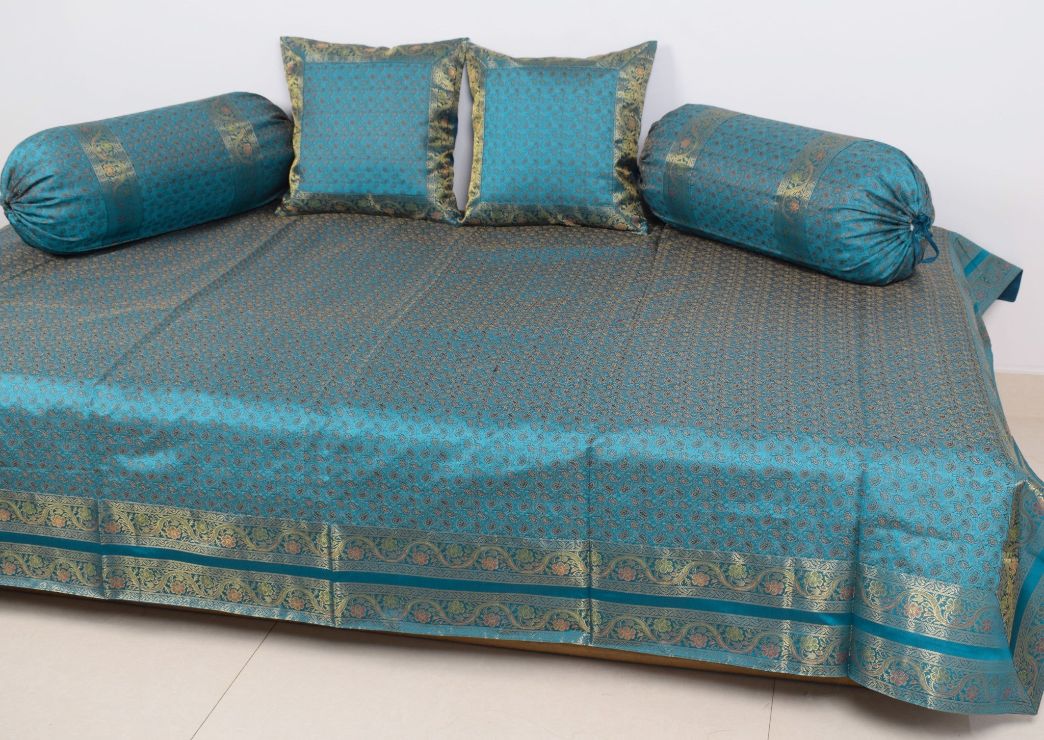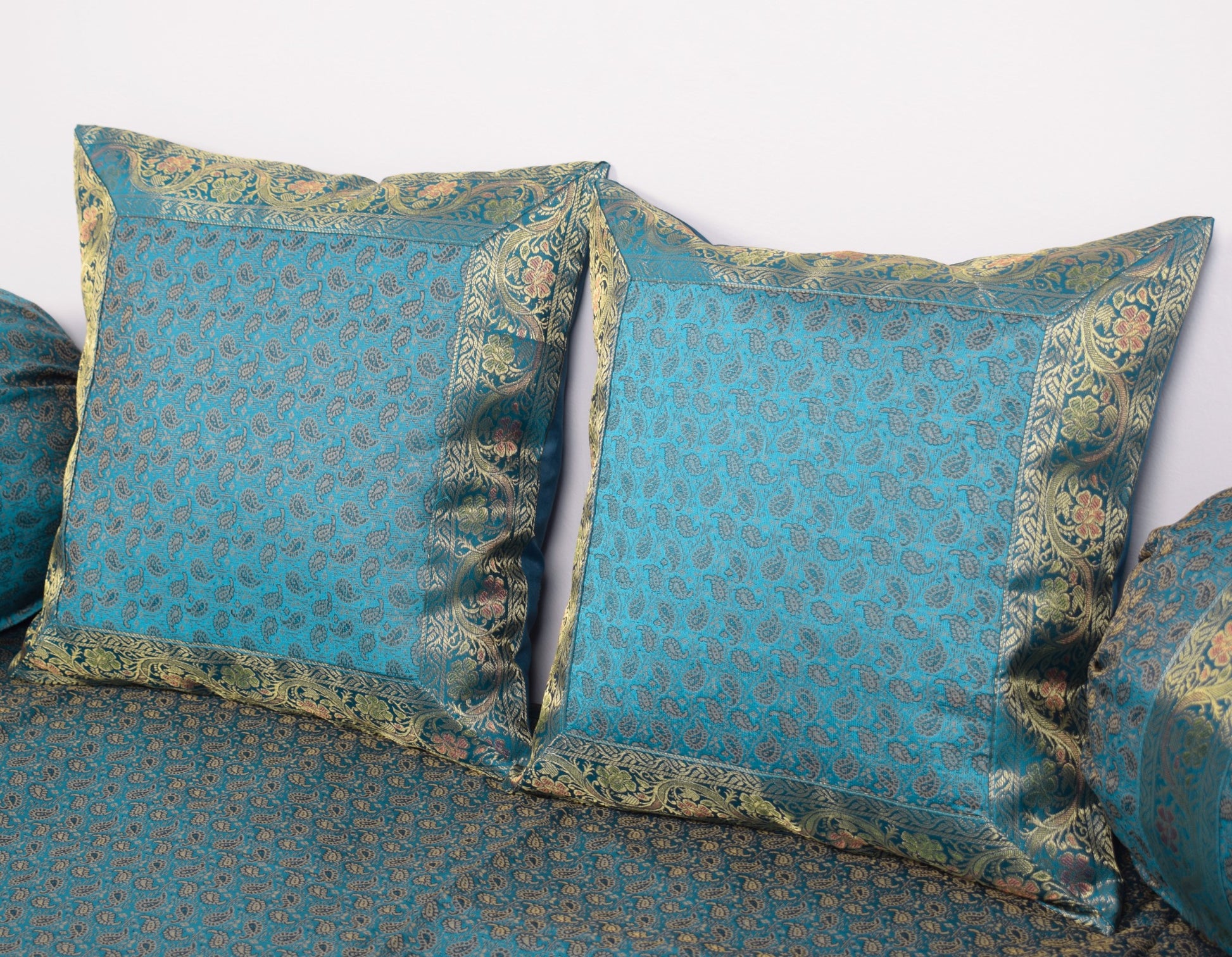 Turquoise Blue Banarasi Diwan Set – Silk Zari Brocade Cushion & Bolster Covers