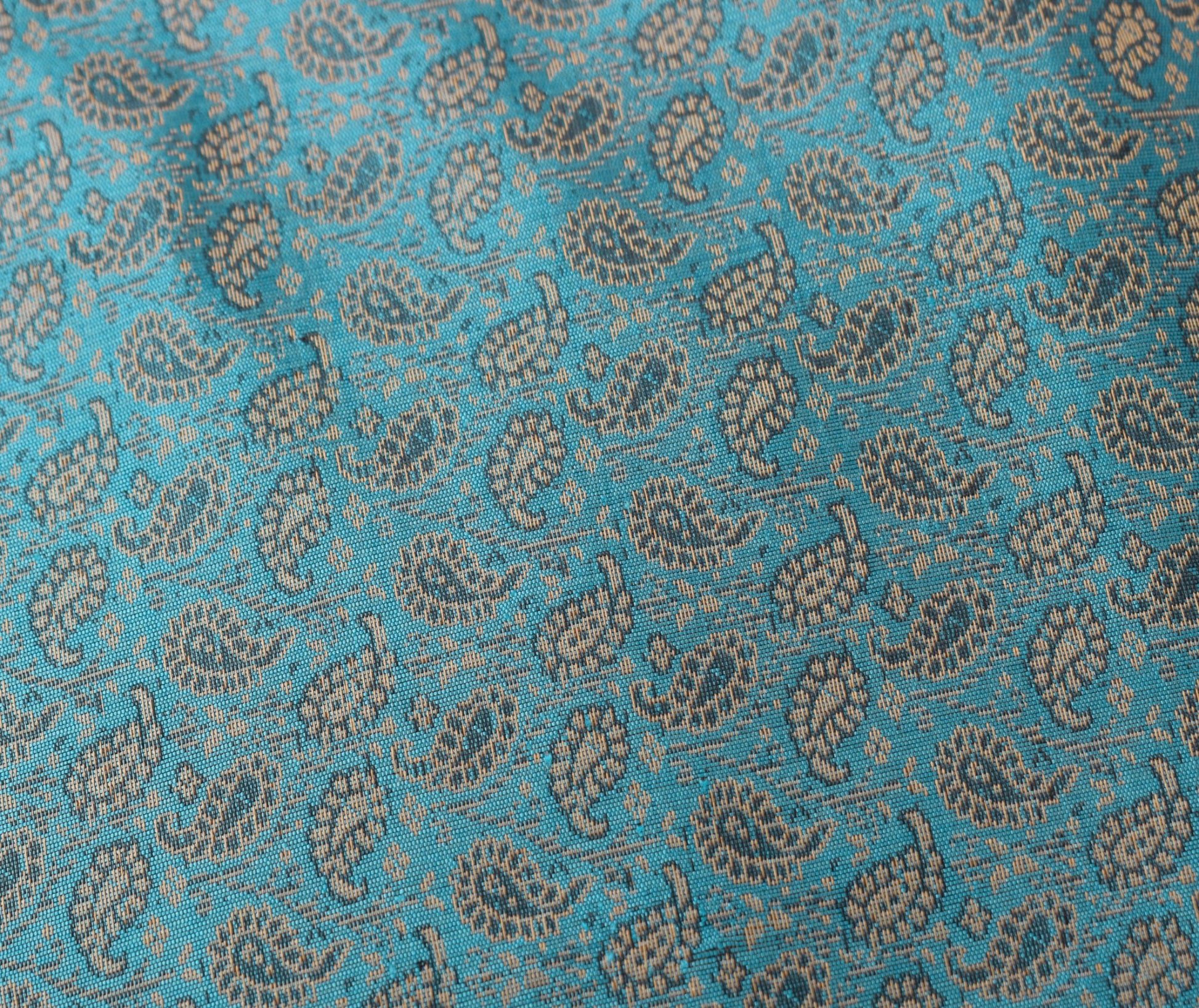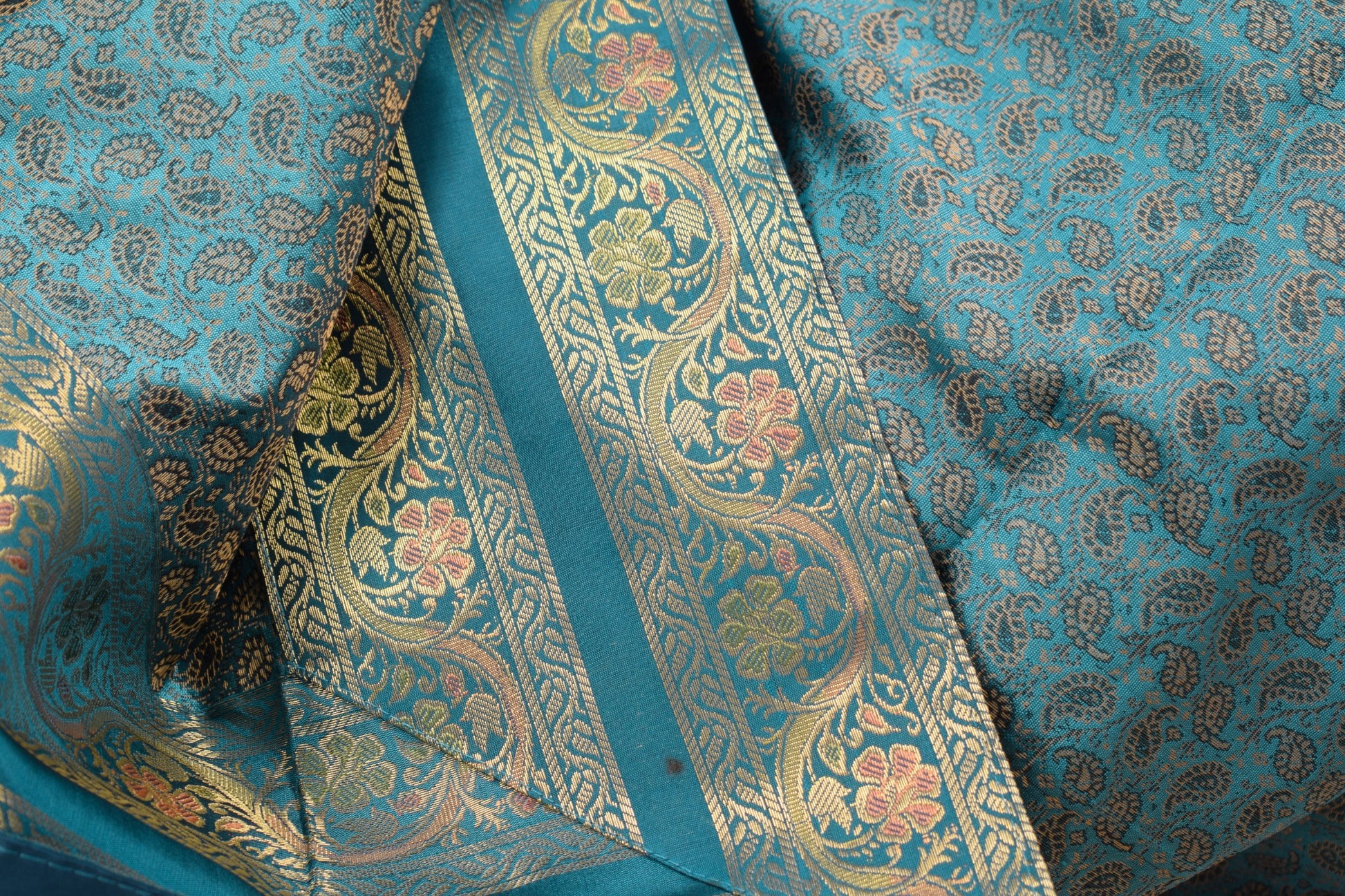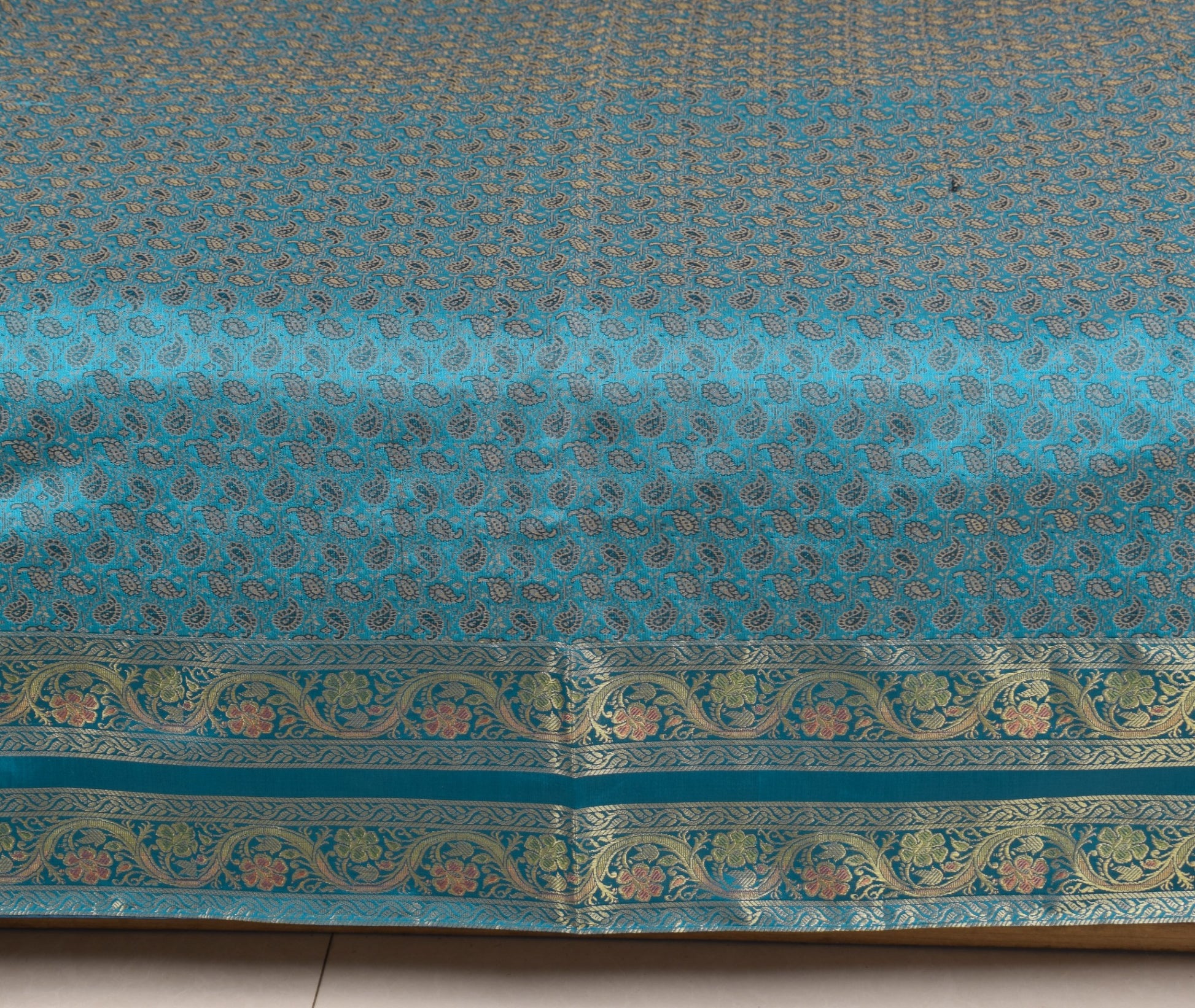 This is a Patch Work Diwan Set in Art Silk Fabric with all side Banarasi Silk Woven Golden Zari Brocade Border, this Diwan Set comes with Matching color Back lining fabric with Hidden Zip which allow you to insert the Blanket in Bed Cover and Pillow in the Cushion Cover & Bolster Cover . The base color of the cover is Turquoise Blue Color Border & Art or Artificial Silk fabric.