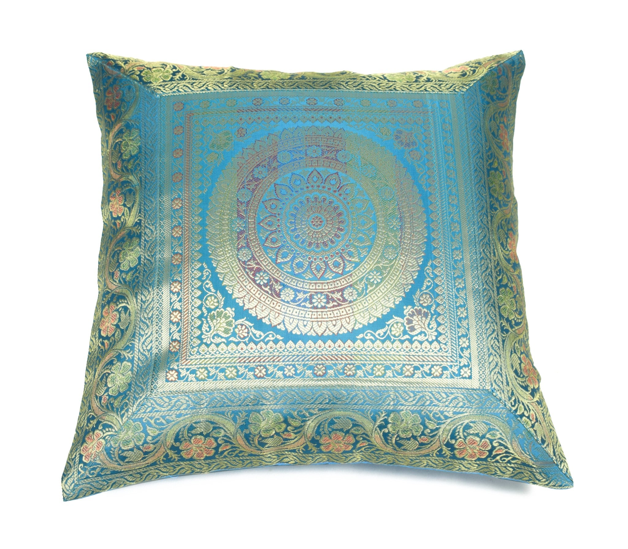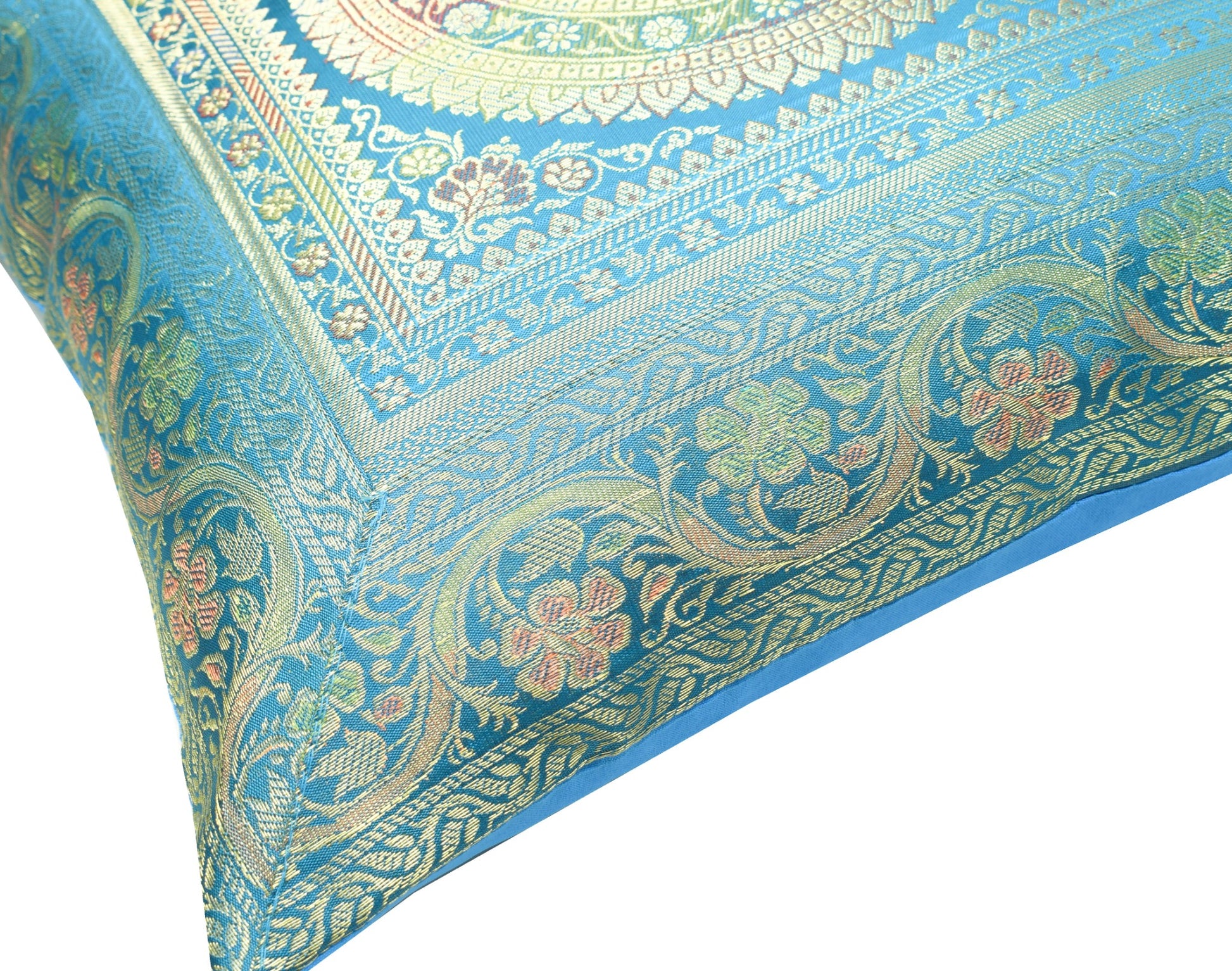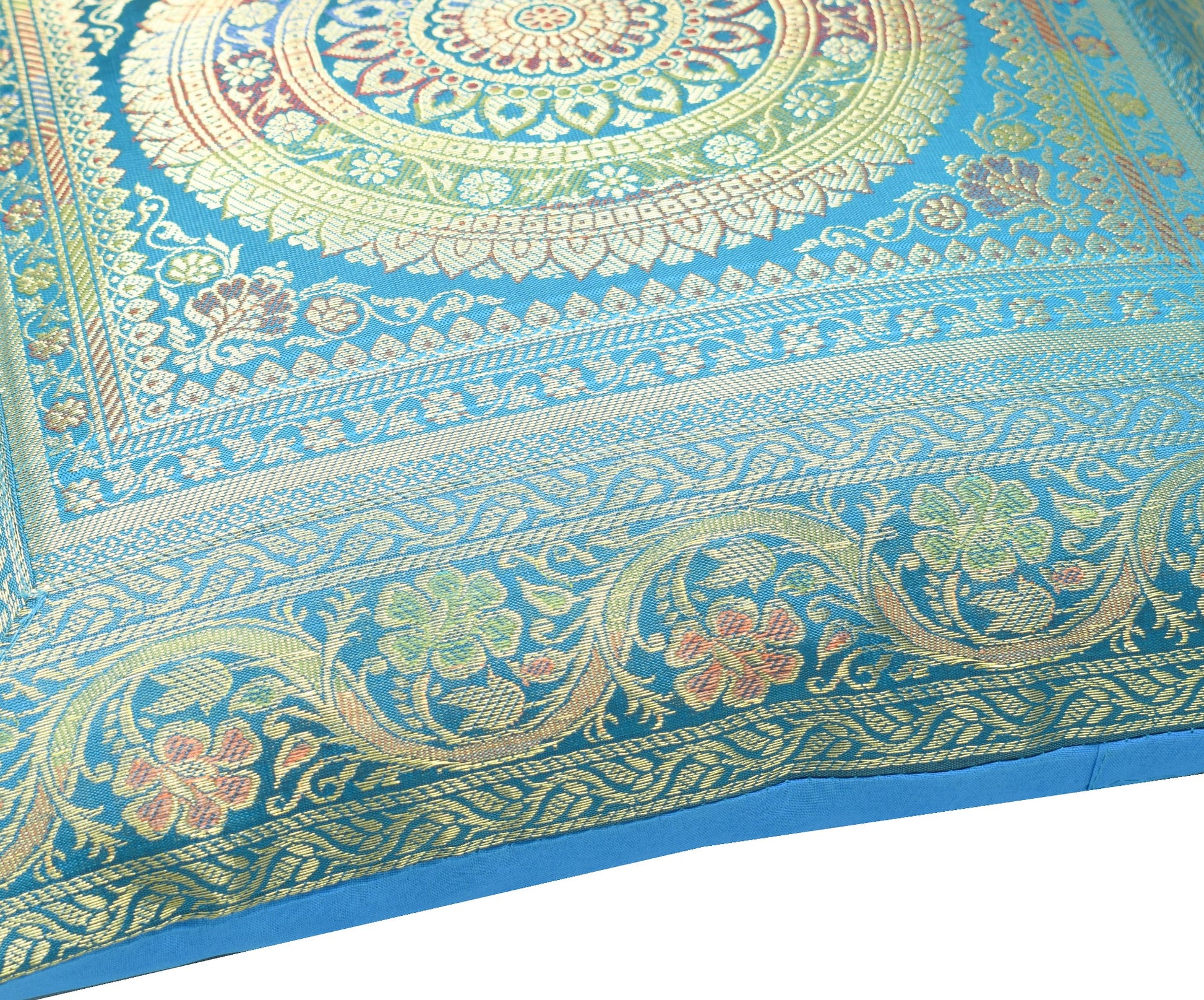 Turquoise Blue Banarasi Silk Cushion Cover 16x16 Featuring Woven Zari Mandala