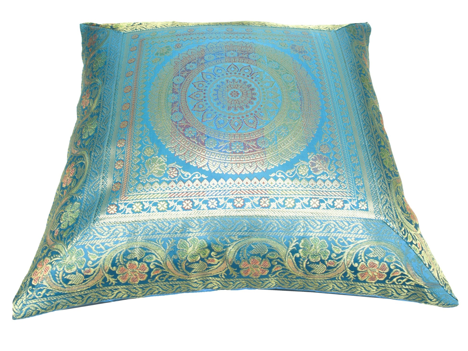 Banarasi Vastra Presents Indian Art Silk Woven Zari Brocade Banarasi Cushion Pillow Cover in Mandala Pattern in the centre Part of the cover with all 4 Side Floral Zari Woven Border. this Cover comes with Matching color Back lining fabric with Hidden Zip which allow you to insert the Cushion Pillow. The base color of the cover is Turquoise Blue.