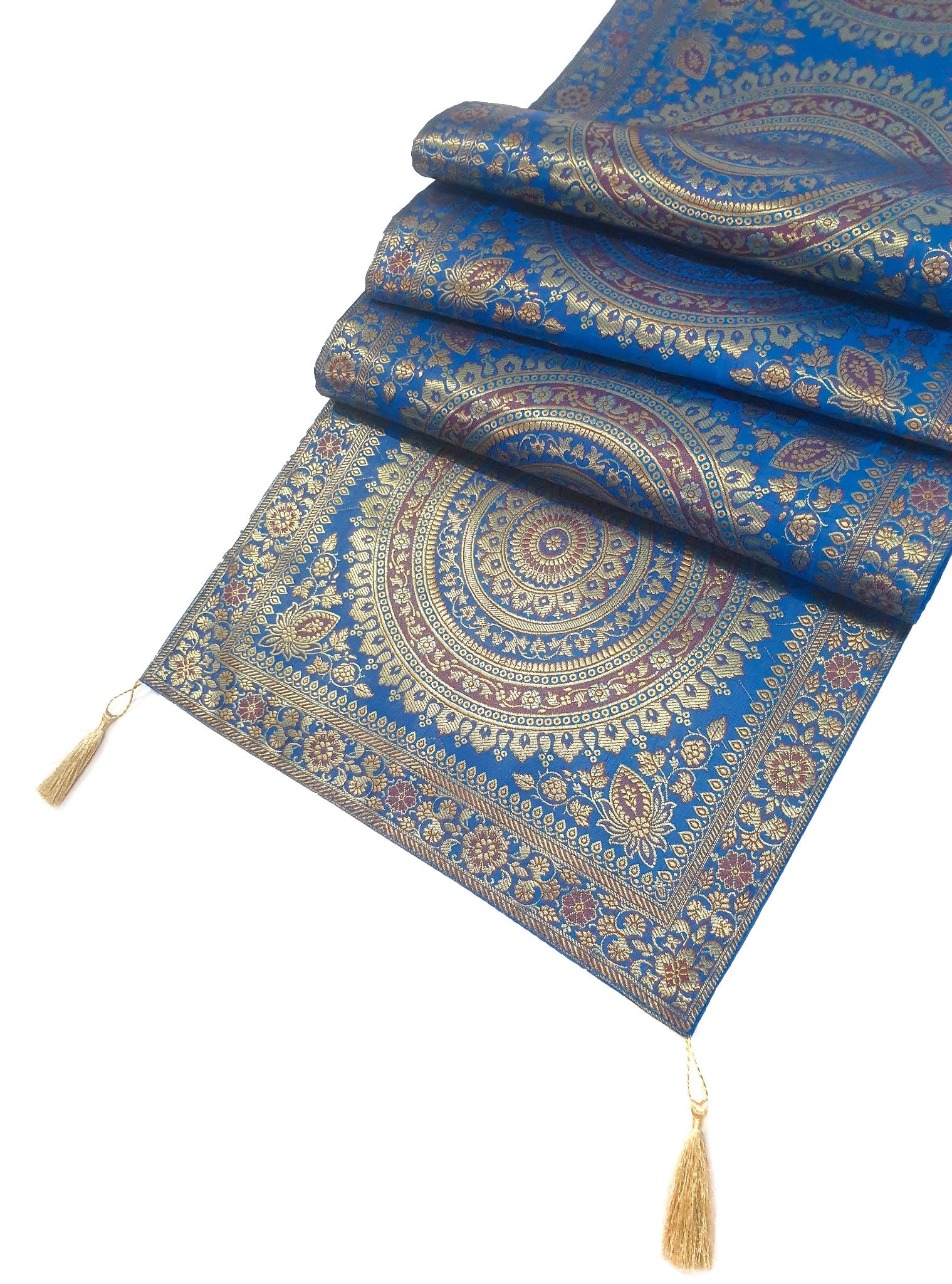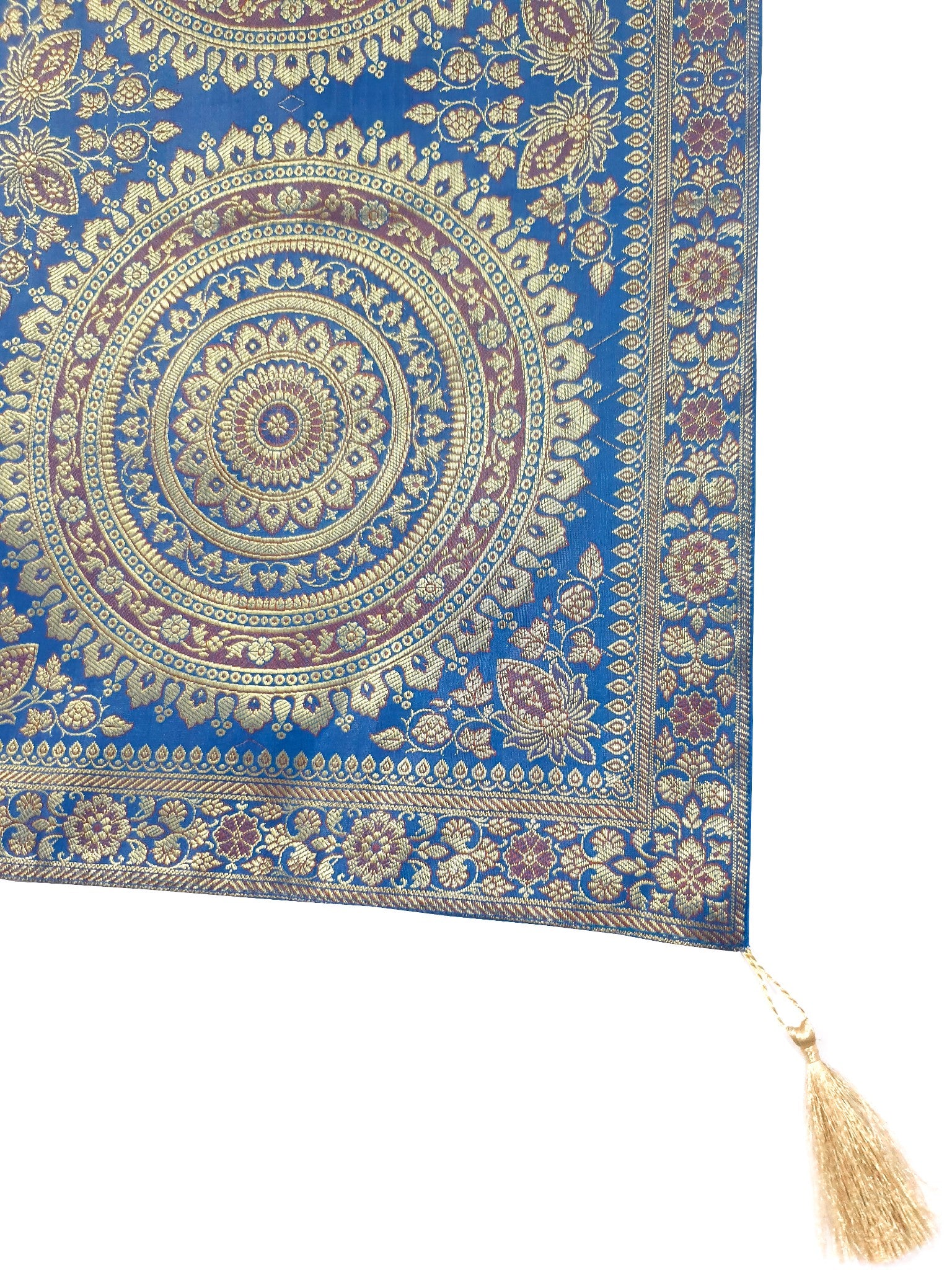 Banarasi Vastra Presents 16 Inch x 72 Inch Woven Golden Zari Brocade Banarasi Silk Table Runner with Woven Mandala Pattern Tanchoi Fabric in the center Part of the cover with all Side Floral Zari Woven Border with 4 side Golden Zari Tassel. this Runner comes with Matching color Back lining fabric.