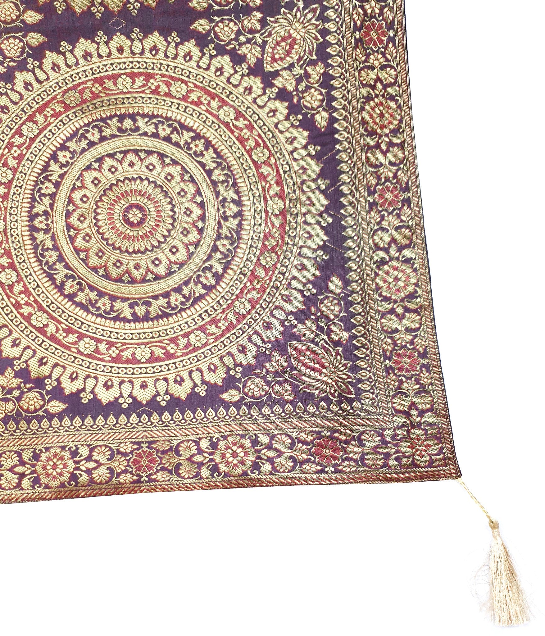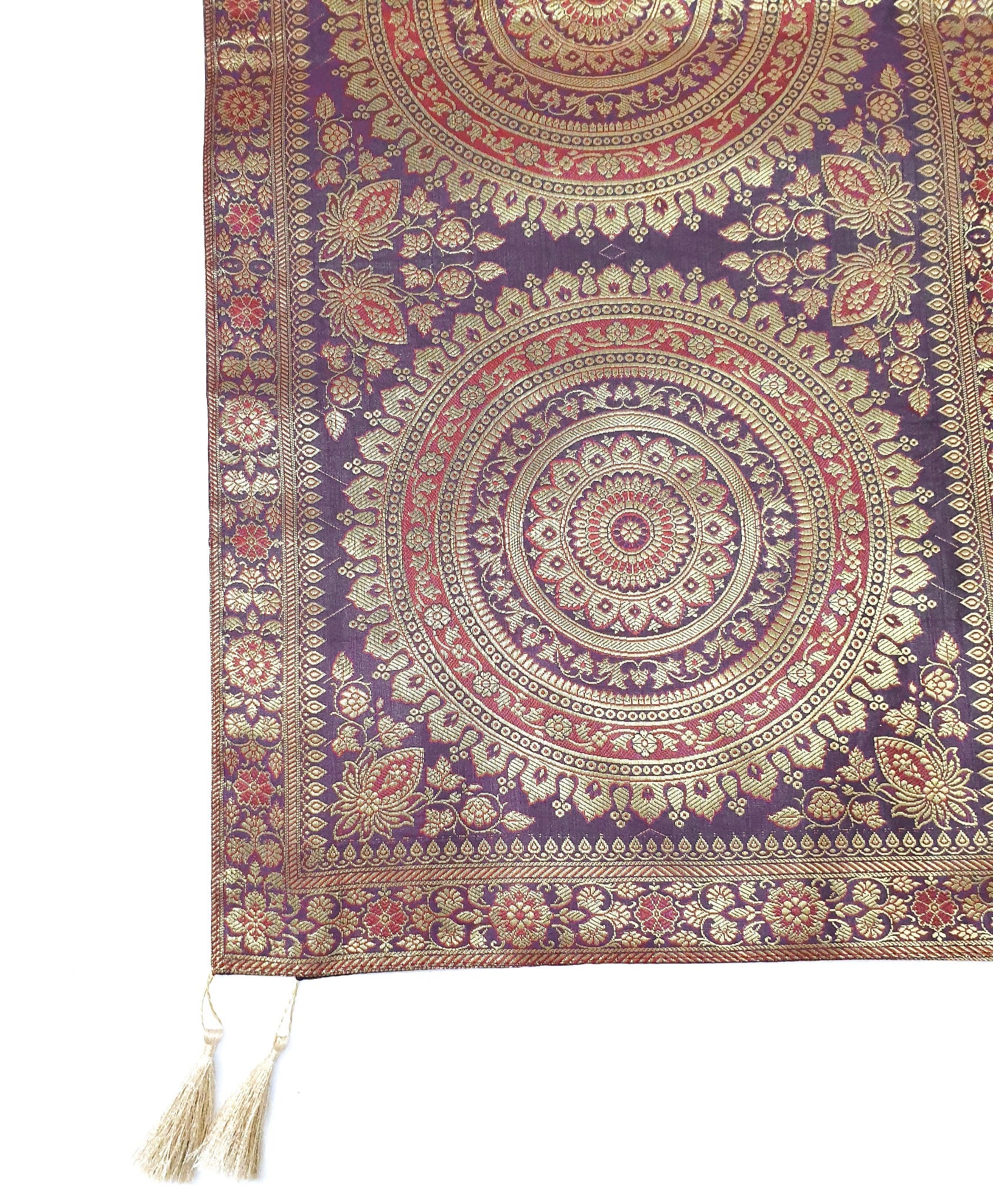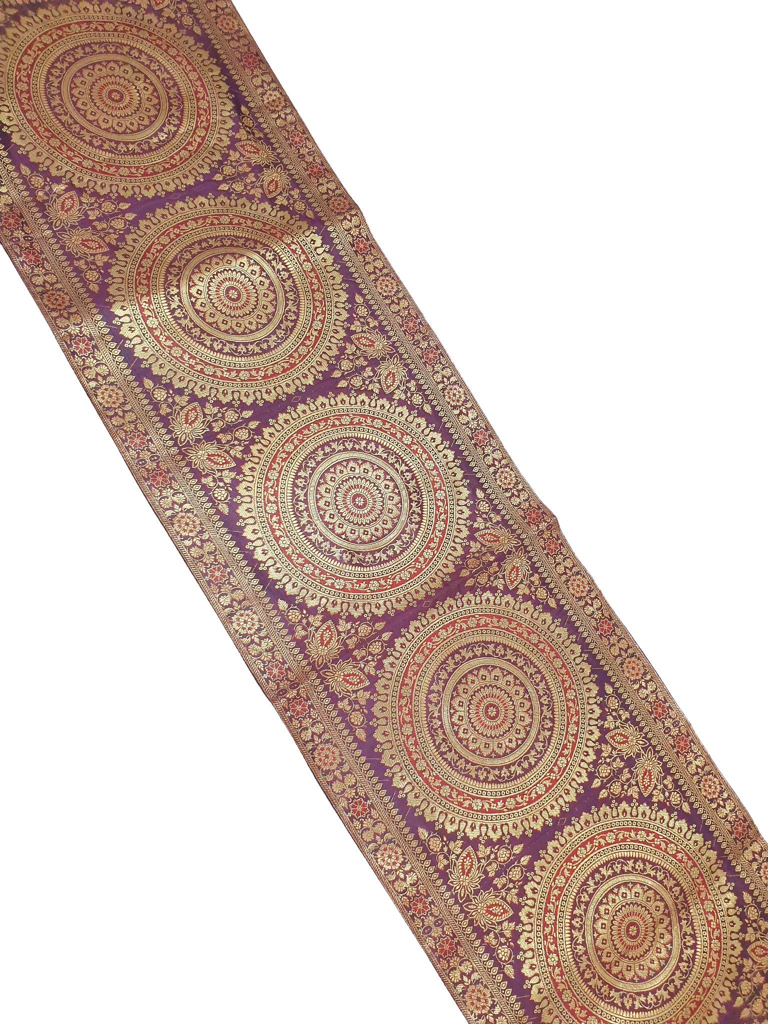Banarasi Vastra Presents 16 Inch x 72 Inch Woven Golden Zari Brocade Banarasi Silk Table Runner with Woven Mandala Pattern Tanchoi Fabric in the center Part of the cover with all Side Floral Zari Woven Border with 4 side Golden Zari Tassel. this Runner comes with Matching color Back lining fabric.