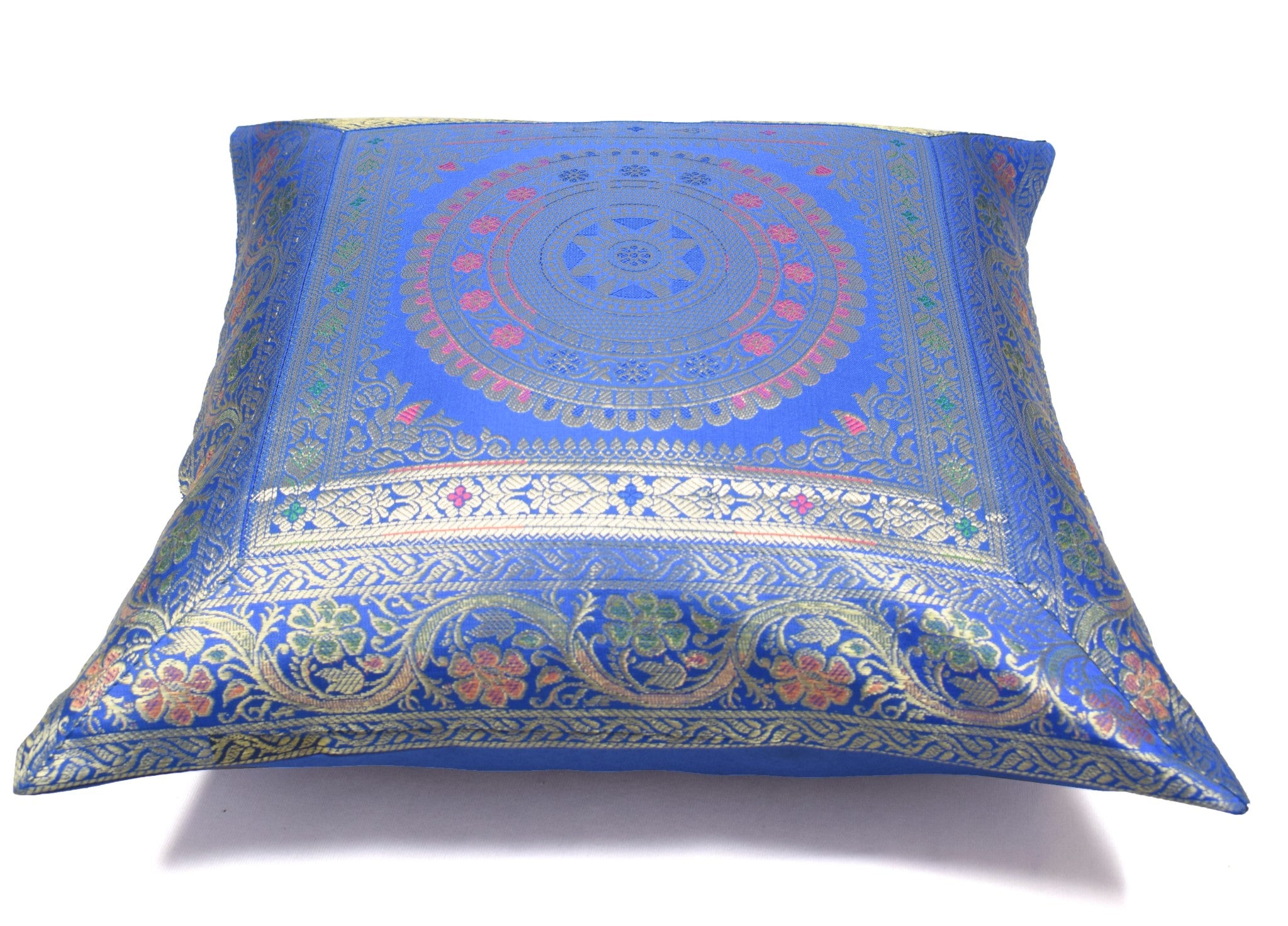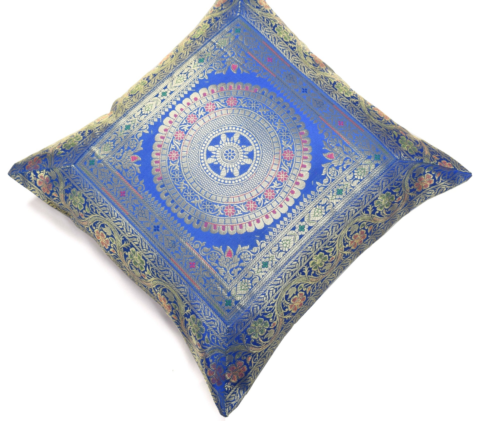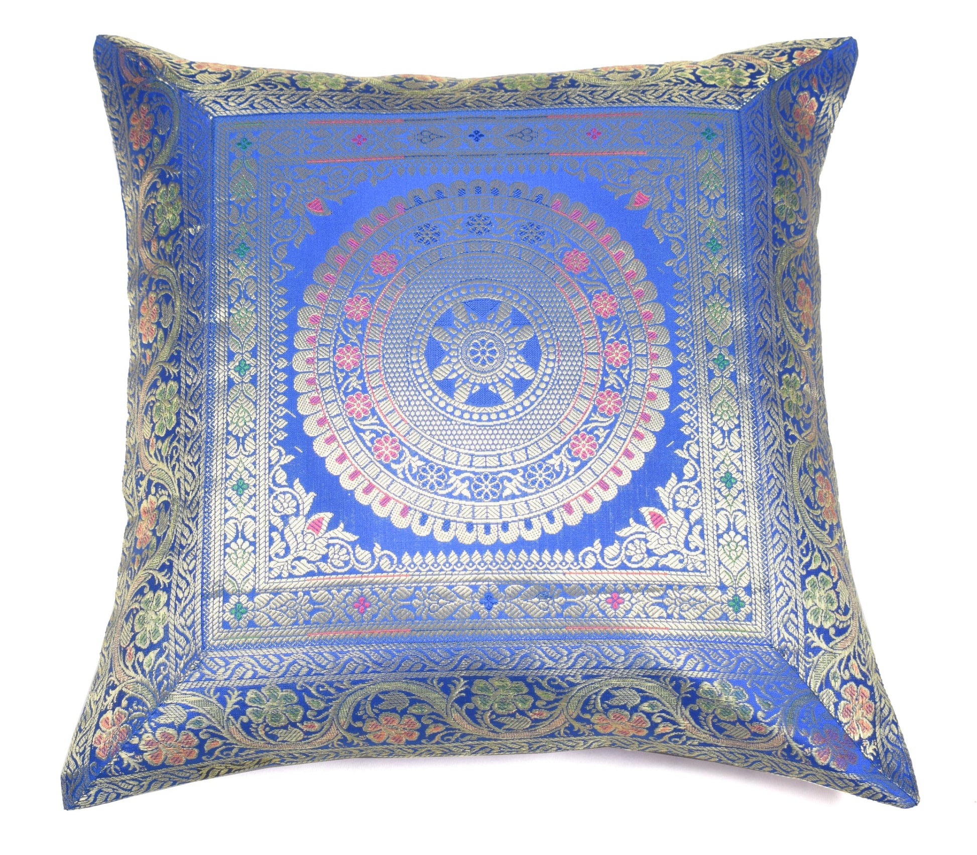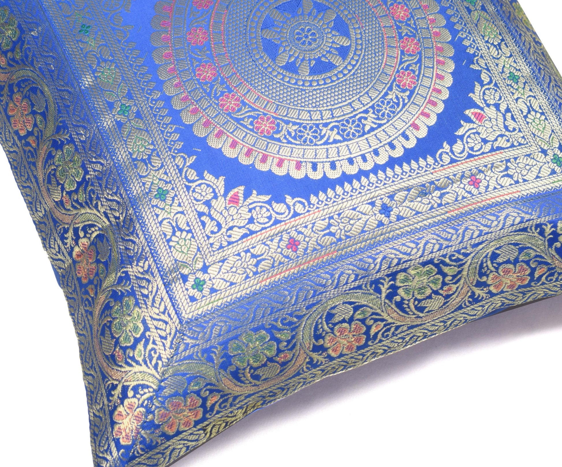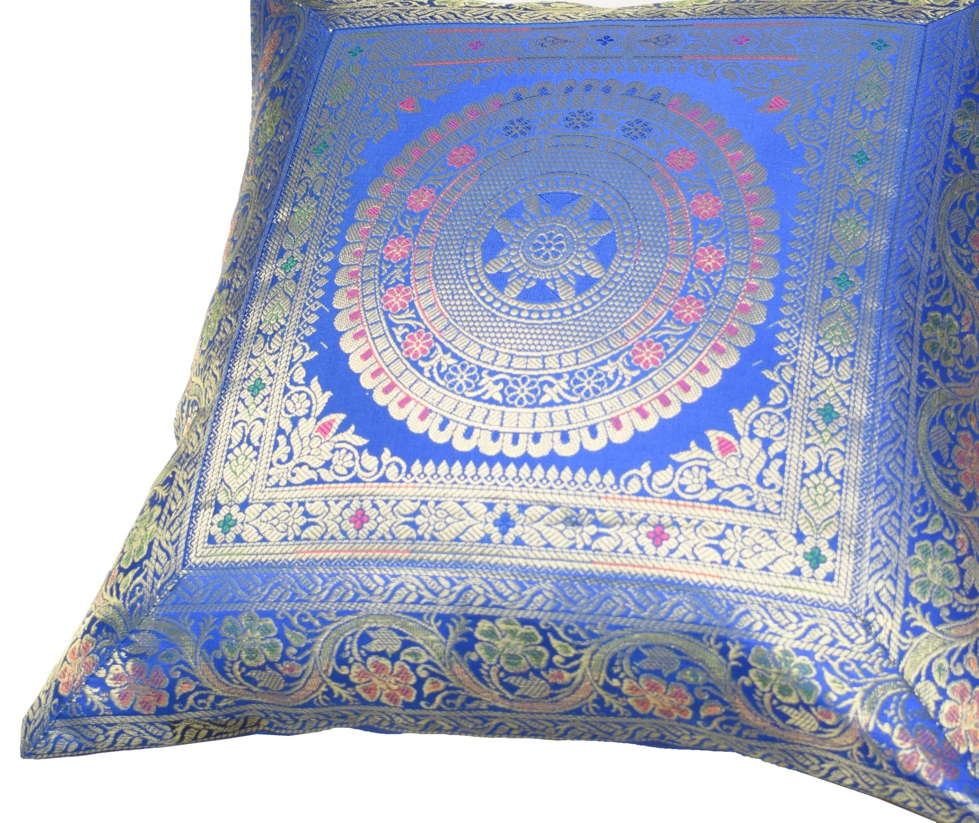 Banarasi Vastra Presents Indian Art Silk Woven Zari Brocade Banarasi Cushion Pillow Cover in Mandala Pattern in the centre Part of the cover with all 4 Side Floral Zari Woven Border. this Cover comes with Matching color Back lining fabric with Hidden Zip which allow you to insert the Cushion Pillow. The base color of the cover is Blue.