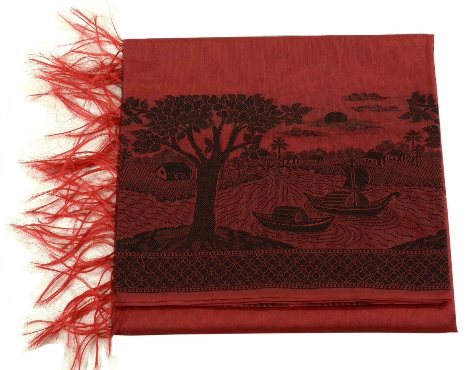 Woven Cotton Blend Indian Long Stole Banaras Ganga Ghat Dupatta Deep Red